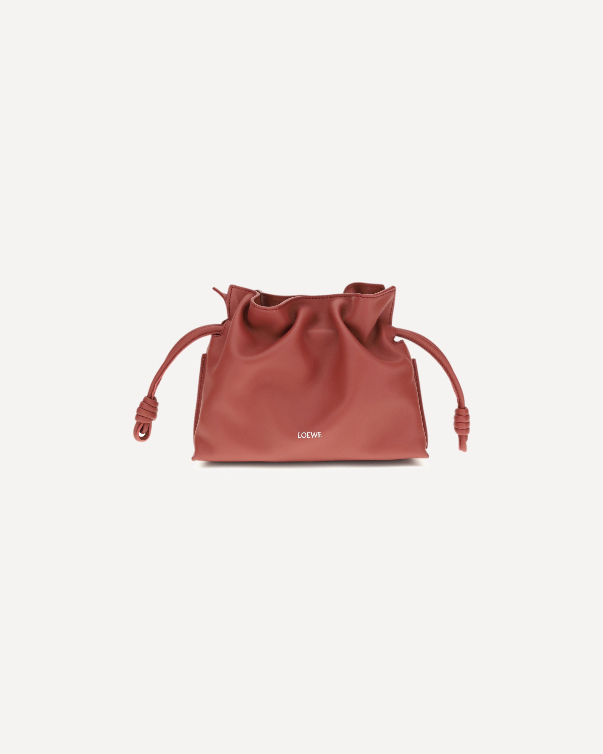The Loewe Flamenco mini leather Pouch Bag features a magnetic top closure, enriched by a drawstring with the characteristic spiral leather knots, which enhance its distinctive design. The flat leather shoulder strap is removable and adjustable, offering versatility in use. The iconic logo of the brand is pressure-printed on the front, adding an elegant touch. The interior is a single compartment, perfect for carrying essentials. A sophisticated and practical accessory, perfect for any occasion.
