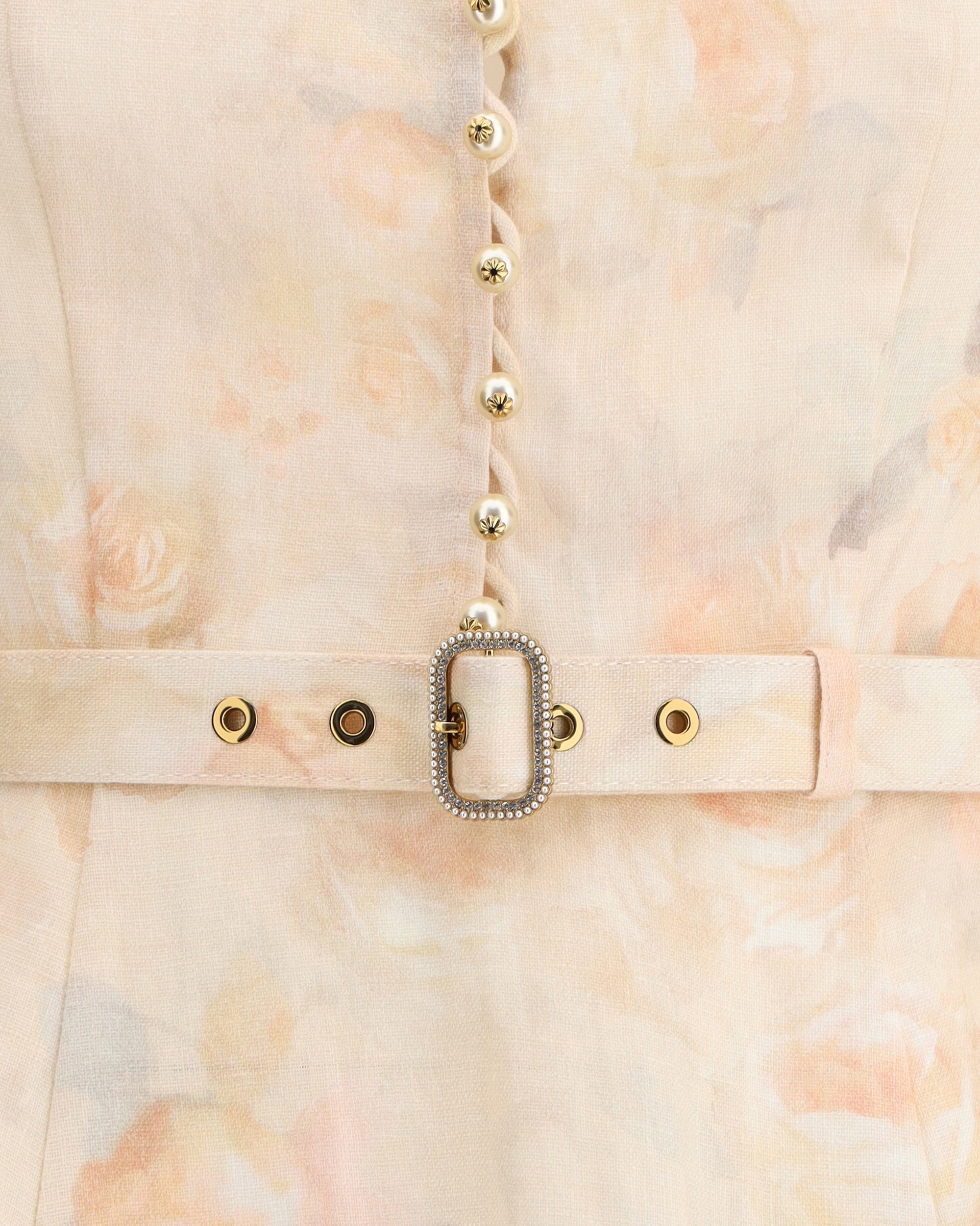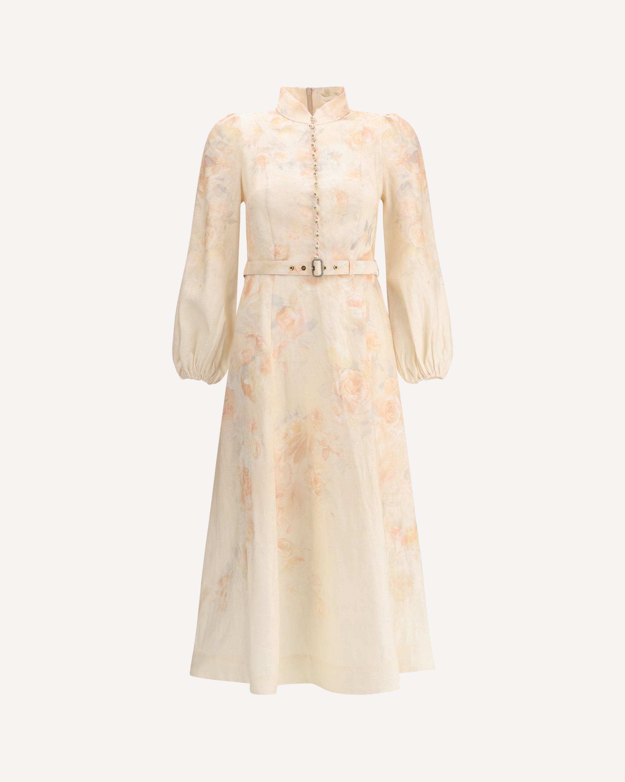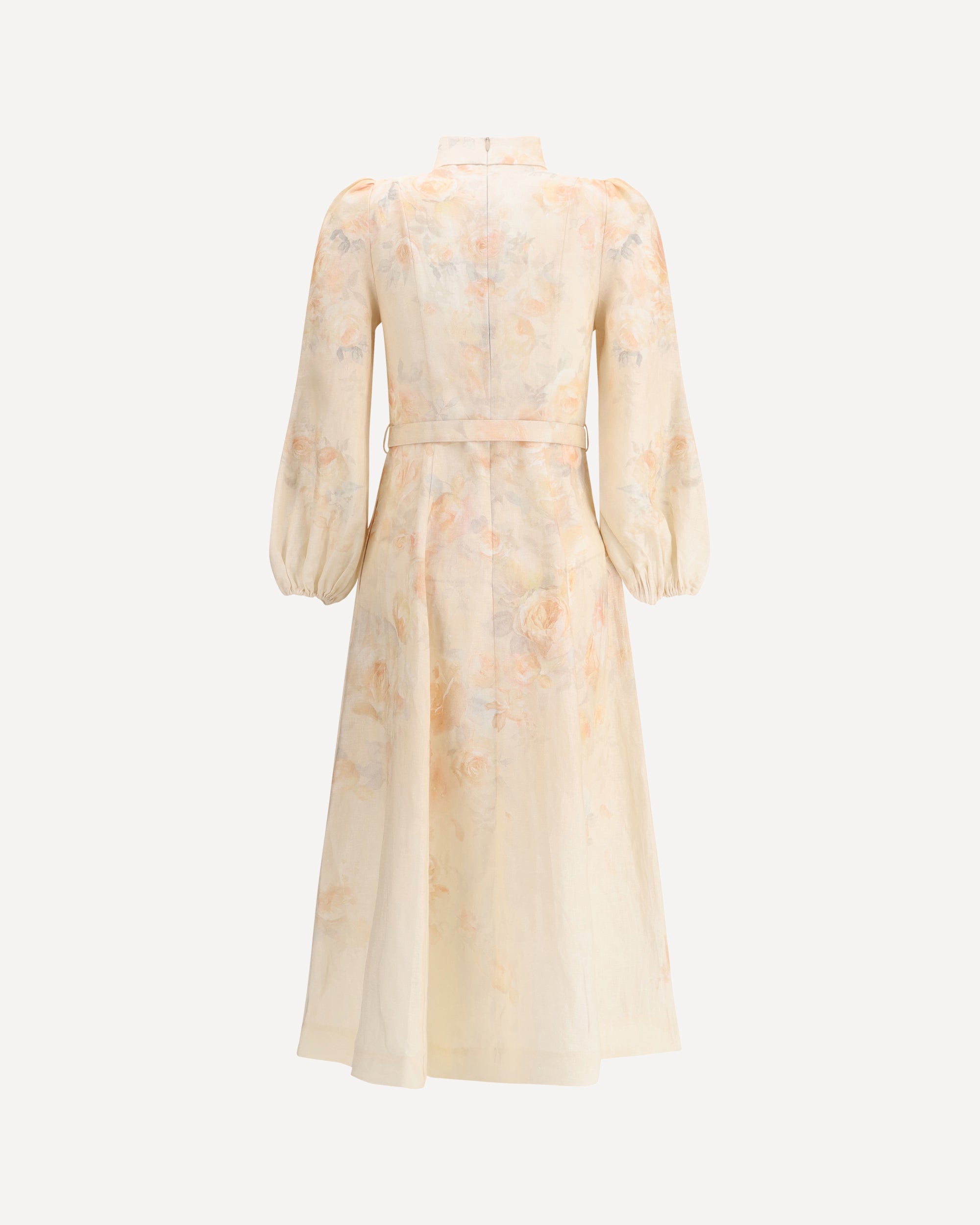 Zimmermann's floral Long Dress is an elegant and romantic garment featuring a delicate floral design that enhances its appearance. The front closure at the bust with pearl buttons adds a touch of sophistication, while the built-in adjustable belt accentuates the silhouette, lending shape and definition. The buff shoulders and mandarin collar give a sophisticated and feminine look, while the elastic cuffs complete the design with a touch of comfort.