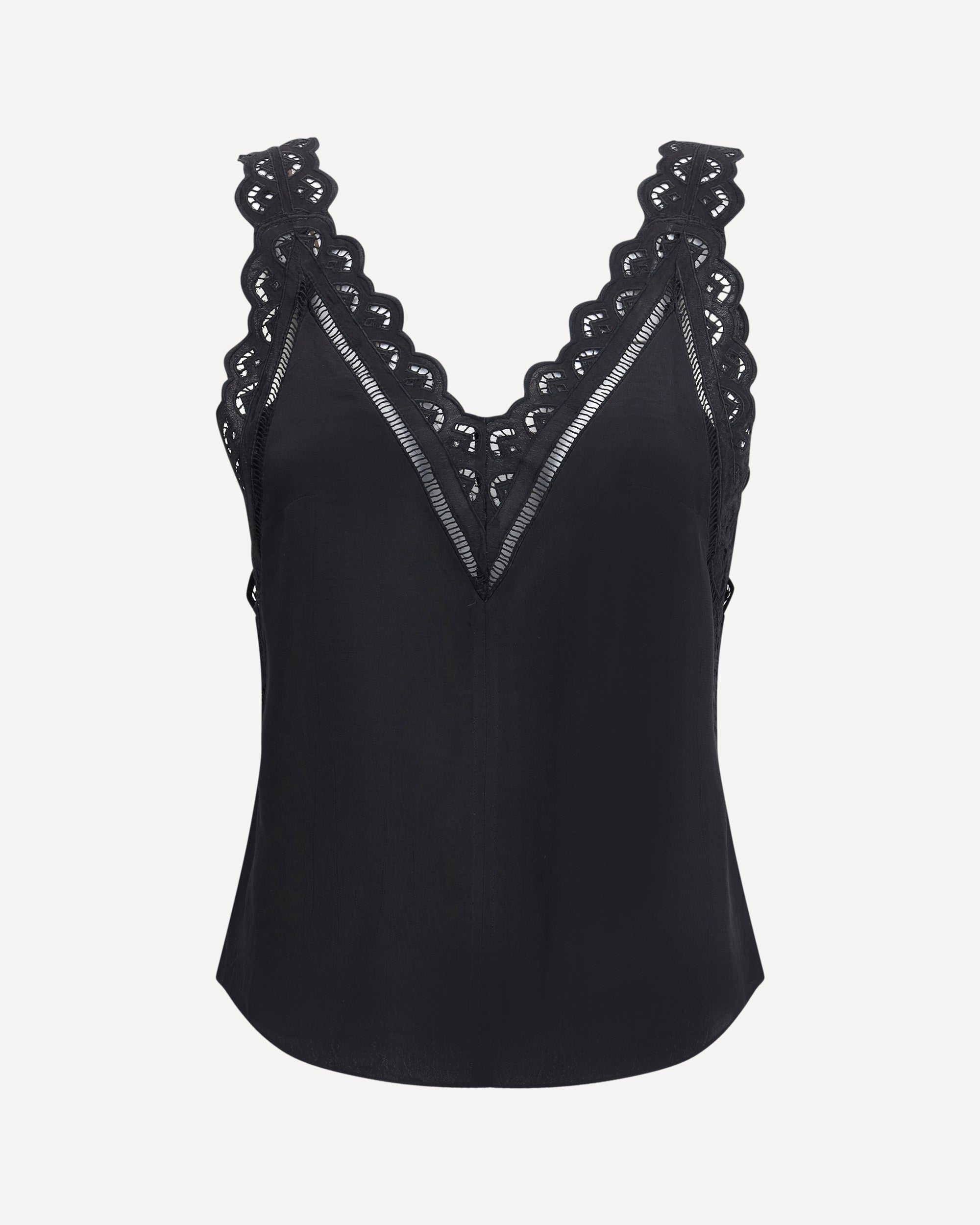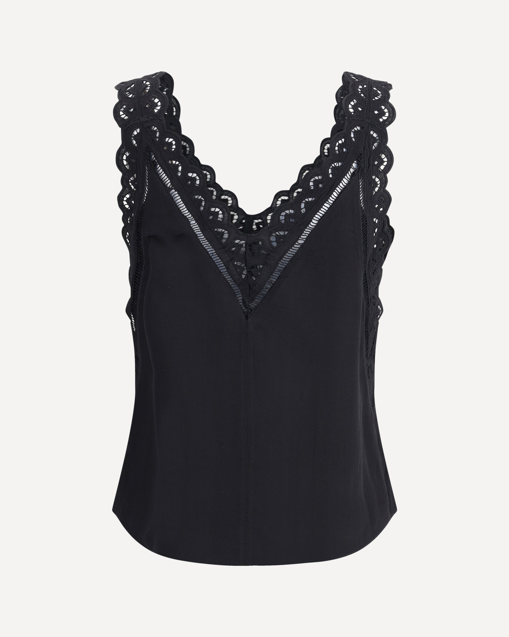 Isabel Marant's Fradella Top embodies boho-chic elegance with a light touch. Made of fine crepe, it offers a flowing, sophisticated silhouette. Thin straps and sangallo details add a romantic and delicate air. The crew neck opens into a figure-flattering V-neckline, while sangallo trim enhances the rounded hemline. The straight, flowing cut ensures a comfortable and versatile fit, perfect for a refined summer look.