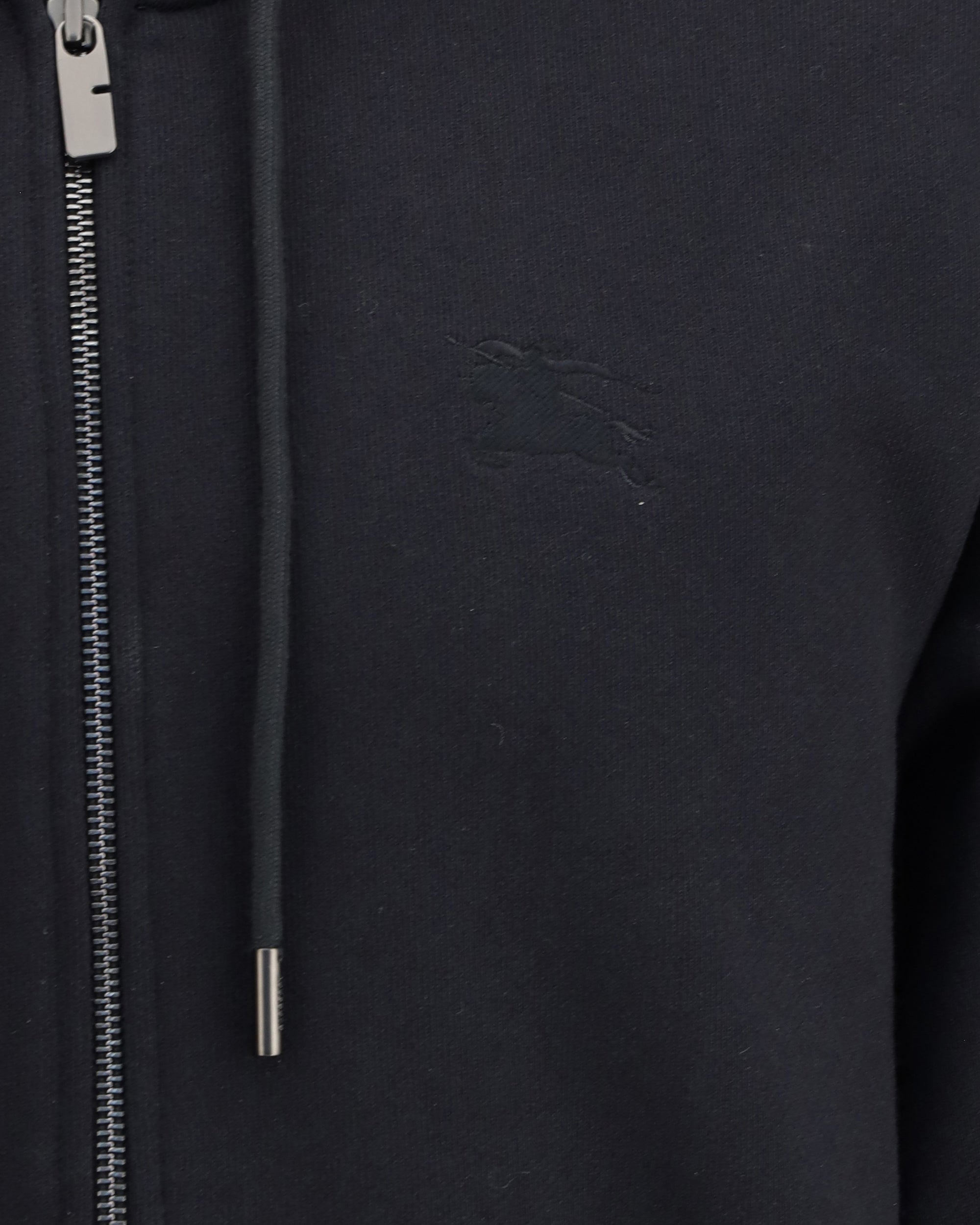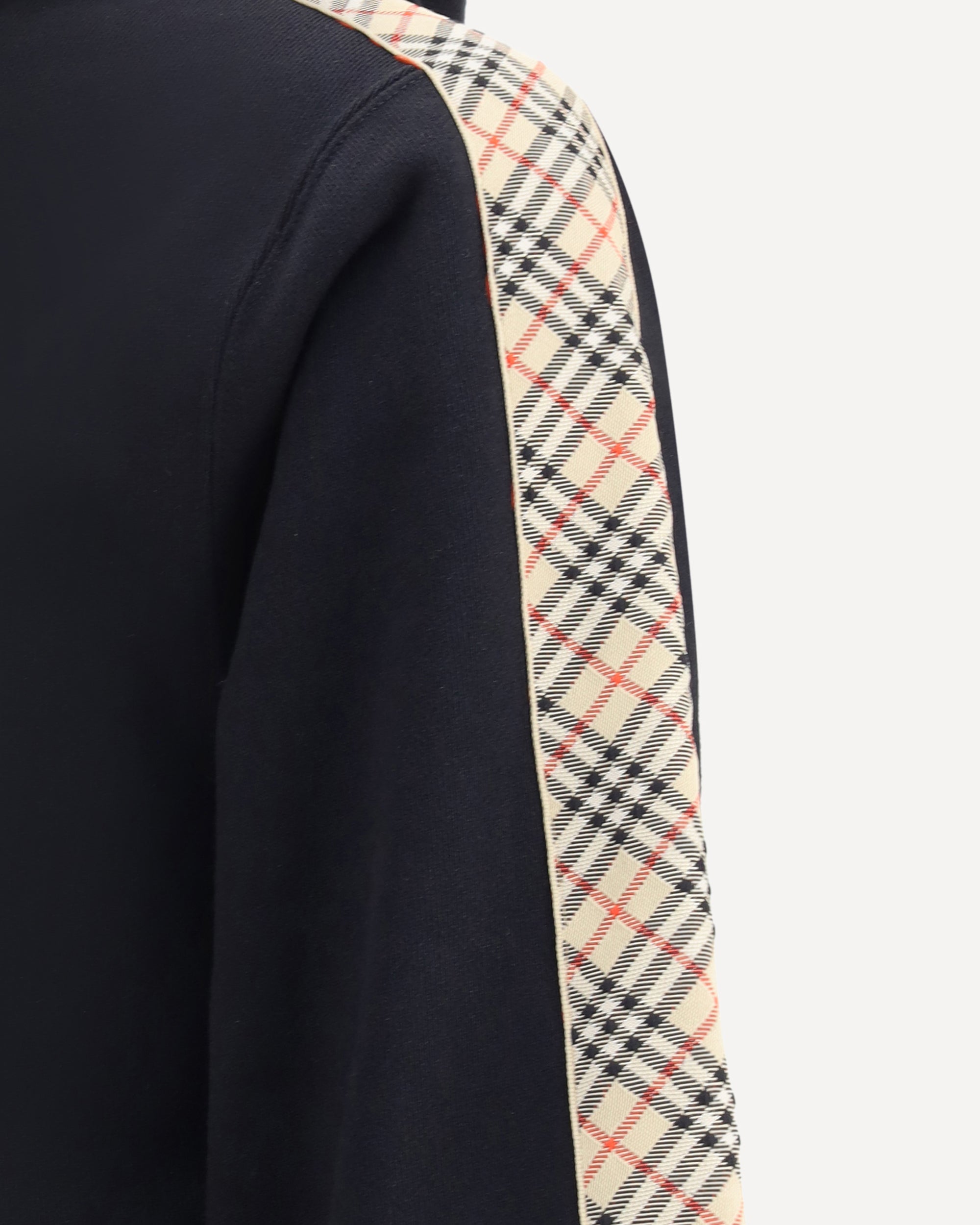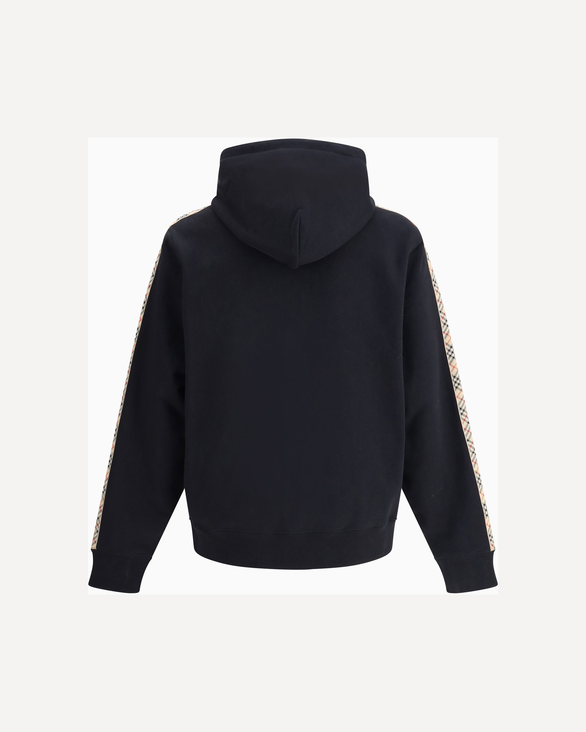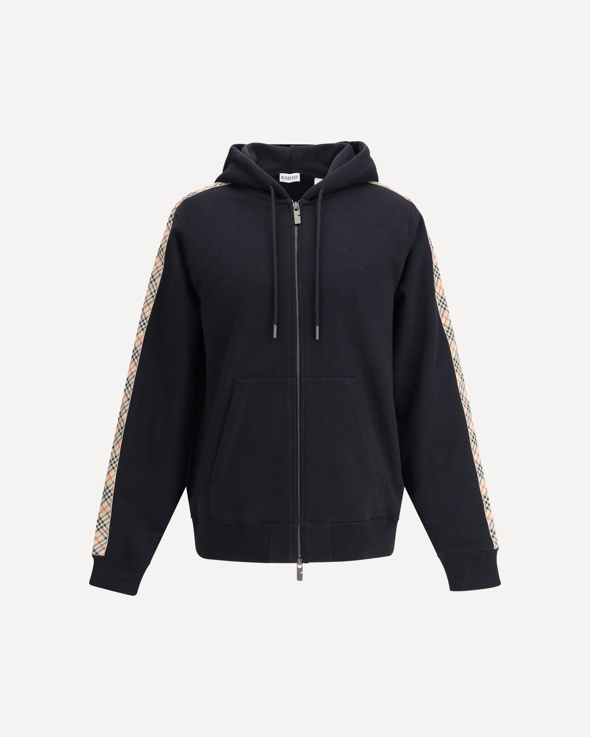 Burberry's Hoodie combines comfort and iconic style. With a zipper front closure, it features Check trim that echoes the brand's classic pattern. The adjustable drawstring hood offers practicality, while two patch pockets on the front and ribbed cuffs complete the functional design. The ribbed hem ensures a comfortable fit, making this sweatshirt a versatile garment with distinctive character.