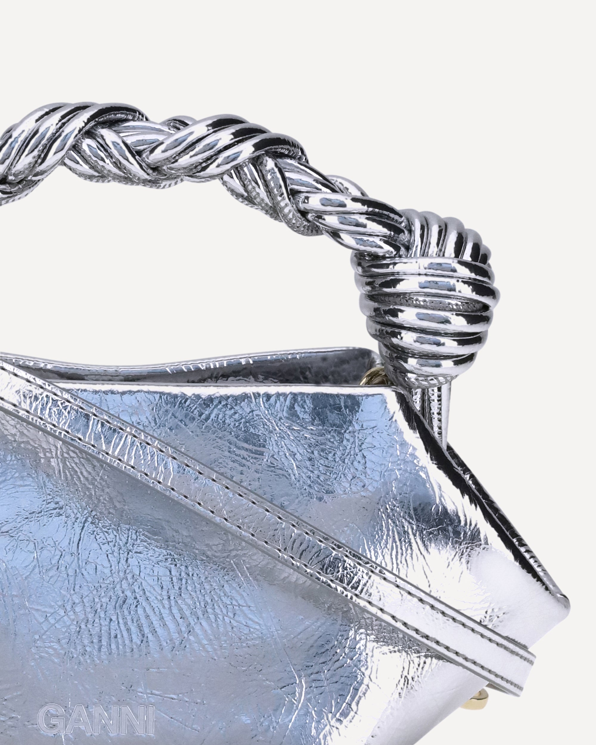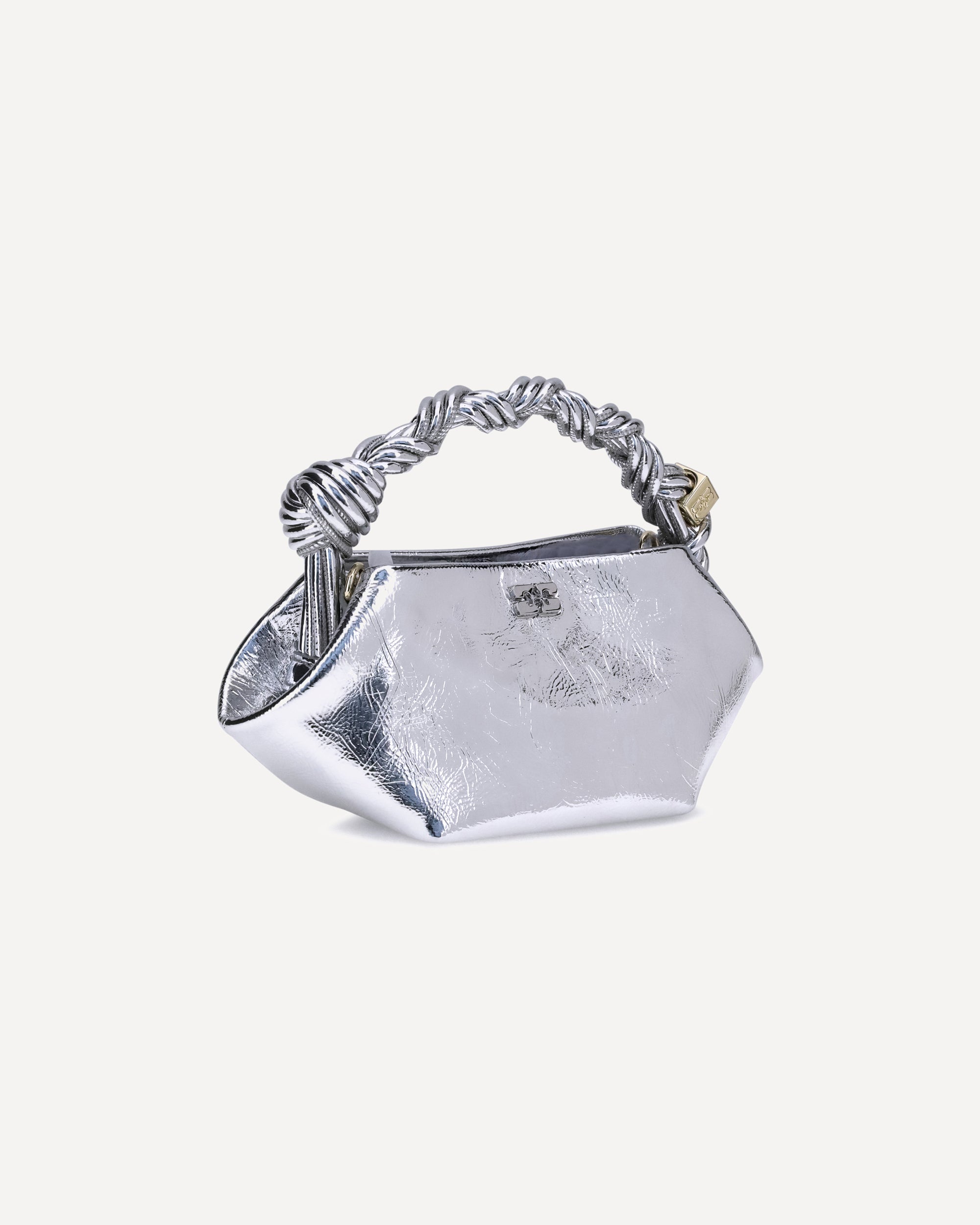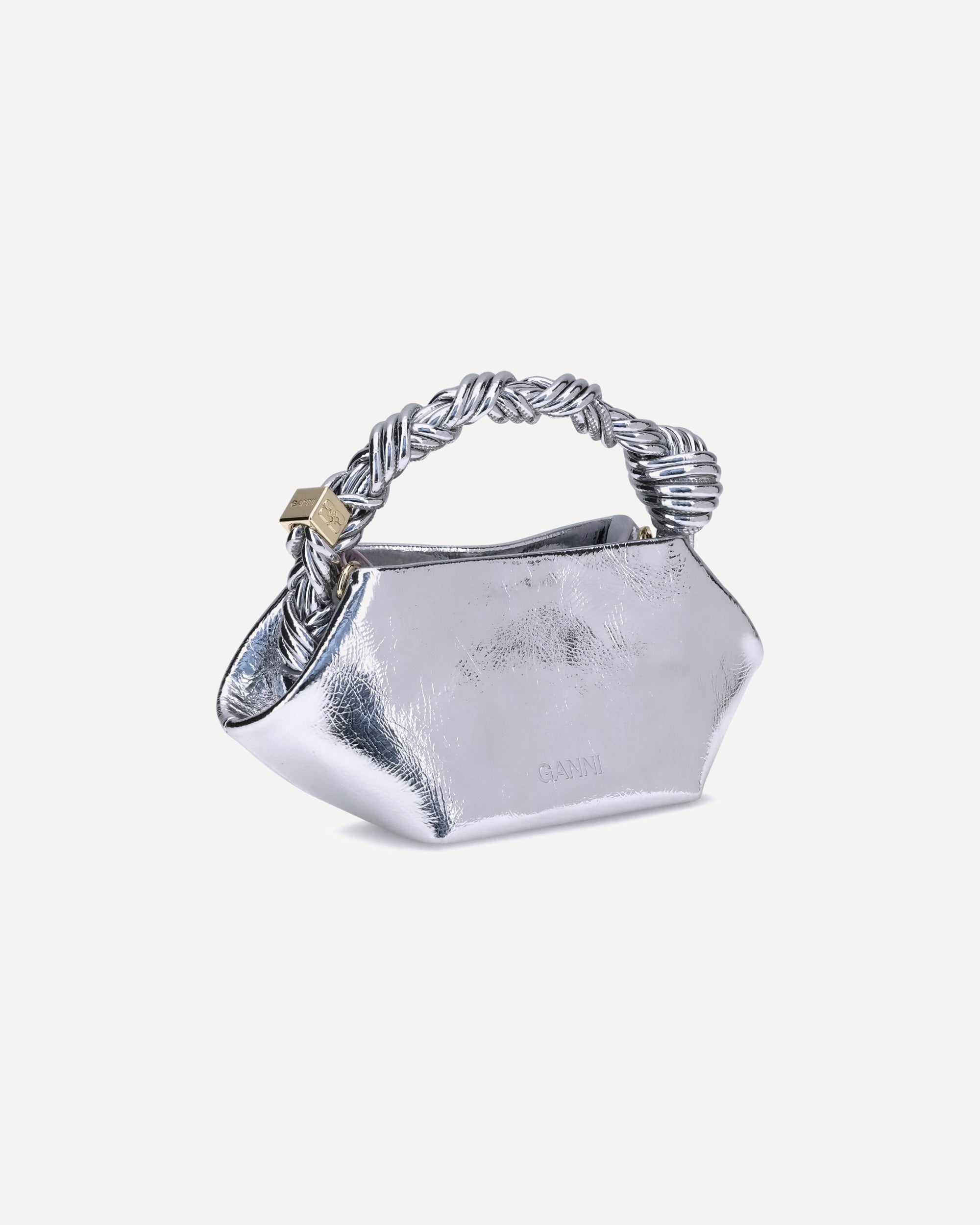 Ganni's Bou Handbag in metallic recycled leather is a contemporary interpretation of sustainable luxury. Featuring an adjustable and removable shoulder strap, it offers versatile wearability. The braided top handle with knot adds a touch of elegance, while metal dice with engraved logo and butterfly detail enrich the design with a distinctive touch. The magnetic button closure ensures practicality, while the single-compartment interior is perfect for storing essentials in style. An accessory that combines functionality and sustainability, ideal for any occasion.