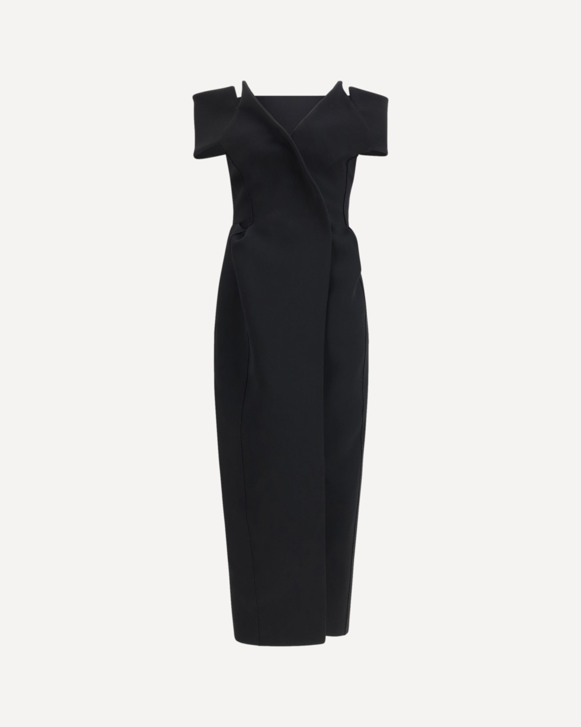The Gene Dress by Khaite embodies a sleek, sculptural elegance through a refined and modern silhouette. Tailored in double-faced Italian crepe with a matte finish, it features deconstructed lapels and raw-edge seaming that emphasize its asymmetric design. A subtle peplum effect is created through hand tacking at the sides and back, while threaded latch closures and a concealed zipper at the wrapped front complete the piece with understated sophistication.