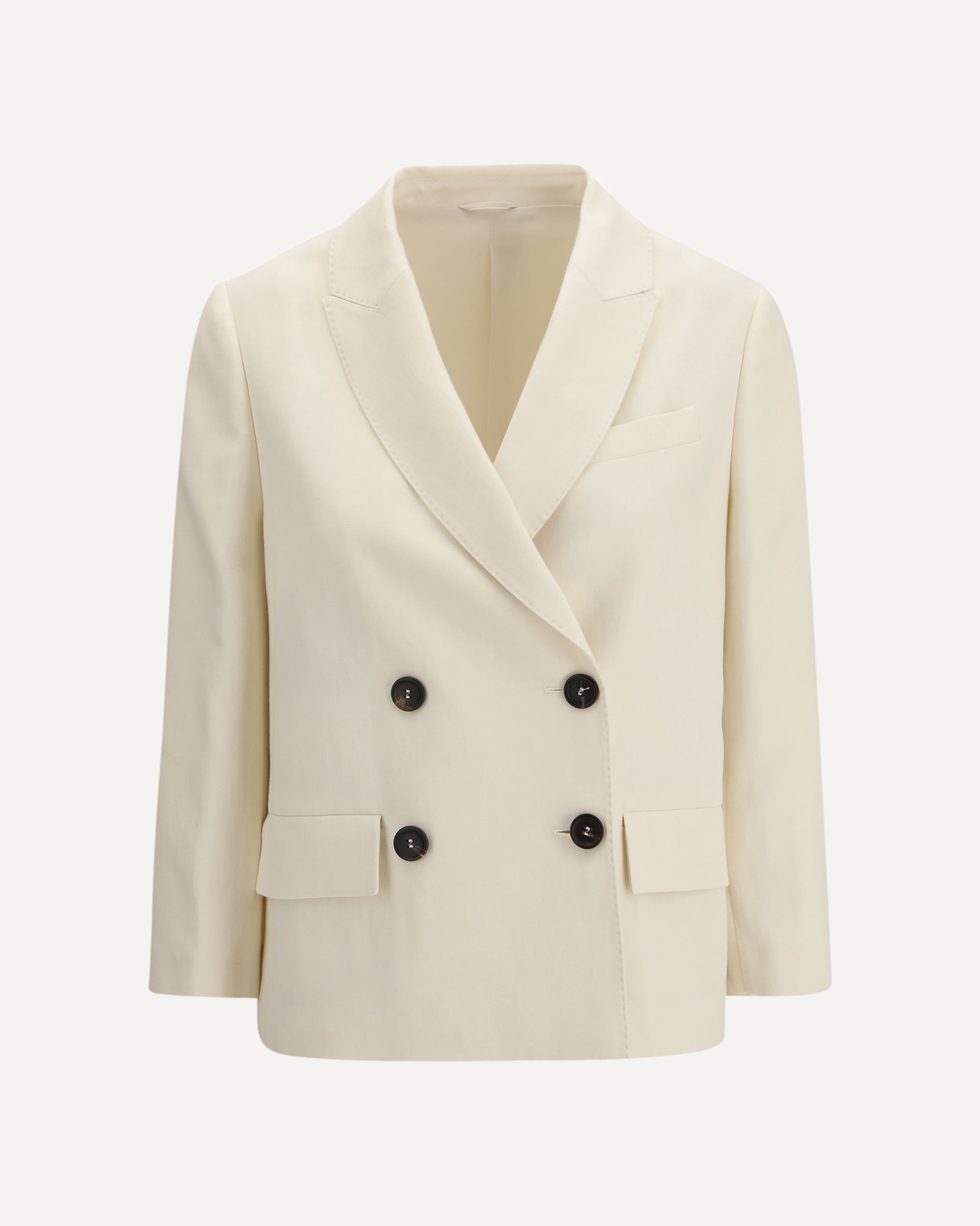 The Fluid twill Jacket in viscose and linen with monile by Brunello Cucinelli blends sartorial inspiration with a distinctly feminine spirit. The classic double-breasted concept is reinterpreted through a relaxed, summery approach, featuring cropped proportions, three-quarter sleeves, and subtle peaked lapels that soften the silhouette. A signature monile embroidery placed discreetly behind the collar adds a refined glimmer, enhancing the jacket’s effortless elegance. Horn buttons, refined pockets, and a silk-blend crepe lining complete this sophisticated, lightweight design.