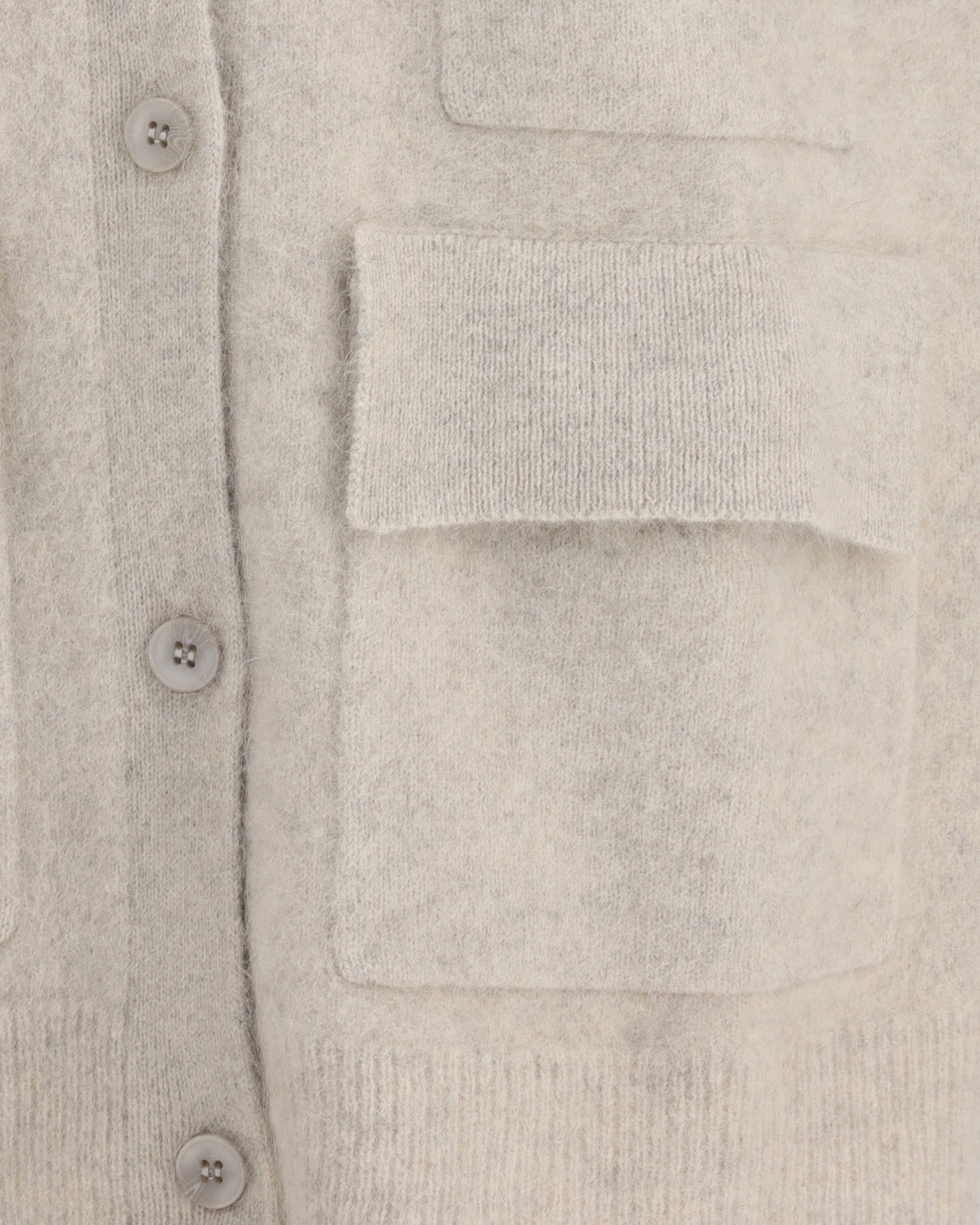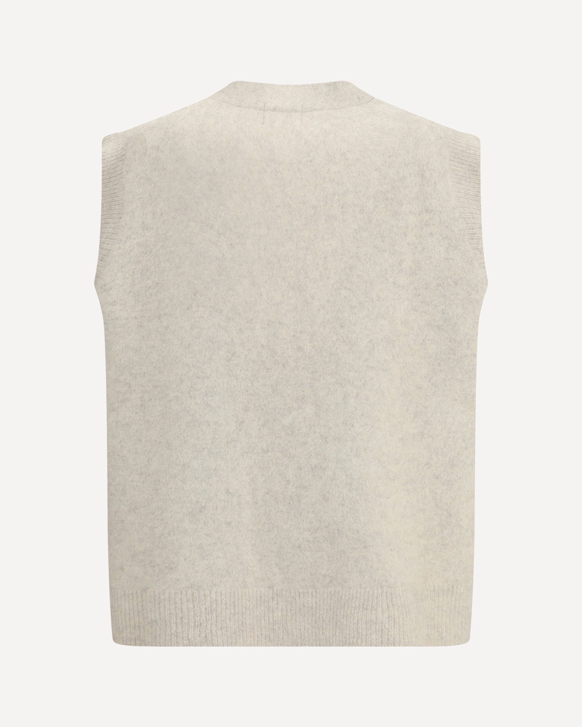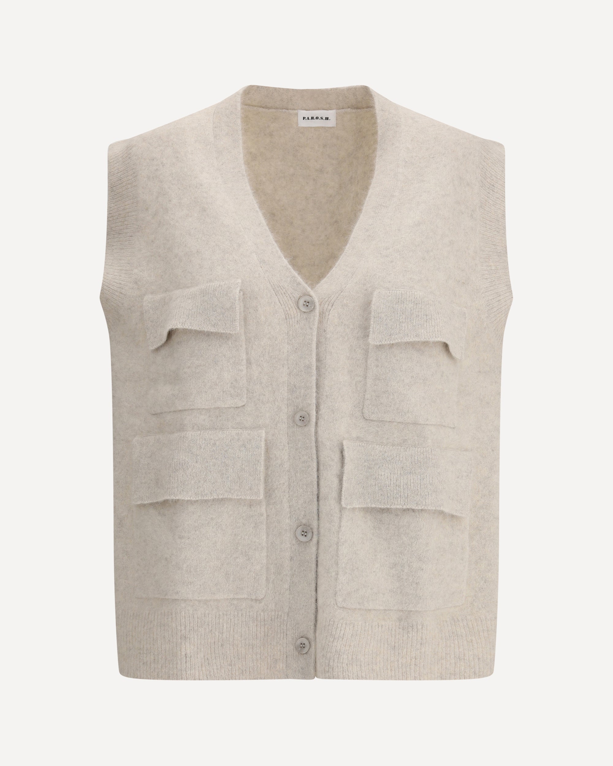P.A.R.O.S.H.'s Vest is a functional and stylish garment featuring four large flap pockets on the front, ideal for a practical and characterful touch. The front button closure ensures a secure fit, while the ribbed hem and profiles define the line with elegance. The V-neckline completes the design lending a classic and versatile allure.