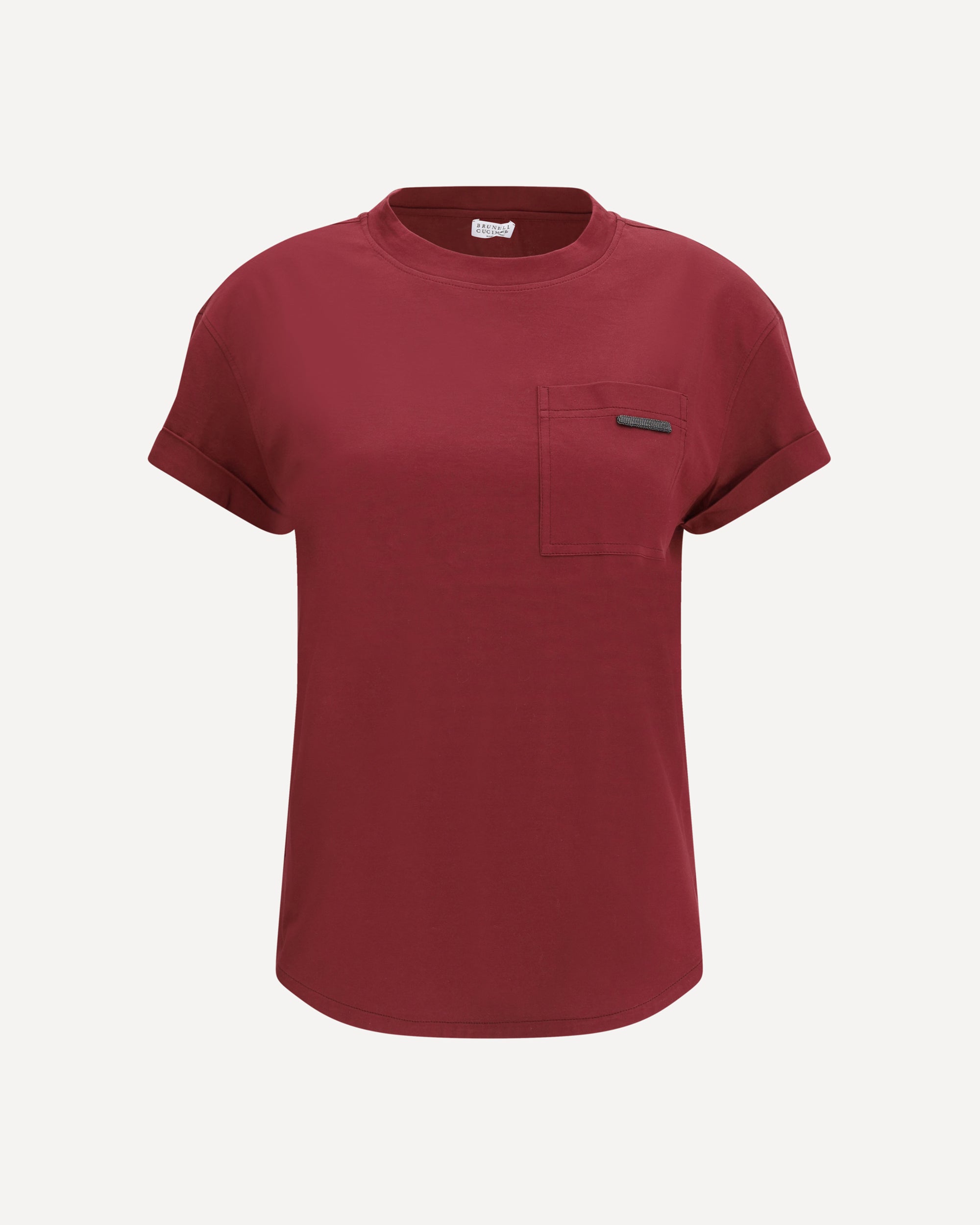 Brunello Cucinelli's cotton T-Shirt is an essential garment enriched with precious details. Featuring a ribbed crew neck and cuffed sleeves, it has an asymmetrical hemline that lends movement to the silhouette. The pocket on the front is embellished with the characteristic detail of shiny jewels, a discreet and refined signature of the house's unmistakable style.