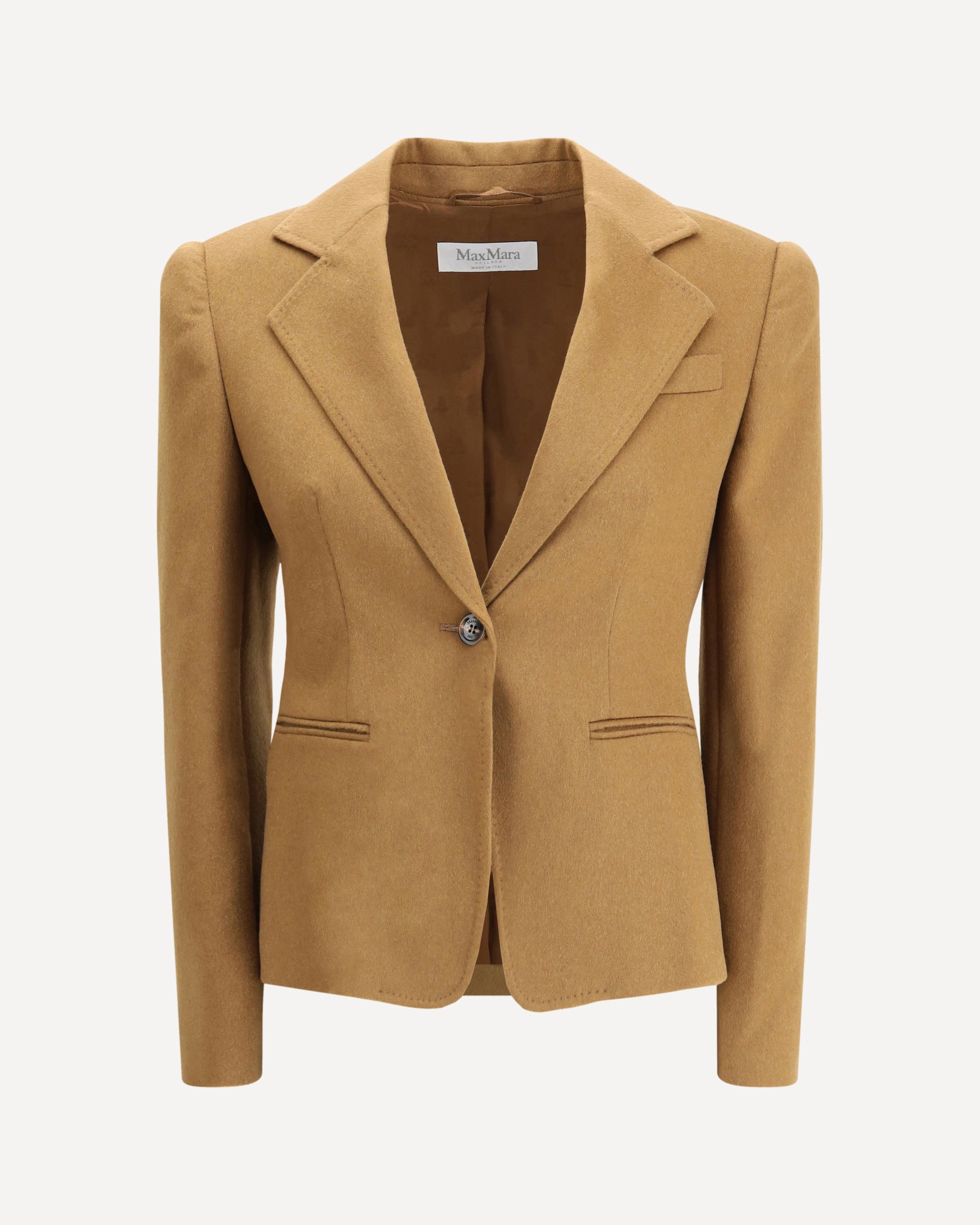 The Glenn Jacket by Max Mara is a cropped single-breasted blazer designed in lightweight zibeline baby camel drap. Its feminine silhouette gently emphasizes the waist, while the lapel collar and lightly voluminous shoulders add structure and elegance. A single button closure enhances its clean lines, complemented by a chest pocket and double welt pockets at the front. Fully lined, it reflects Max Mara’s timeless tailoring with a modern, refined spirit.