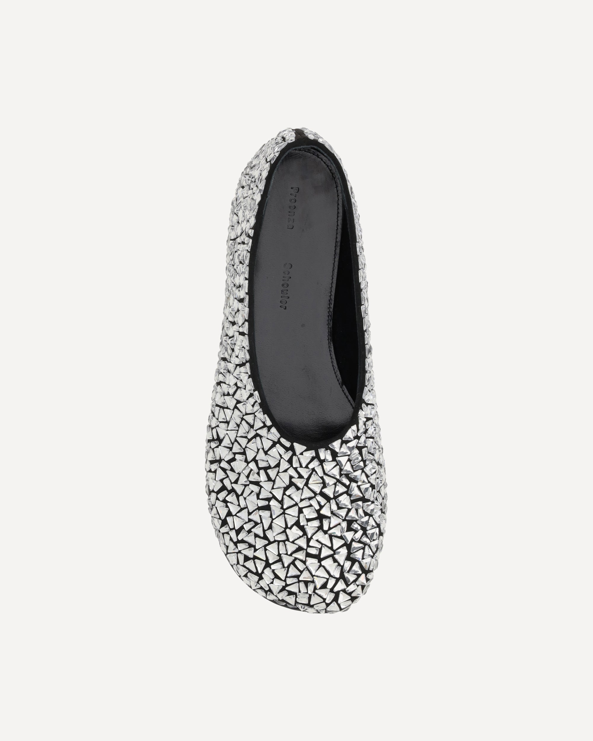 Proenza Schouler's Glove Embellished Ballerinas are meticulously crafted with over 750 mirrored embellishments decorating the exterior of the shoe. They feature a slip-on silhouette with a rounded toe and low heel.