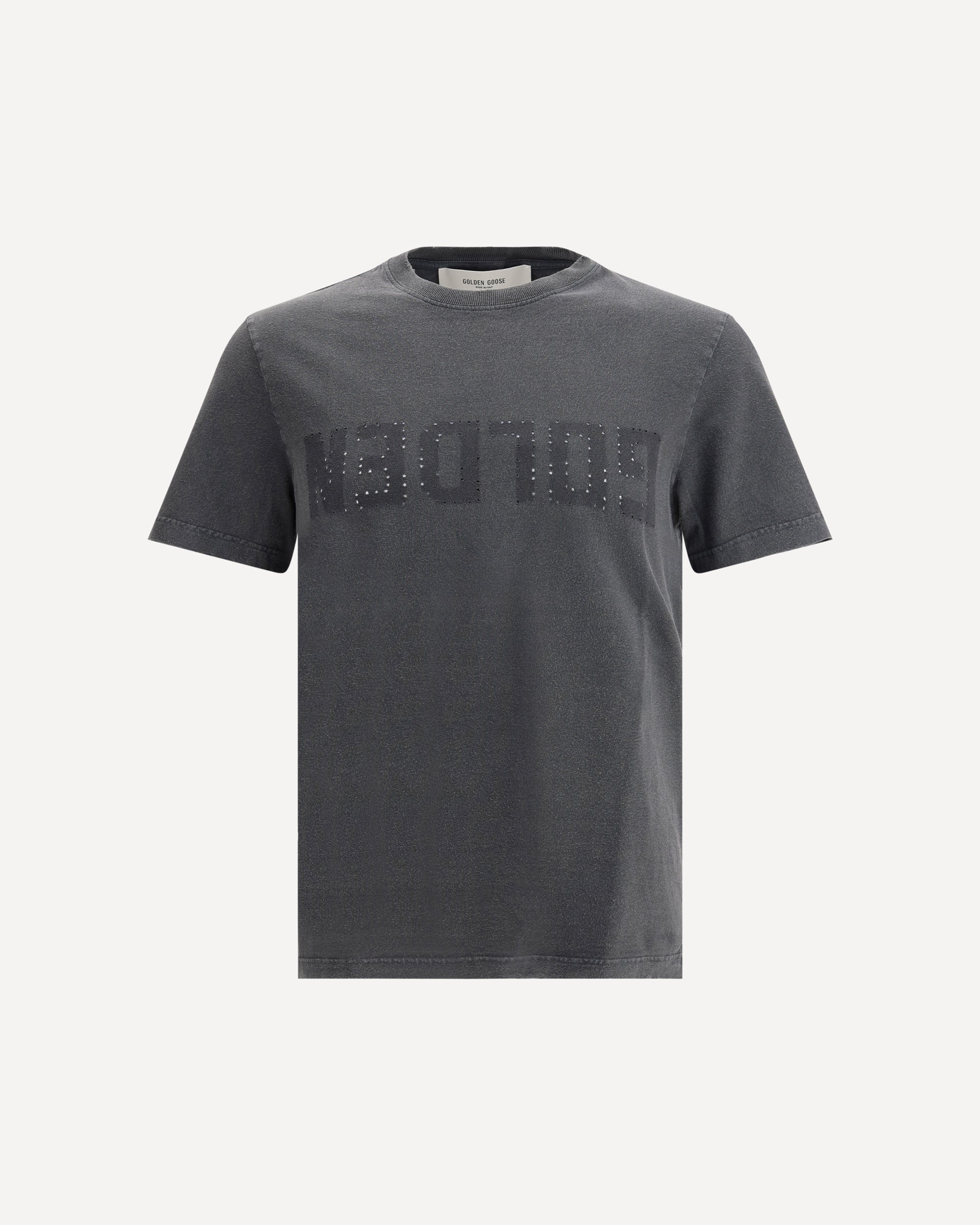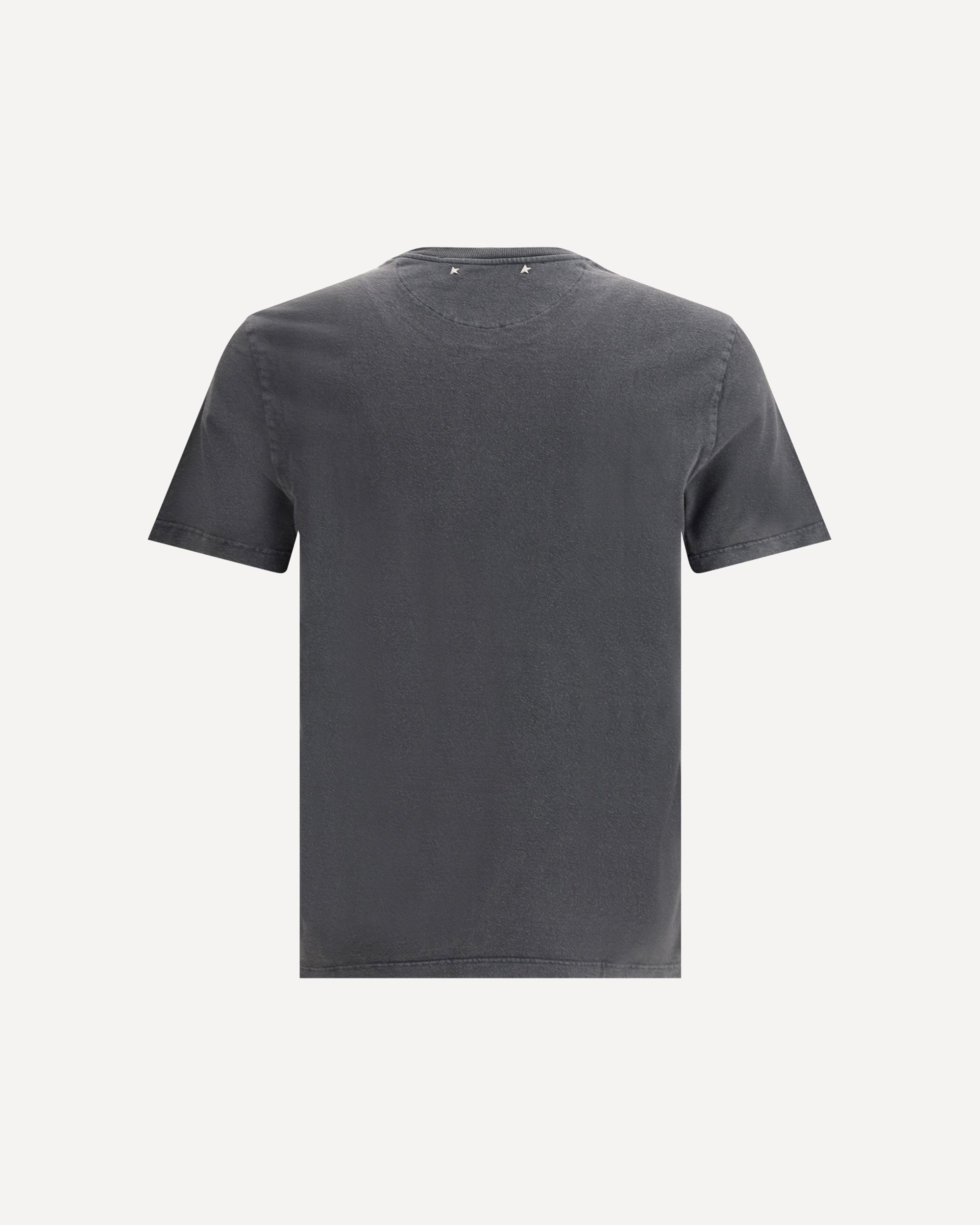 Cotton T-Shirt by Golden Goose features a ribbed crew neck with a worn effect that adds a vintage touch to the design. The garment features a refined monochrome pattern, enriched by a contrasting embroidered patch on the front and the brand's iconic monogram made through perforations, which lend originality and style. The regular fit ensures comfort and practicality, ideal for a casual yet distinctive look.