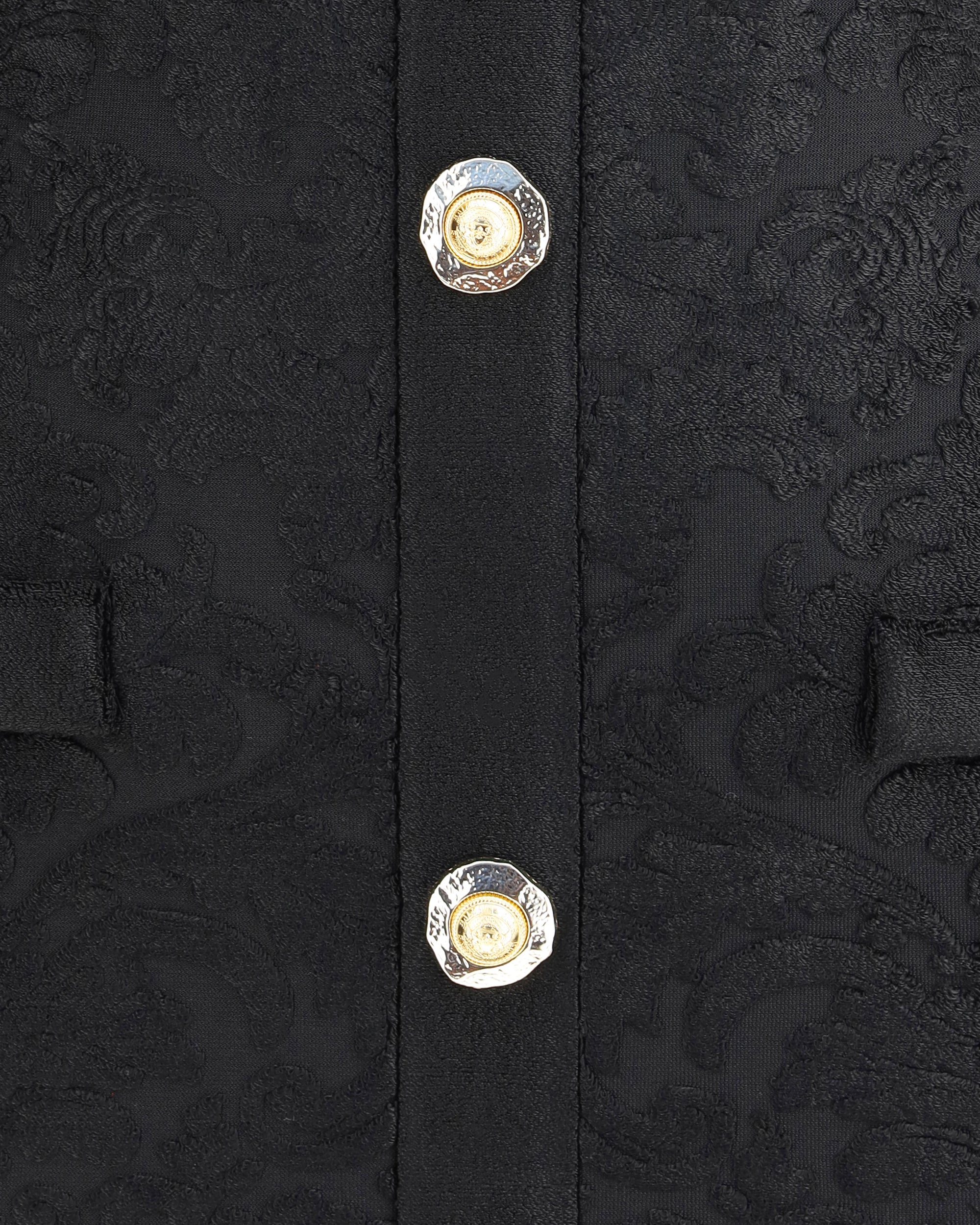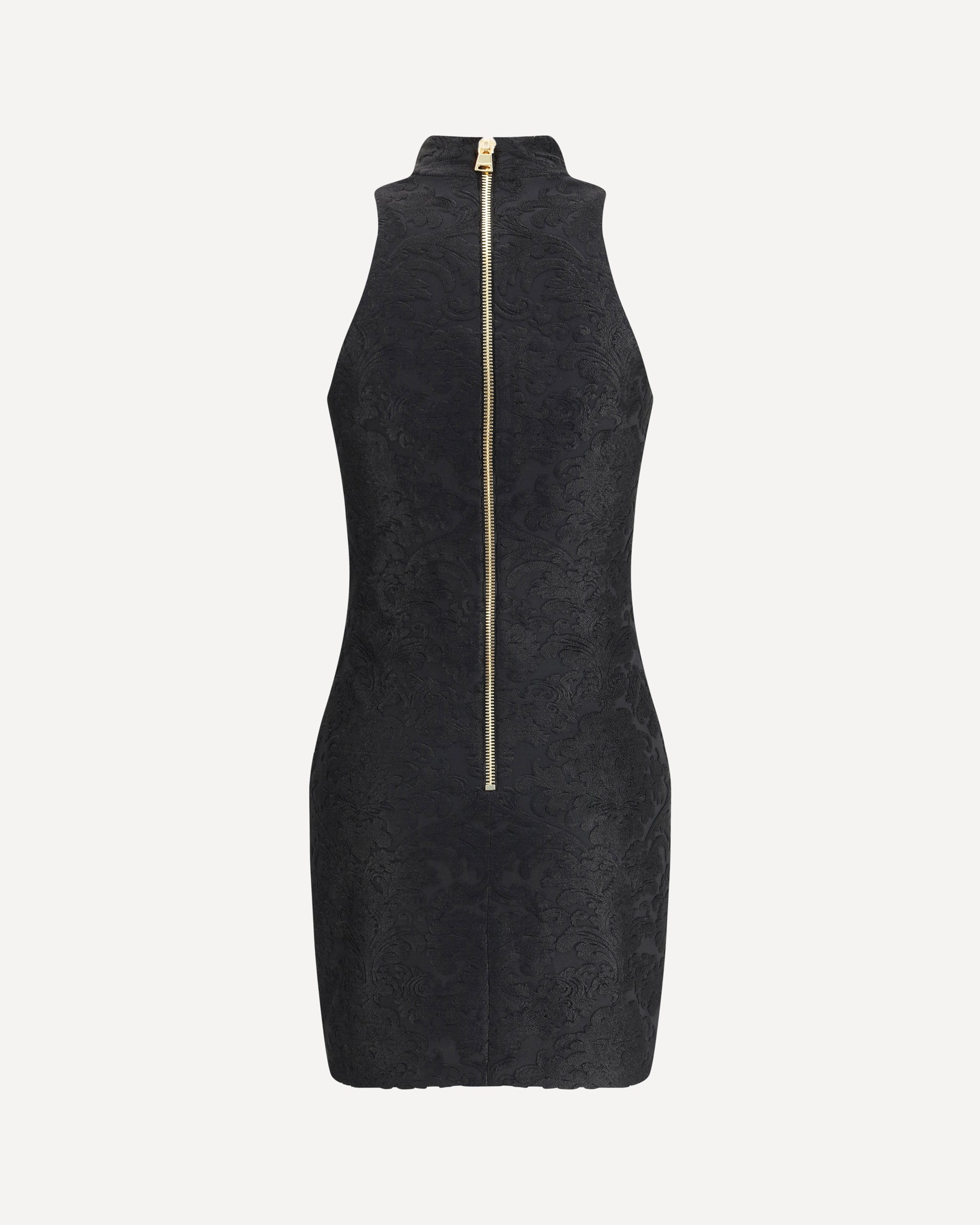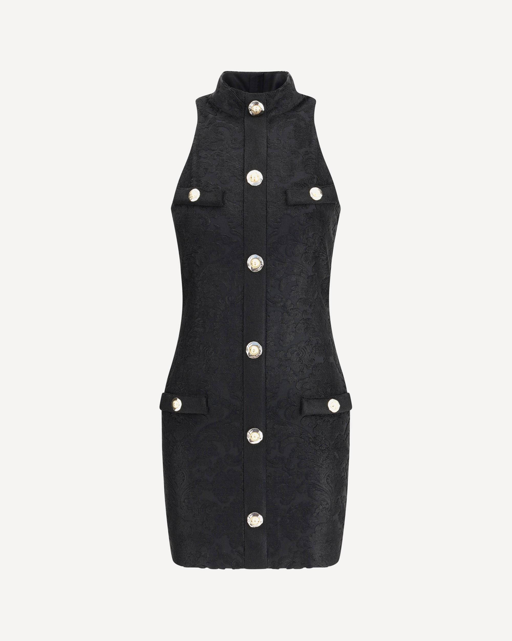 Balmain's Baroque short Dress combines elegance and character in a refined design. Made of bouclé fabric with a rich baroque pattern, it features an American collar that enhances the silhouette and a back zipper closure. Gold embossed buttons on the front add an iconic and luxurious touch typical of Balmain style.