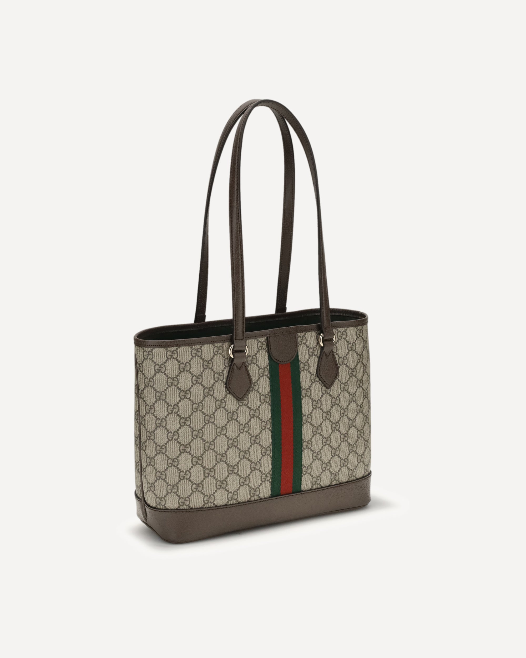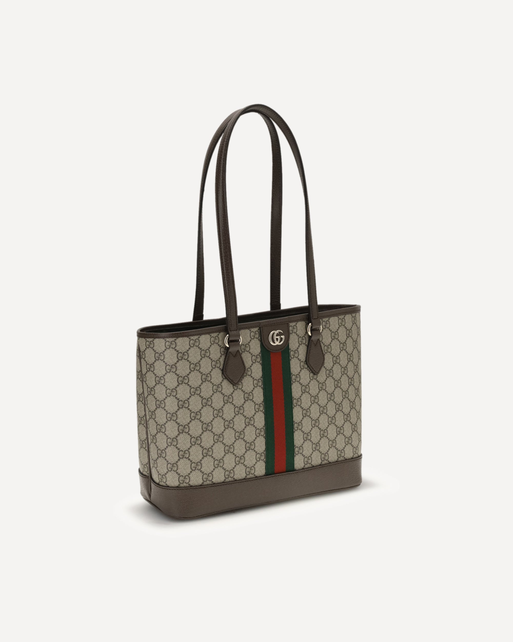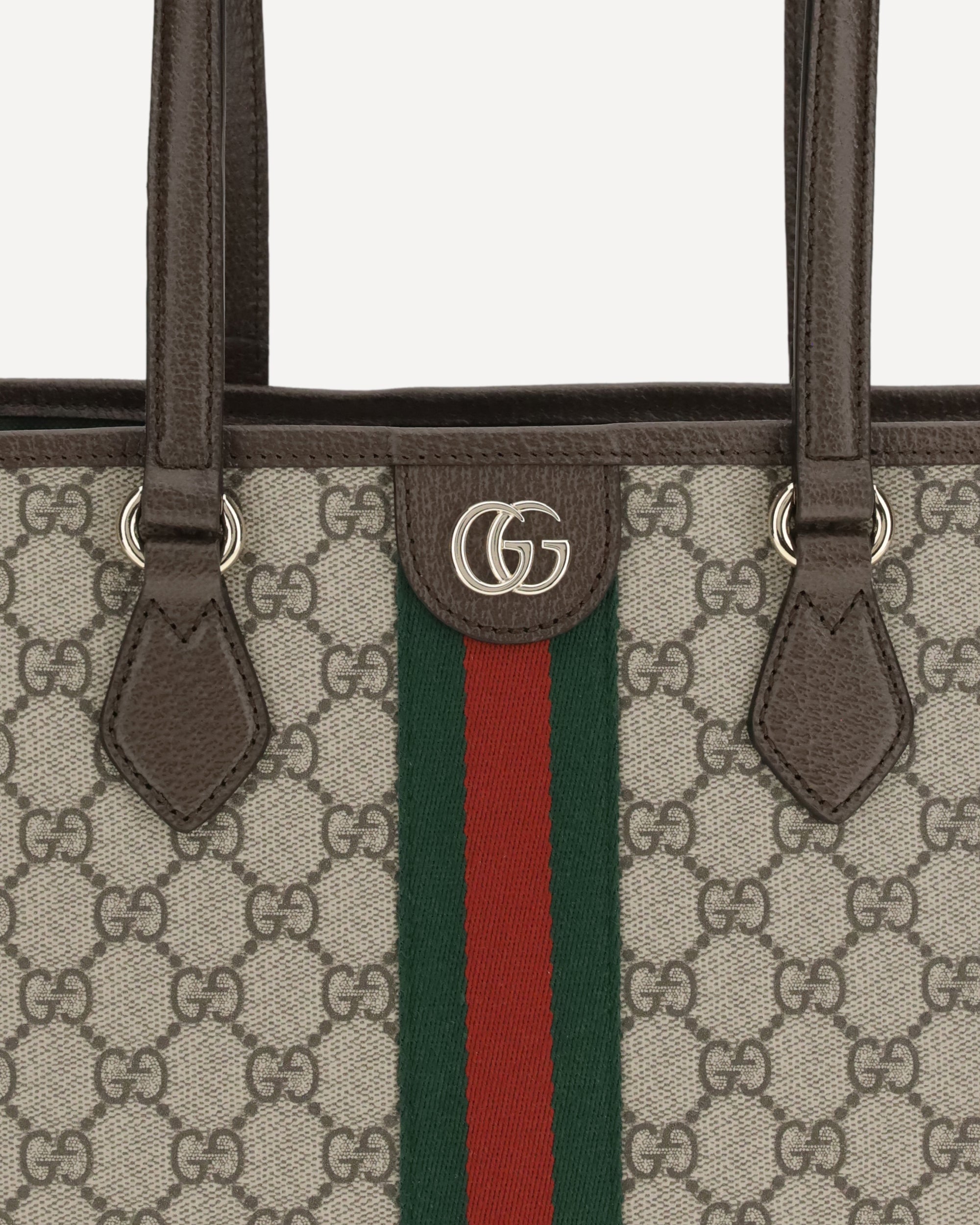The medium Ophidia Tote Bag by Gucci combines iconic style and functionality with its coated fabric featuring the classic GG monogram in beige and dark brown, embellished with brown leather trim and light gold hardware. The green cotton lining adds a distinctive touch, while the double G detail and Web ribbon complete the design, making this tote an elegant and versatile accessory perfect for any occasion.