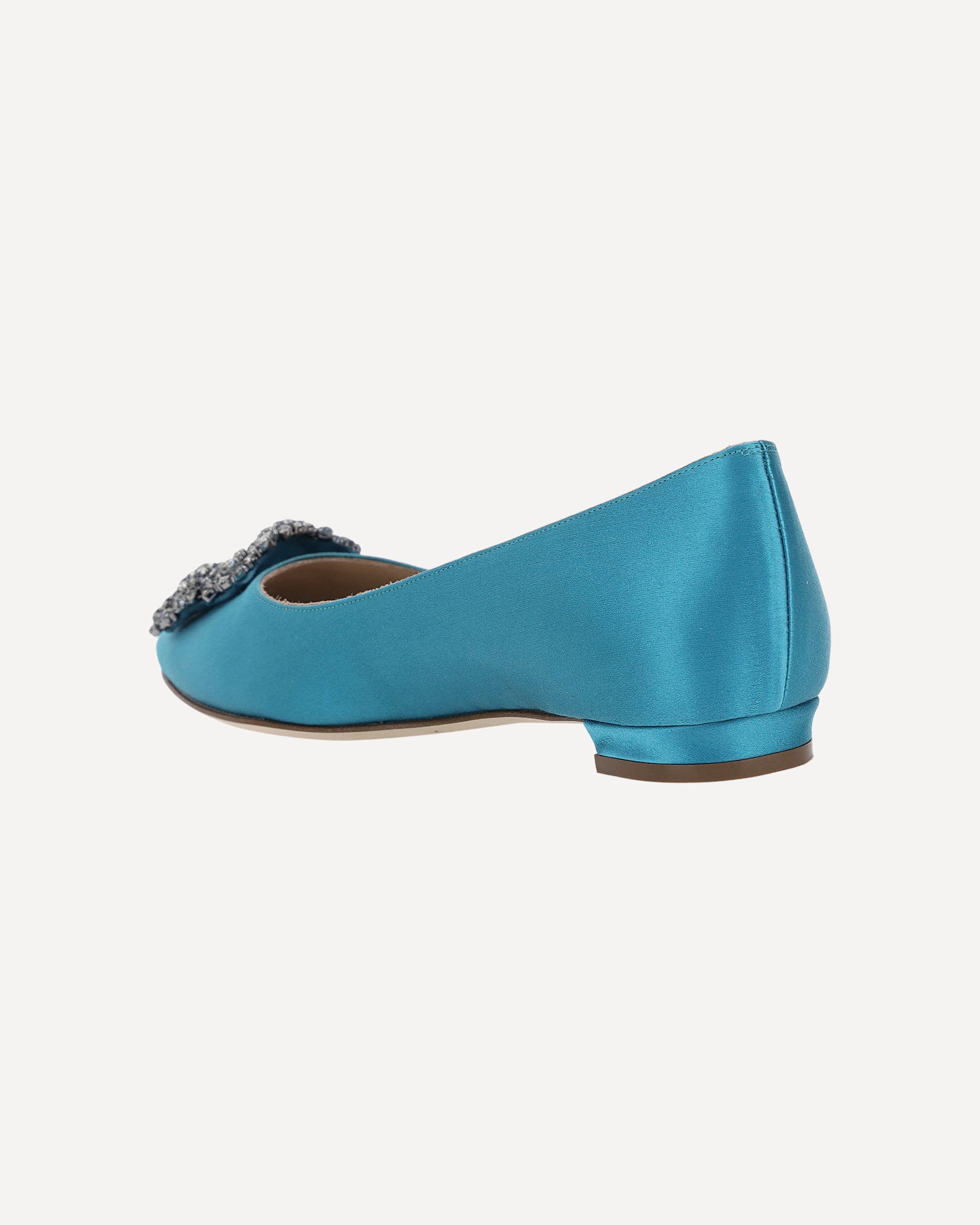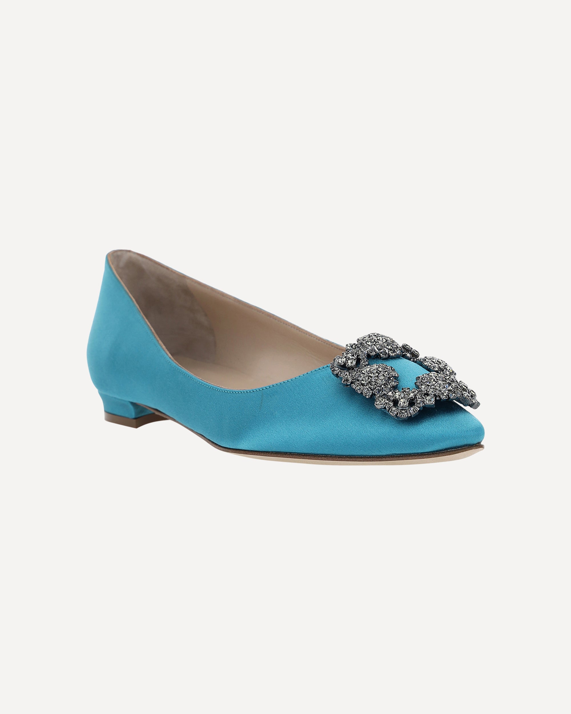Silk Satin Hangisi Ballerinas by Manolo Blahnik, almond toe, slight leather block heel, embossed Swarovski jewel detail applied on front, velvet effect design, logo insole.