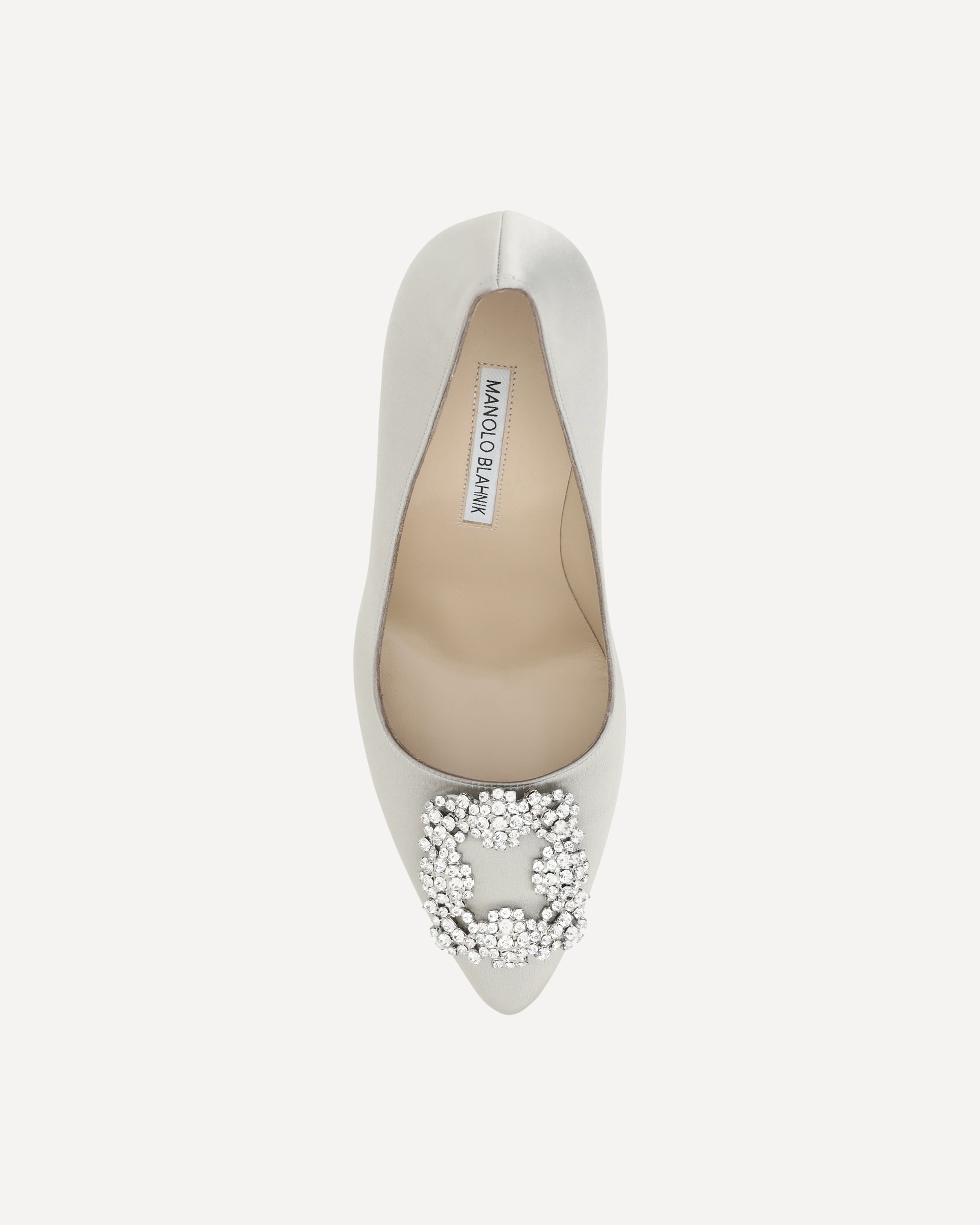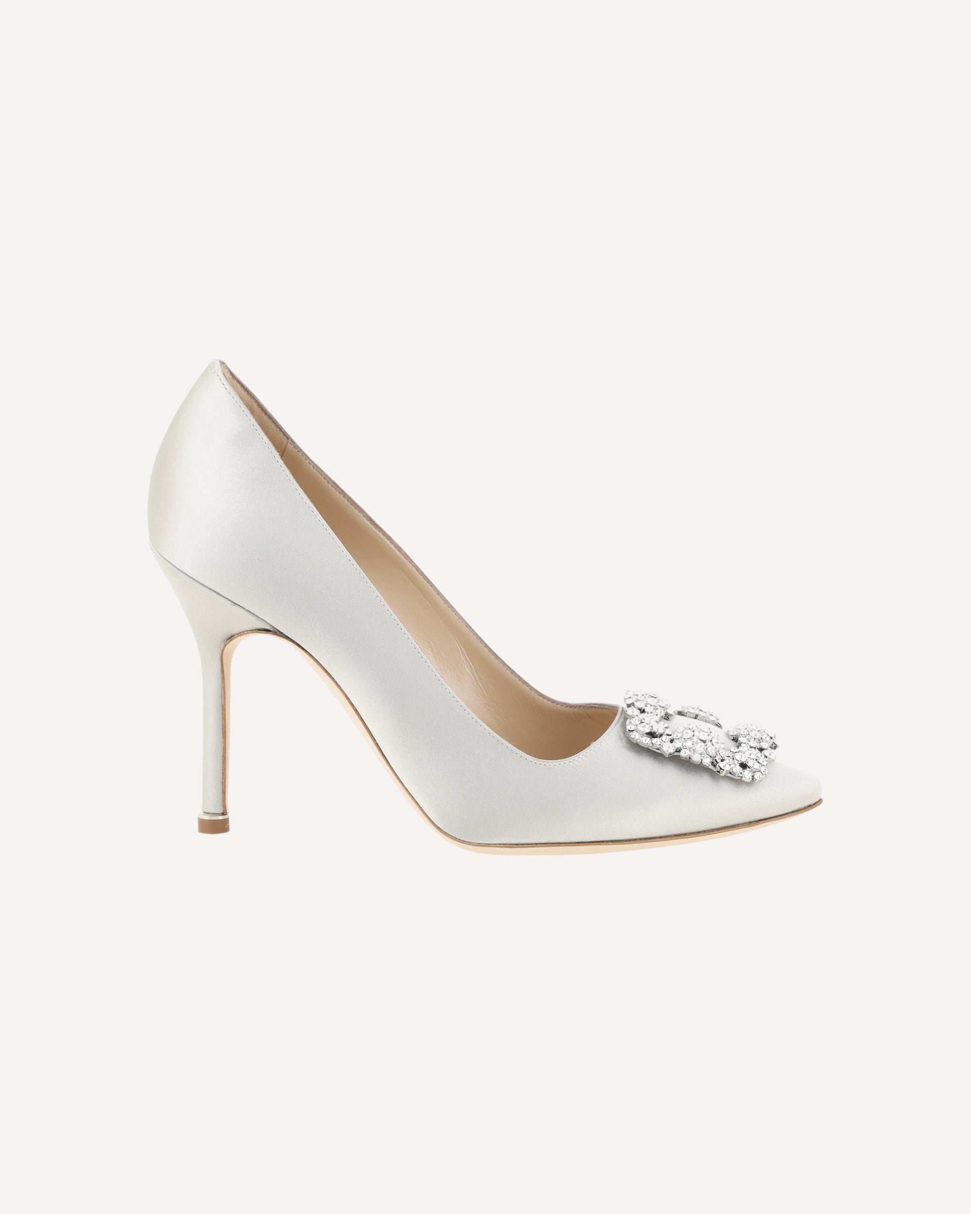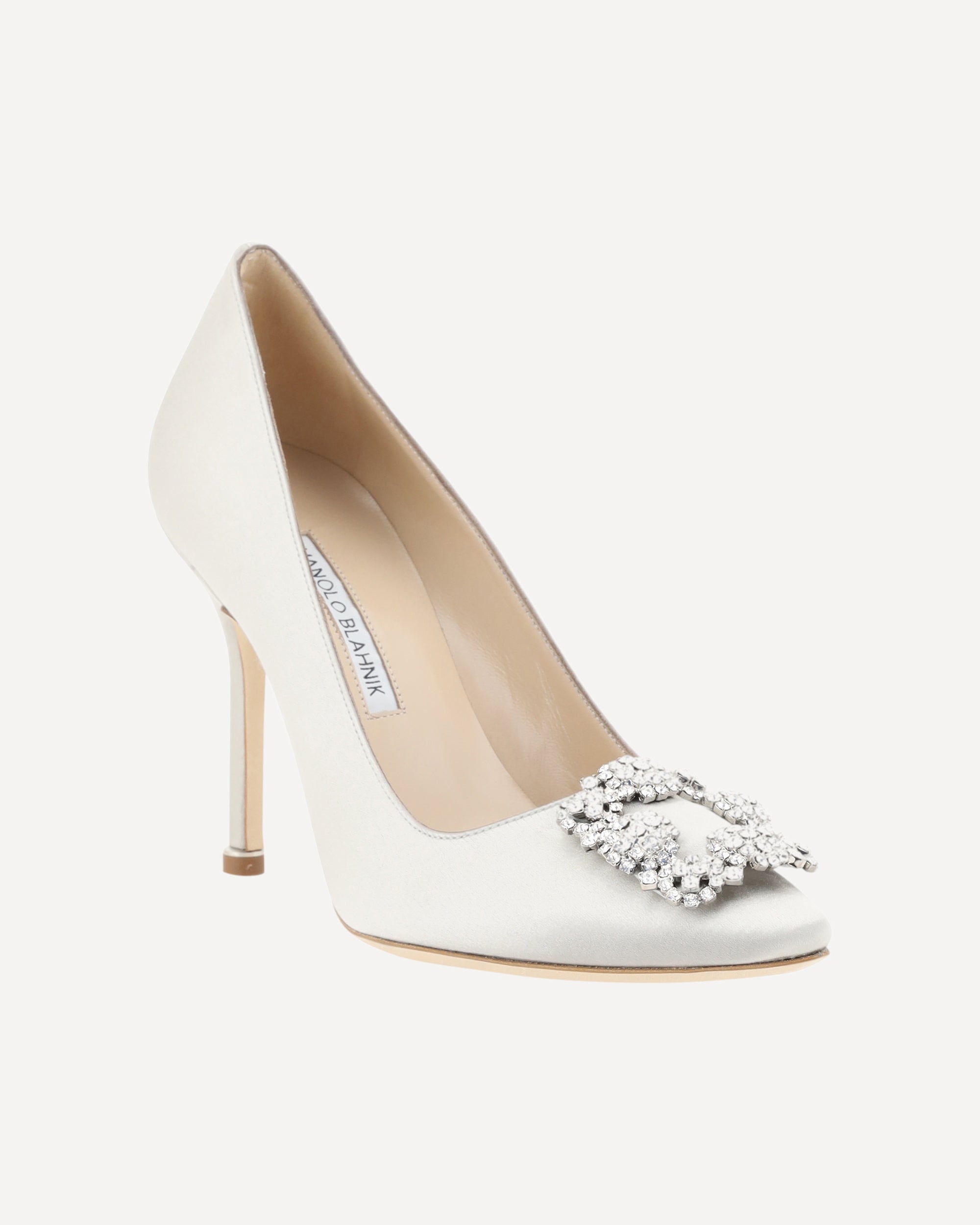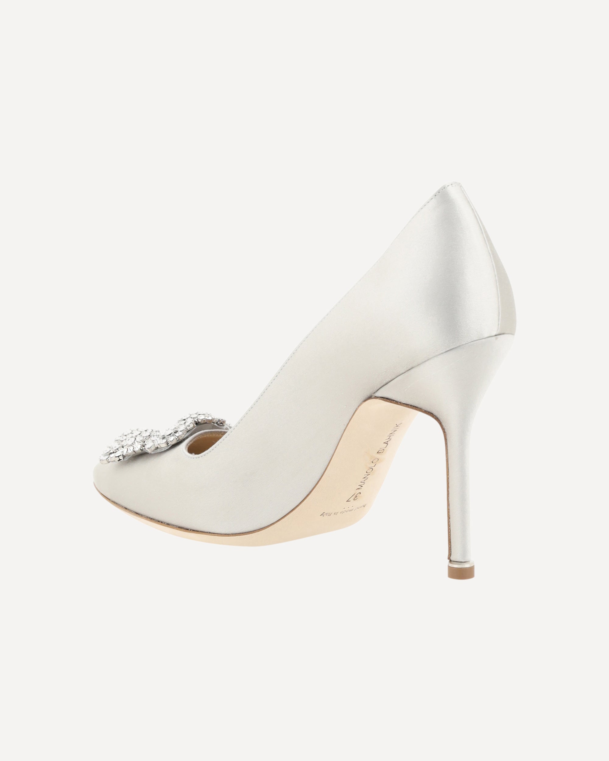 Silk Satin Hangisi Pumps by Manolo Blahnik, almond toe, iconic Swarovski crystal buckle appliqué on front, leather stiletto heel, logo-embossed insole.