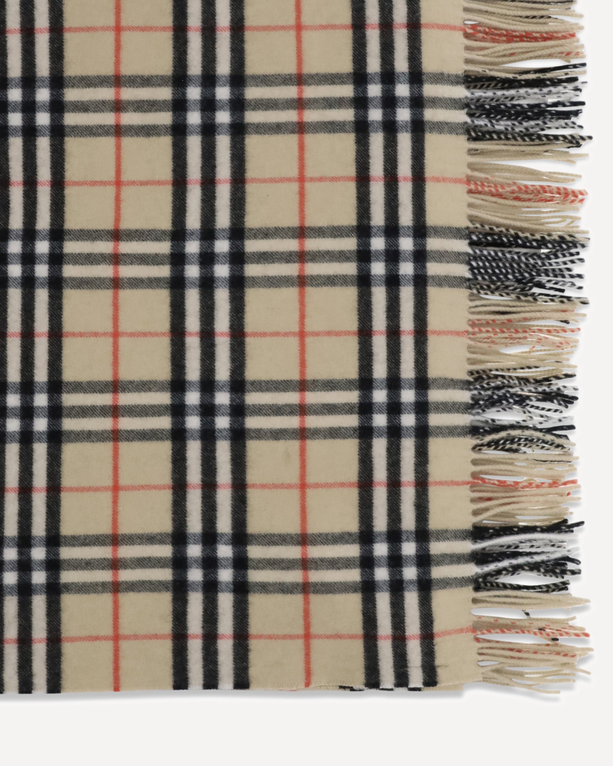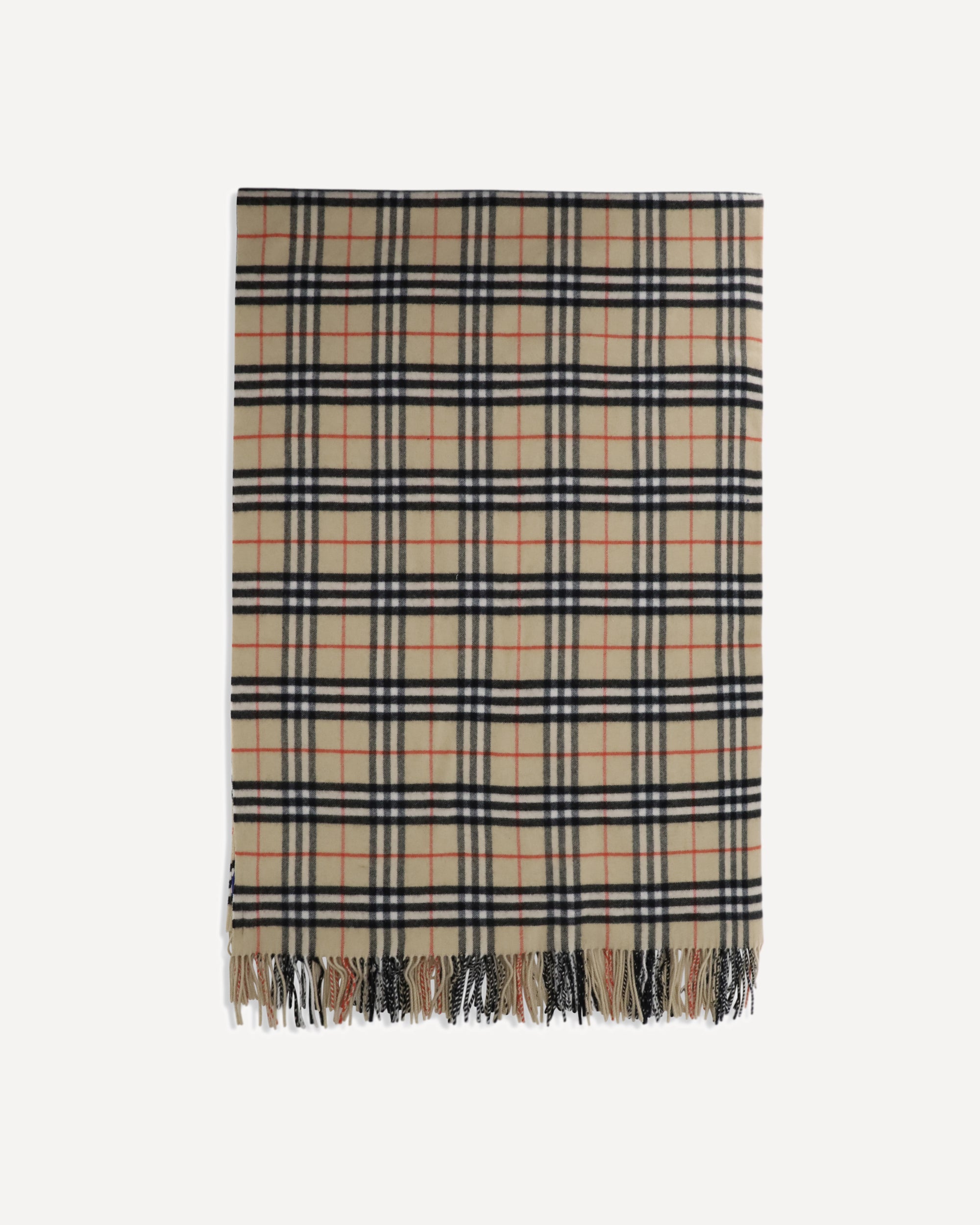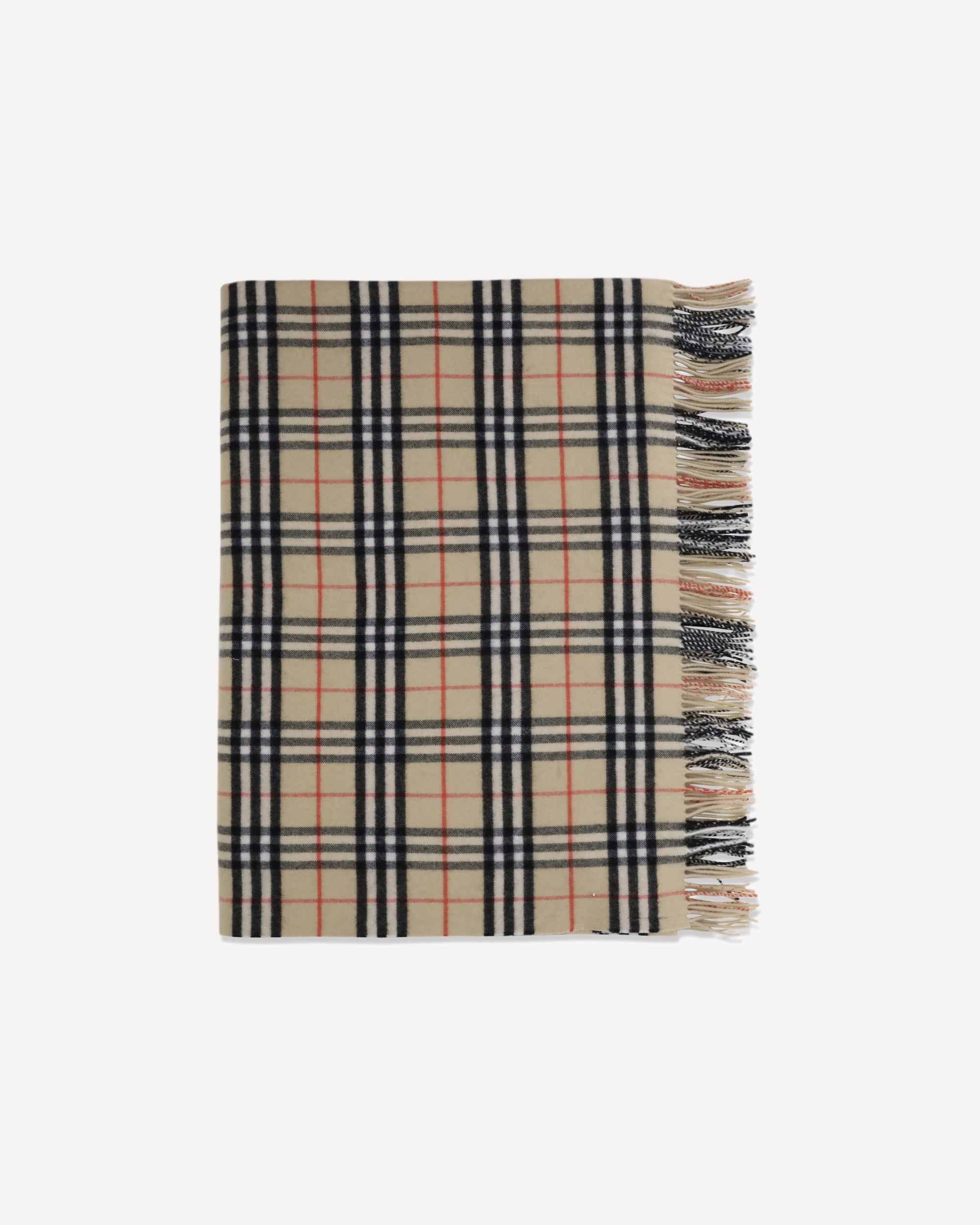 The cashmere Blanket by Burberry crafted in Scotland and woven with the iconic Check pattern in classic sand beige. The cashmere is processed in a historic Scottish mill, washed in local spring water, and brushed to achieve an exceptionally soft finish. Its rectangular design is completed with fringed ends, offering timeless elegance and enveloping comfort.