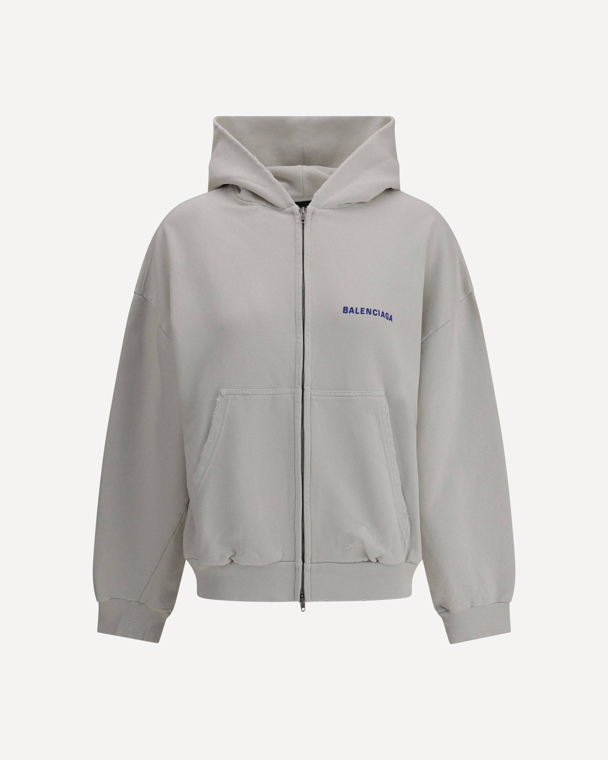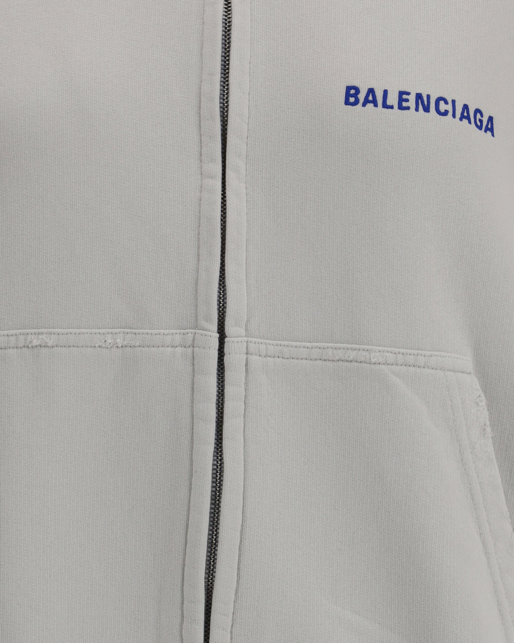 Cotton Hoodie by Balenciaga features a vintage worn-in design. Featuring a double-slider front zipper, it has two patch welt pockets on the front for a practical and functional style. Ribbed cuffs and hem ensure a comfortable, structured fit. Completing the look is the iconic contrasting Balenciaga monogram, printed on the front and back, which gives a distinctive and recognizable graphic touch.