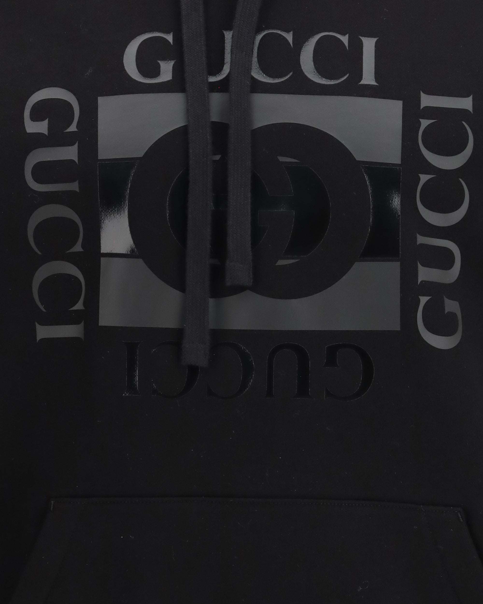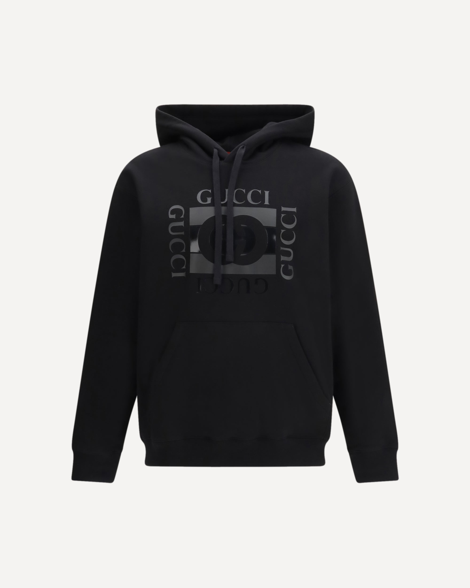 The Hoodie by Gucci is a casual and stylish piece, crafted from soft black brushed cotton jersey. The Gucci Incrocio GG print on the front adds an iconic and distinctive touch. The fixed hood with drawstring offers an adjustable fit, while the kangaroo pocket and ribbed trim complete the design, combining comfort and style. Perfect for a luxury streetwear look, this sweatshirt is a must-have for lovers of Gucci style.