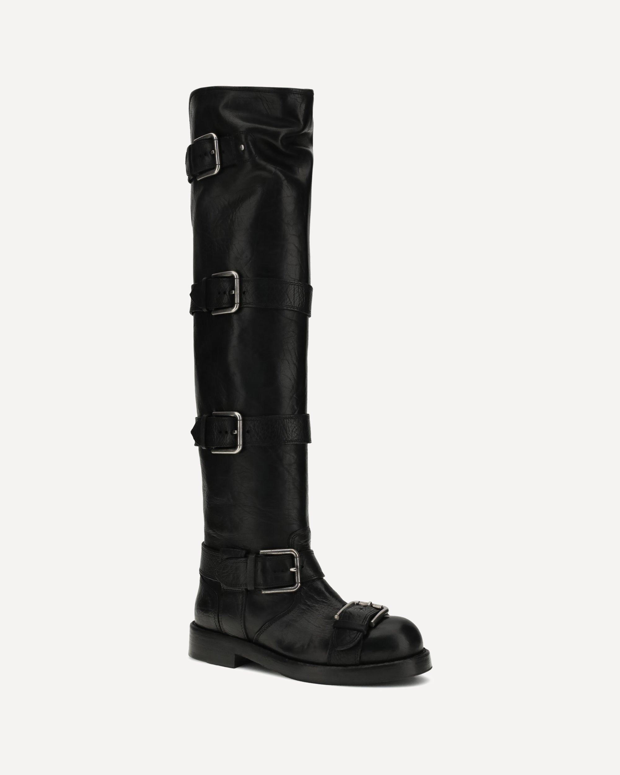 Extra long buckled Boots by Dolce&Gabbana embody a bold and sophisticated aesthetic. Crafted in the signature Bernini shape, they feature a leather heel-shell insole embellished with a custom label. Buckles, arranged throughout the shaft, add a bold and distinctive touch, while the palladium Miami finish completes the design with contemporary elegance.