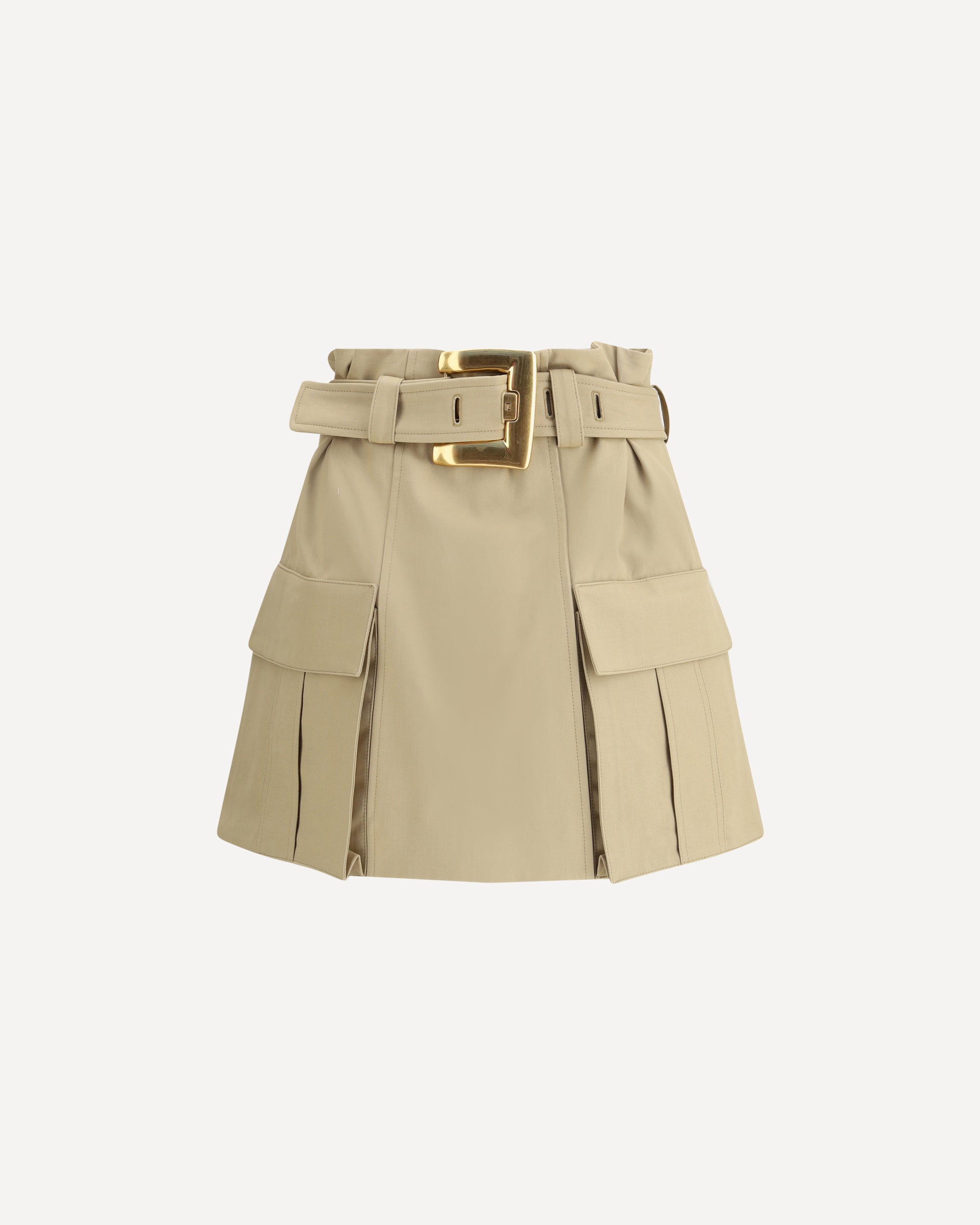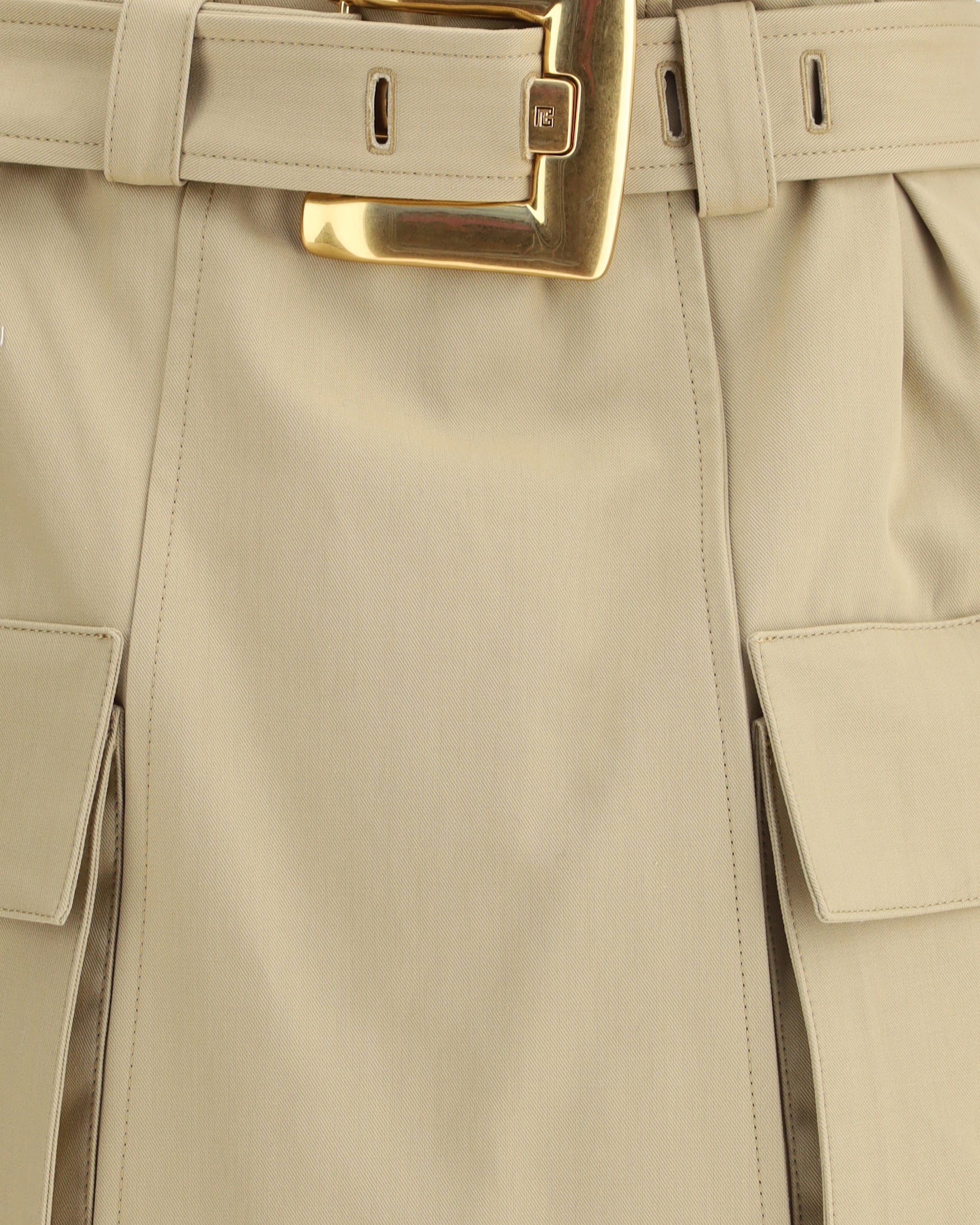 Balmain's cargo Miniskirt reinterprets utility style with a sophisticated twist. Featuring a removable belt with a PB engraved gold metal Anthem buckle, it has two side pockets with gussets and a flap. The back closure with exposed zipper and Balmain engraved slider adds a bold iconic detail to the design.