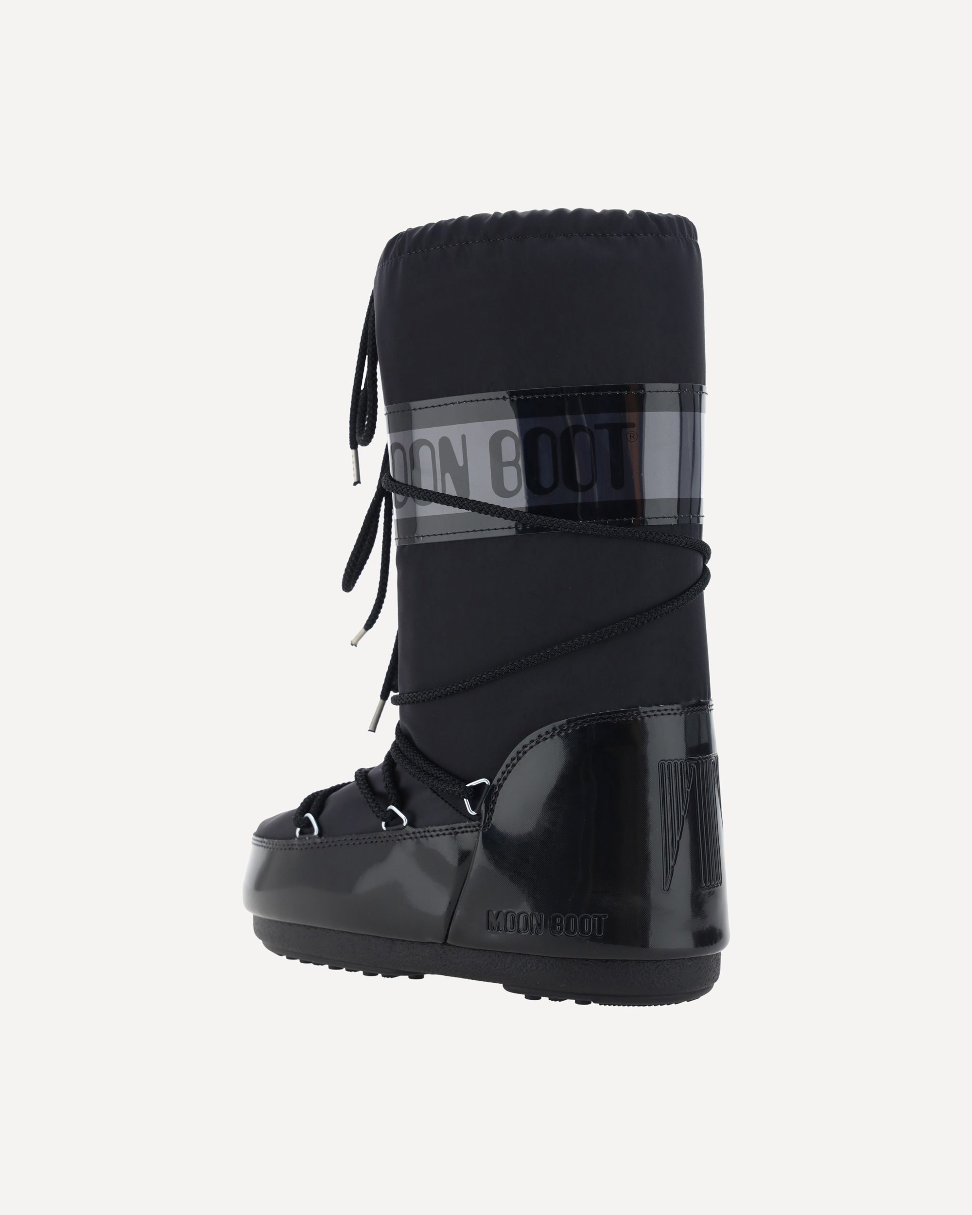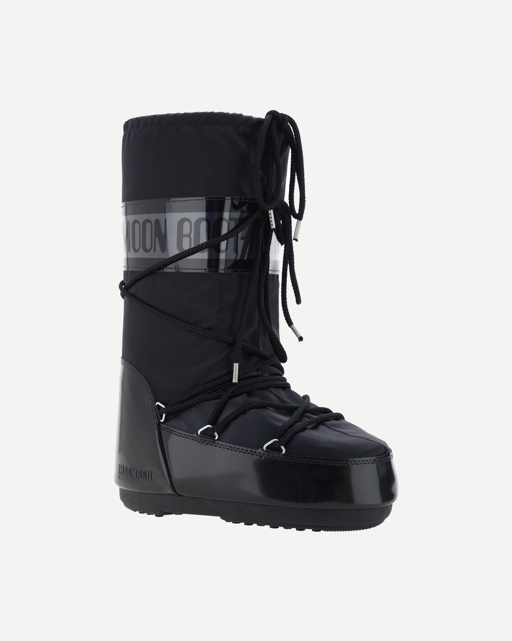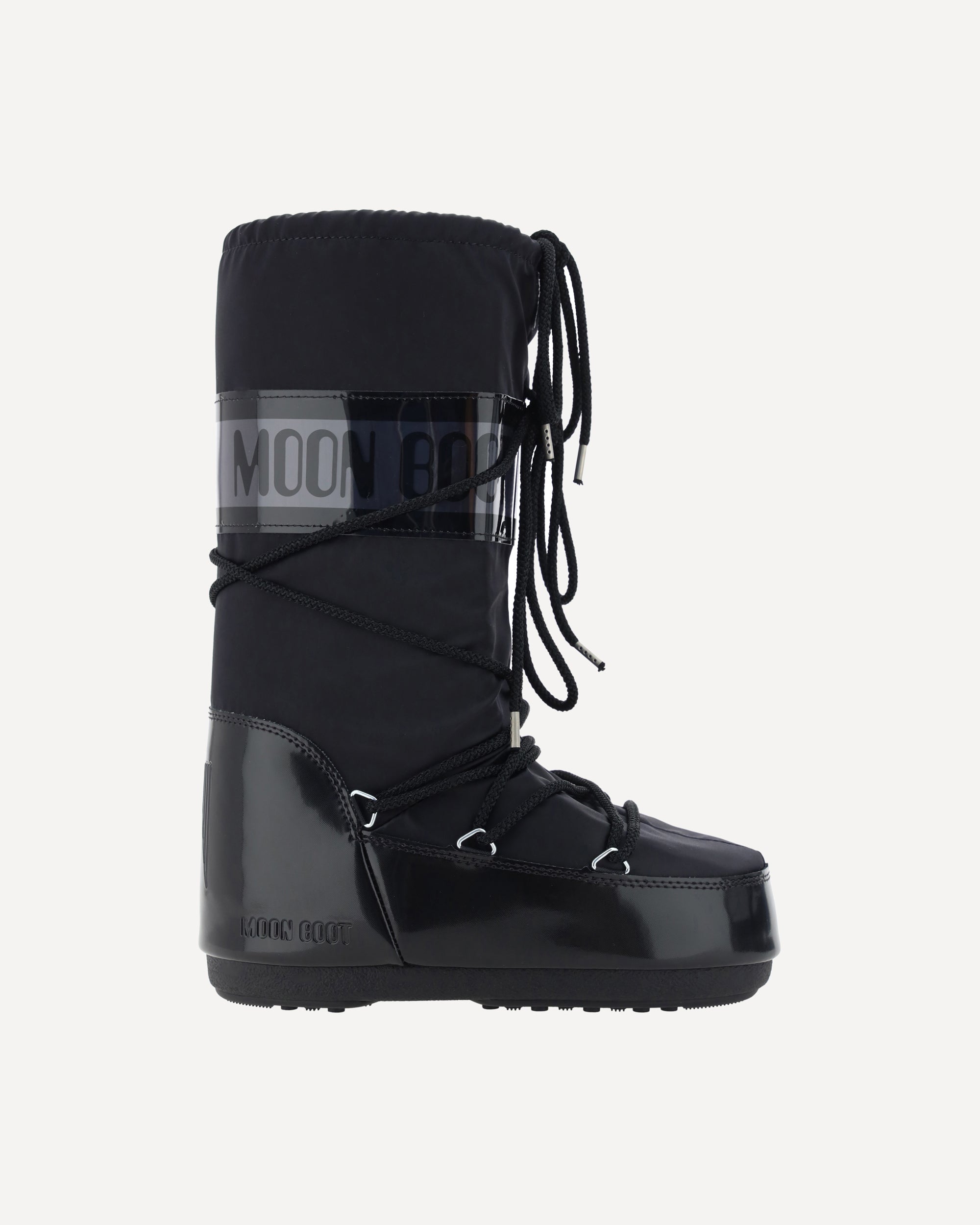 Icon Glance Boots by Moon Boot, tall model, classic all-over padded design, iconic brand monogram printed in contrast on the shaft, front laces for closure, platform sole, knee-high model.