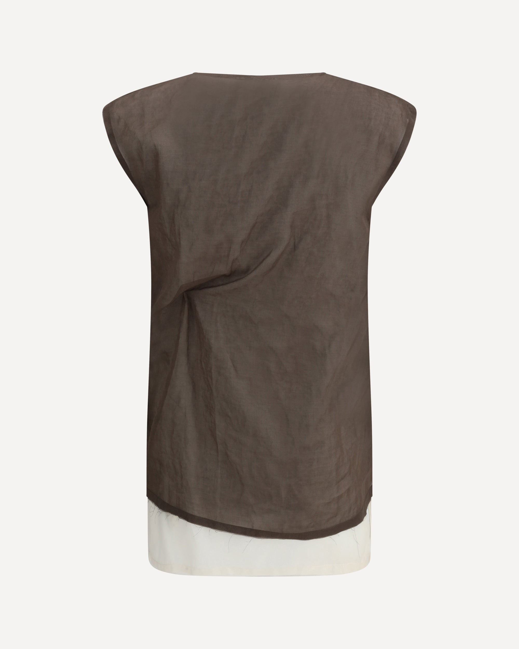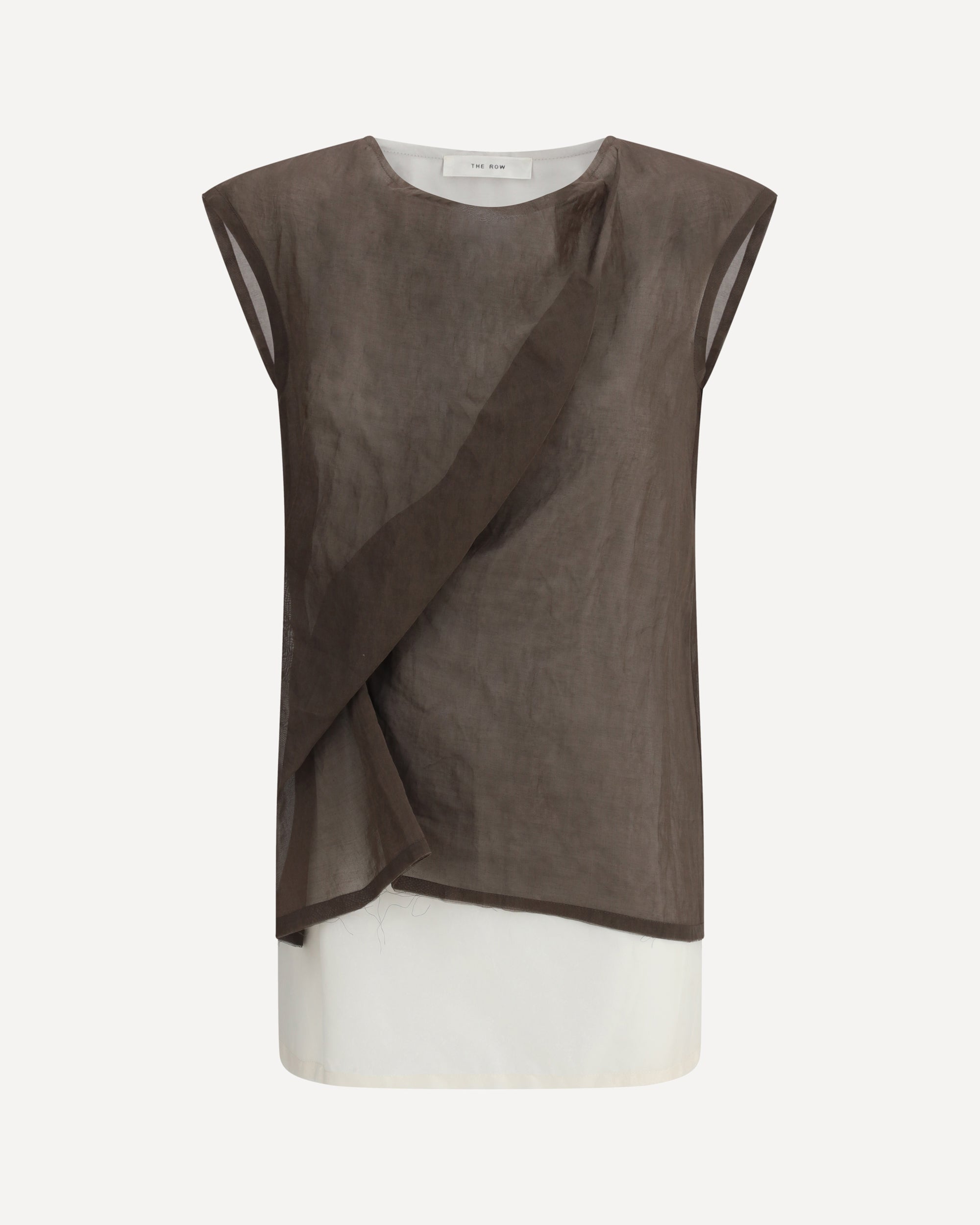 The Row's Inawa Top is a fitted button-up style made from gauzy cotton organza, with a straight hem and exposed front placket. Stitched draping adds a sophisticated touch, delicately highlighting the contrasting bottom layer for an elegant, contemporary effect.