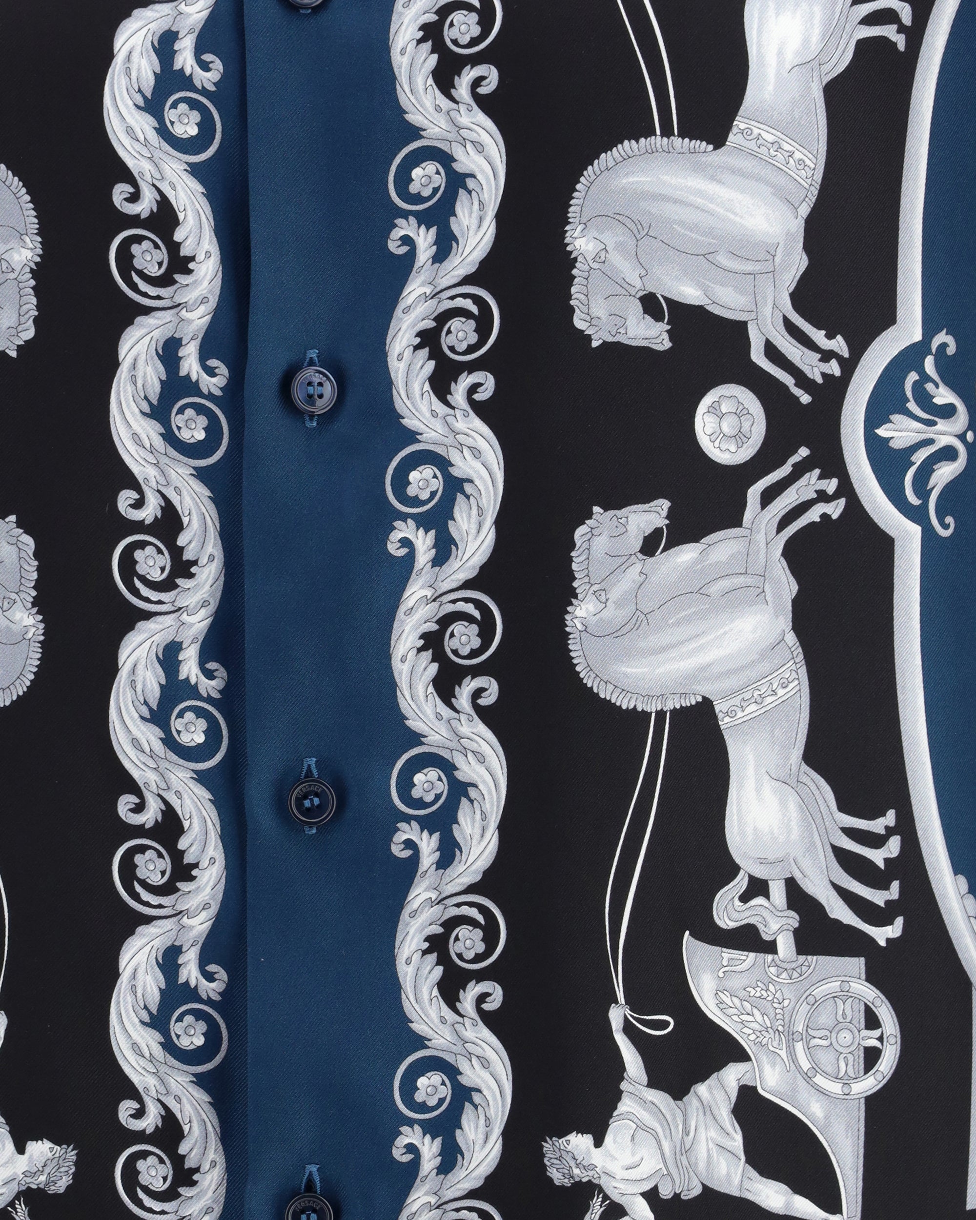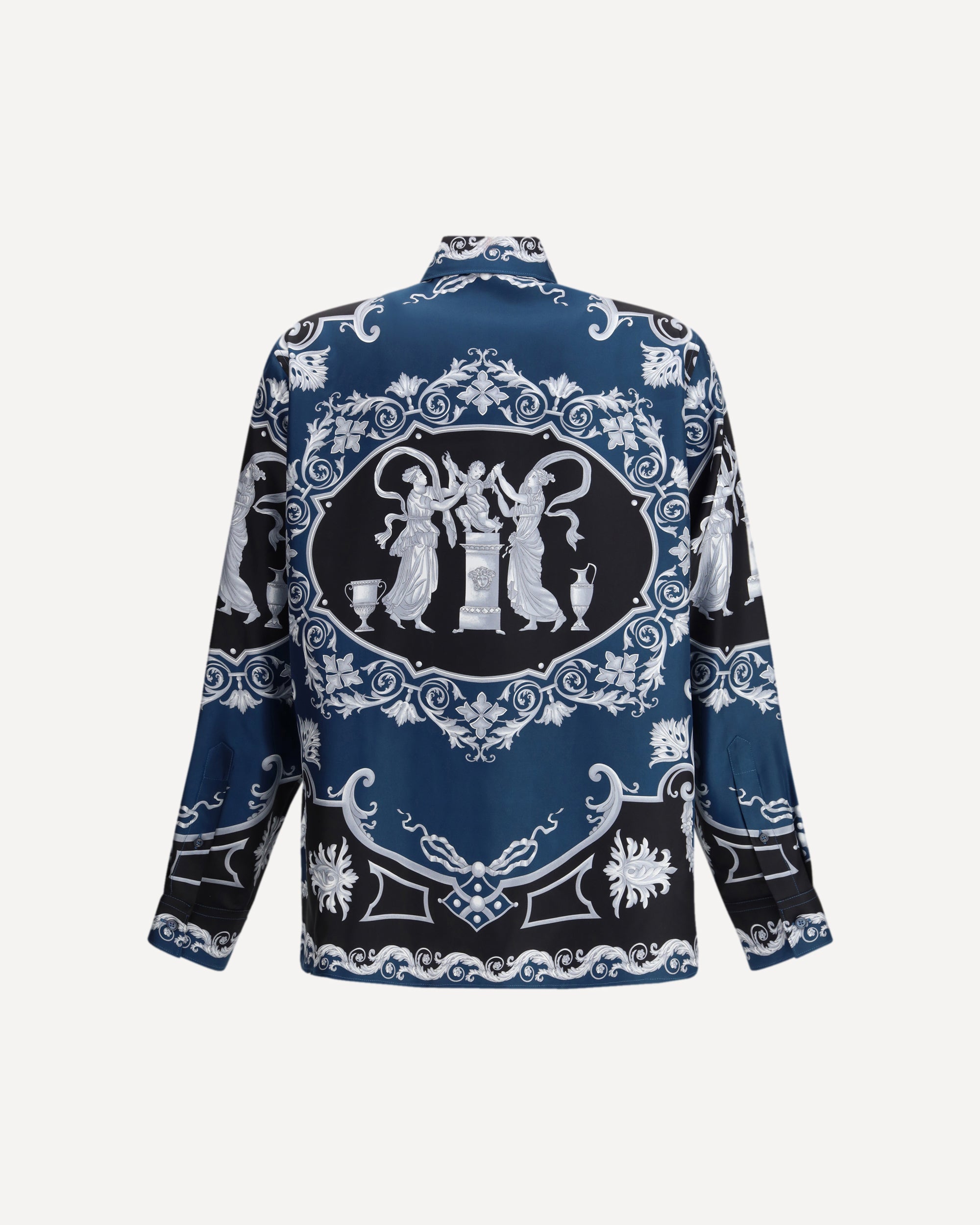 The regular-fit printed silk twill Shirt by Versace brings a theatrical reinterpretation of an archival motif to contemporary tailoring. The Hall of Heroes print envelops the garment like a narrative fresco, depicting classical statues, deities, and Baroque elements borrowed from the Maison’s Home collection. Lustrous silk twill enhances the fluidity of the silhouette, while the regular cut strikes a perfect balance between refinement and ease. A pointed collar and buttoned cuffs reinforce its tailored appeal, complemented by a simple front button closure that preserves the timeless elegance of Versace shirting.