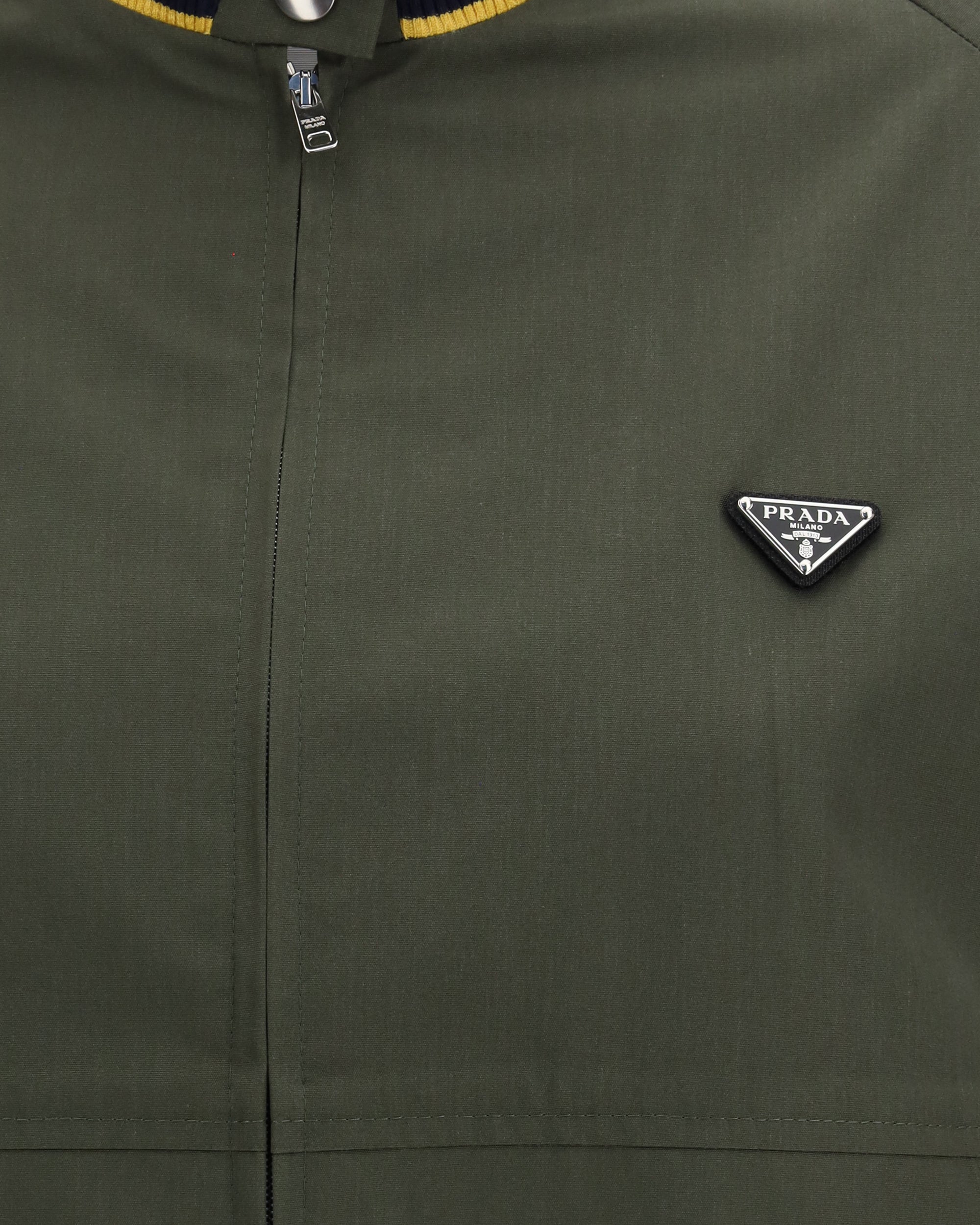 The technical canvas Blouson by Prada conveys a contemporary functional aesthetic. Designed with a high collar and long sleeves finished with elasticated cuffs, it features striped detailing on the collar and cuffs that adds a distinctive graphic touch. A front zip closure shapes the clean and practical structure, completed by the iconic enamelled triangular logo applied to the chest, a signature element of the brand.