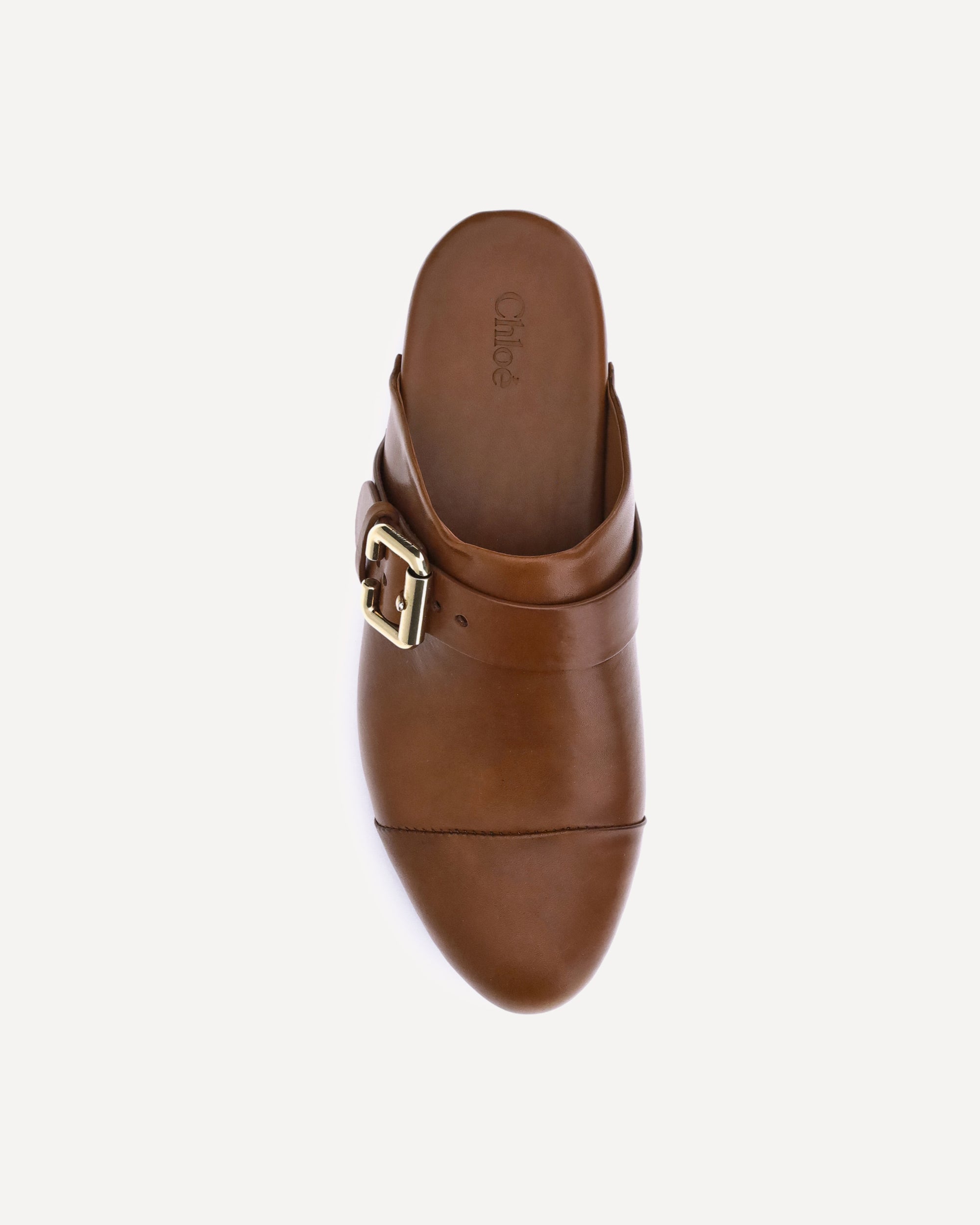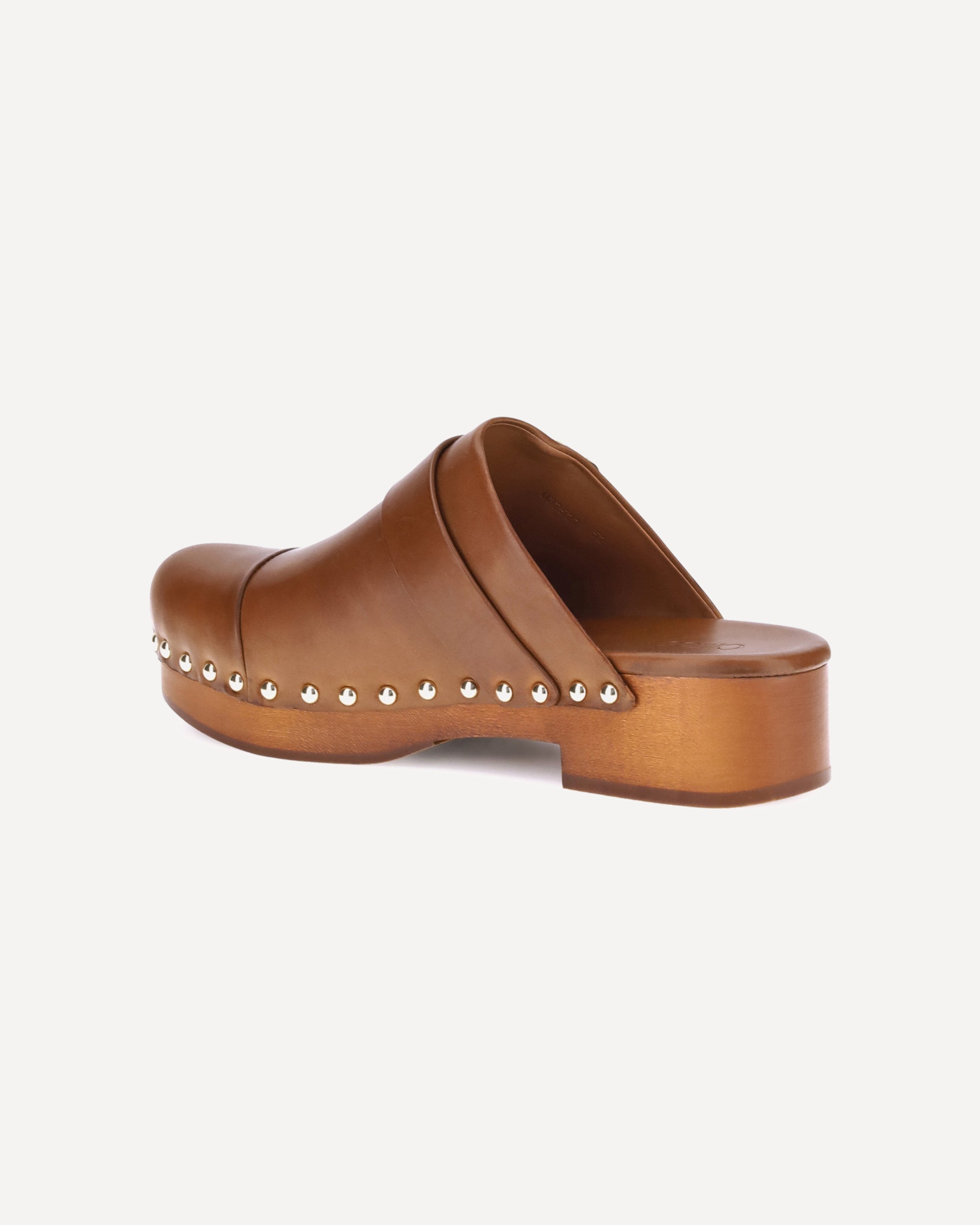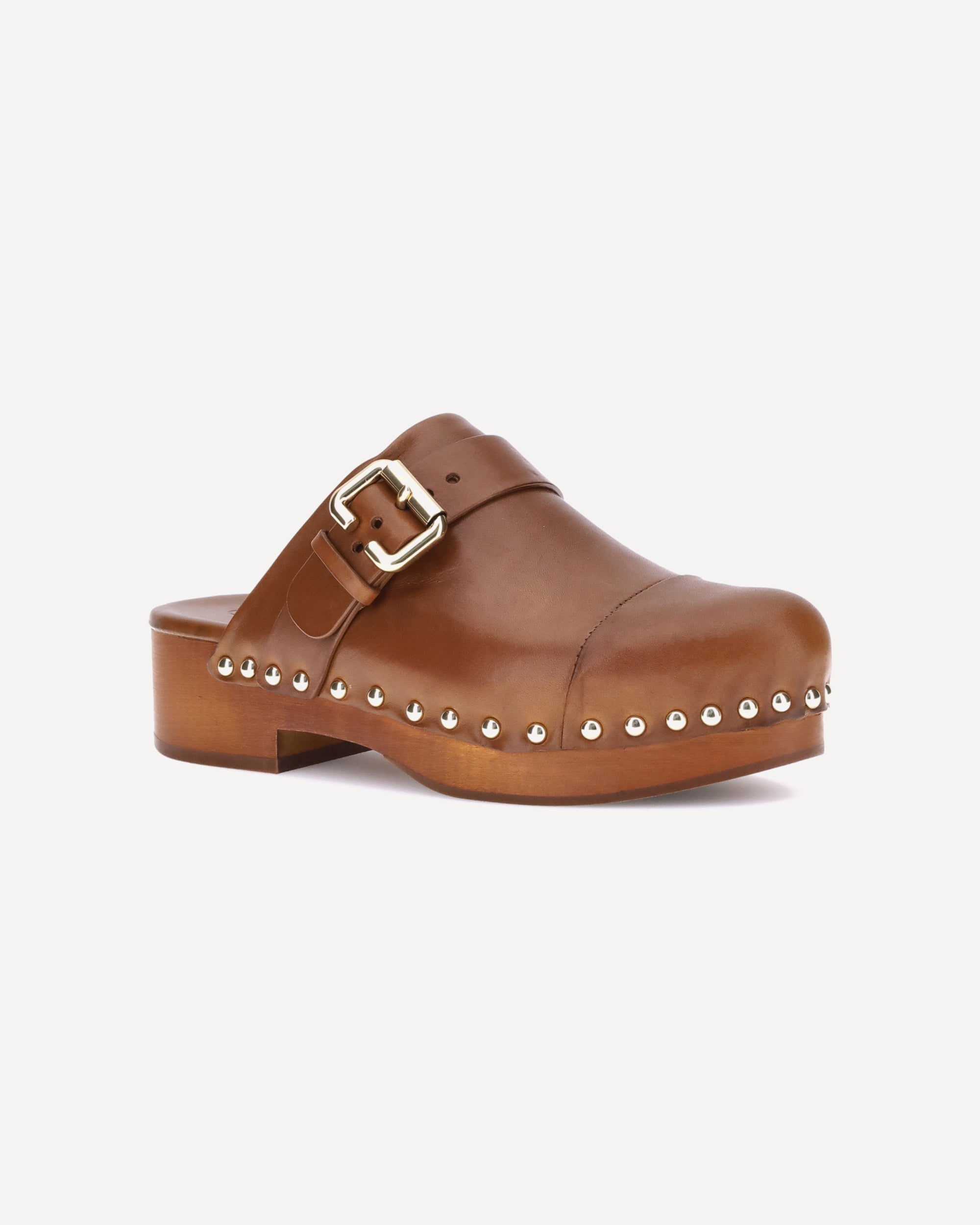 The Jeannette Mules by Chloé reinterpret the classic clog model with a bold, contemporary style. Made of soft calfskin, they feature a solid wooden platform and a low wide heel for stability and comfort. The round toe, golden studs and iconic Paddington buckle complete the design with a distinctive touch and boho-chic character.