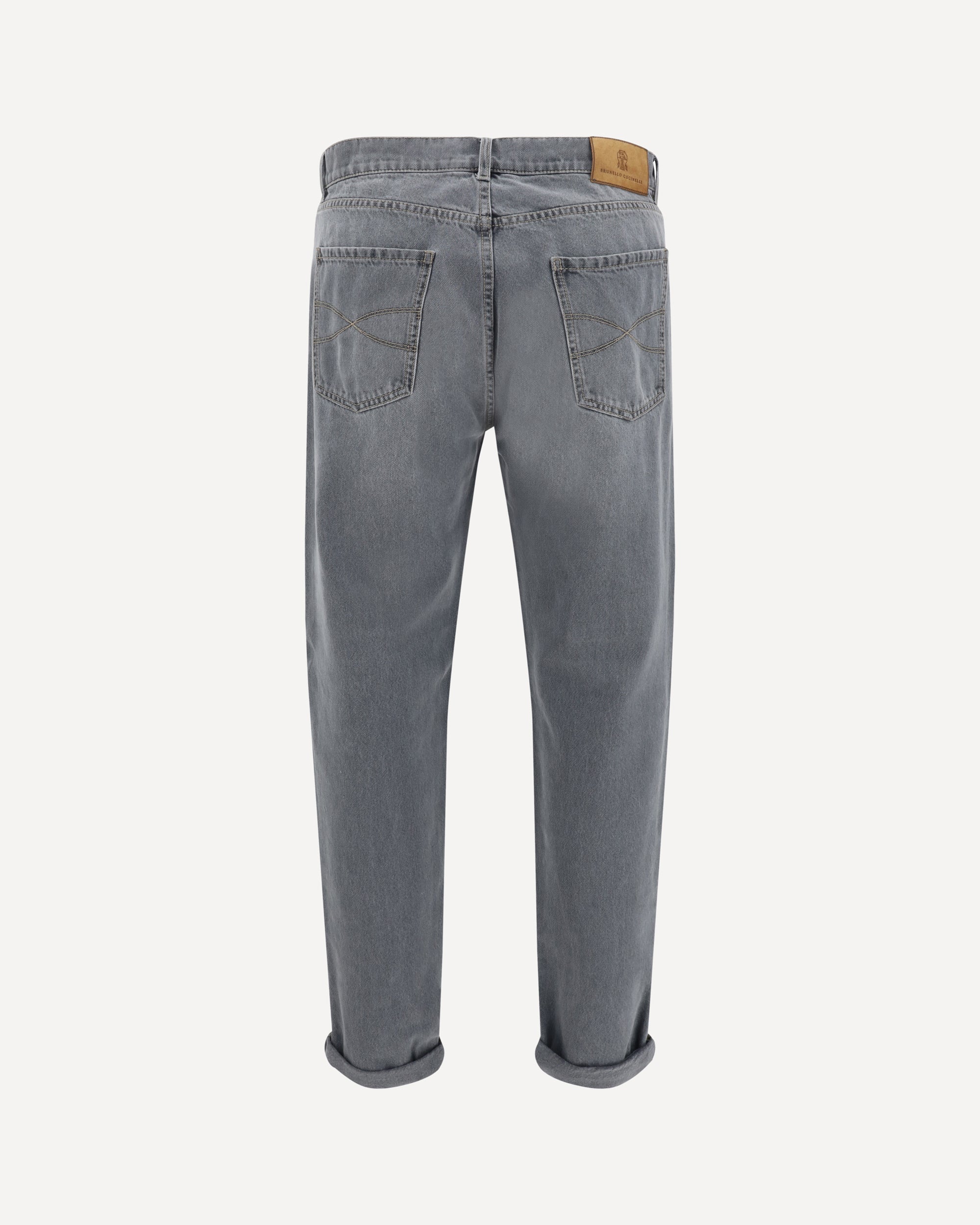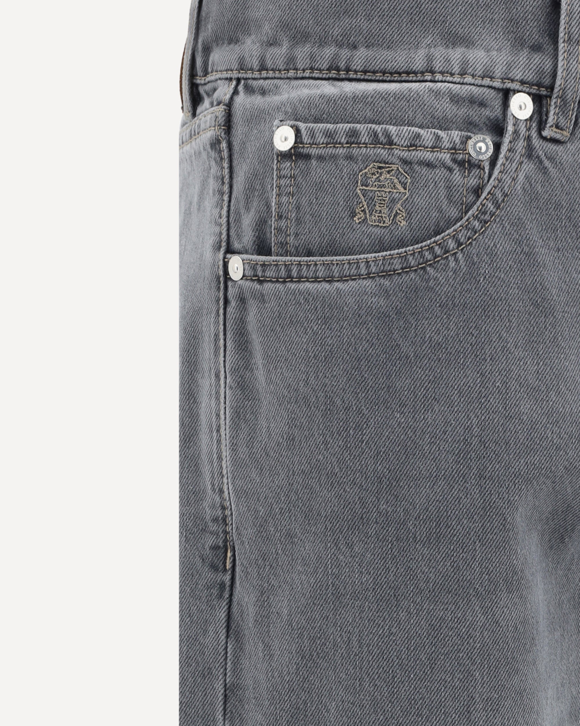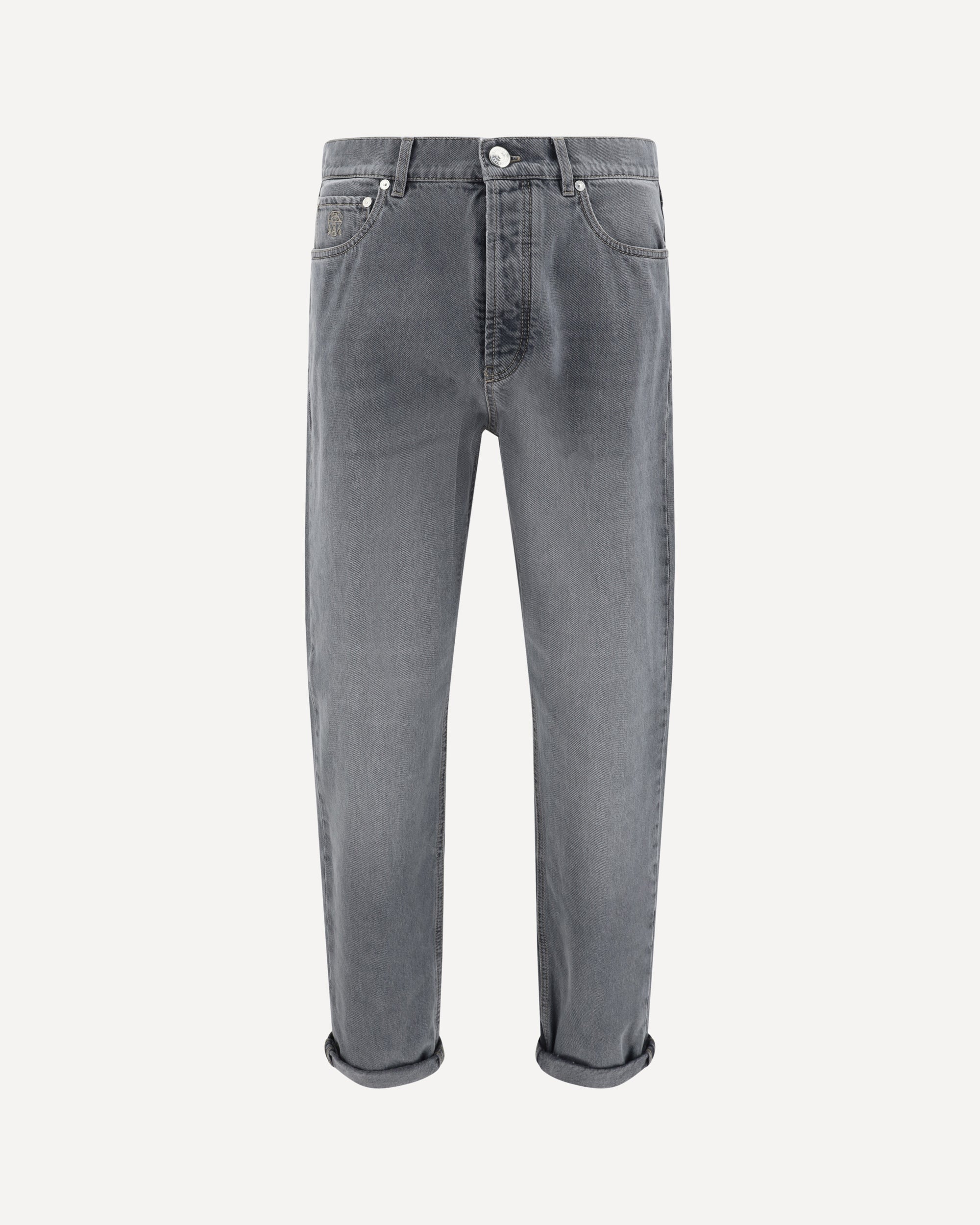 Brunello Cucinelli's five-pocket straight cotton Jeans feature a classic denim design with a front button closure and belt loops on the waistband. The brand's iconic pressure-printed signature leather patch is applied to the back, adding a distinctive, high-quality touch. The turn-up hem gives a tailored detail, completing a sleek and contemporary look. A pair of refined jeans, ideal for a casual-chic look.