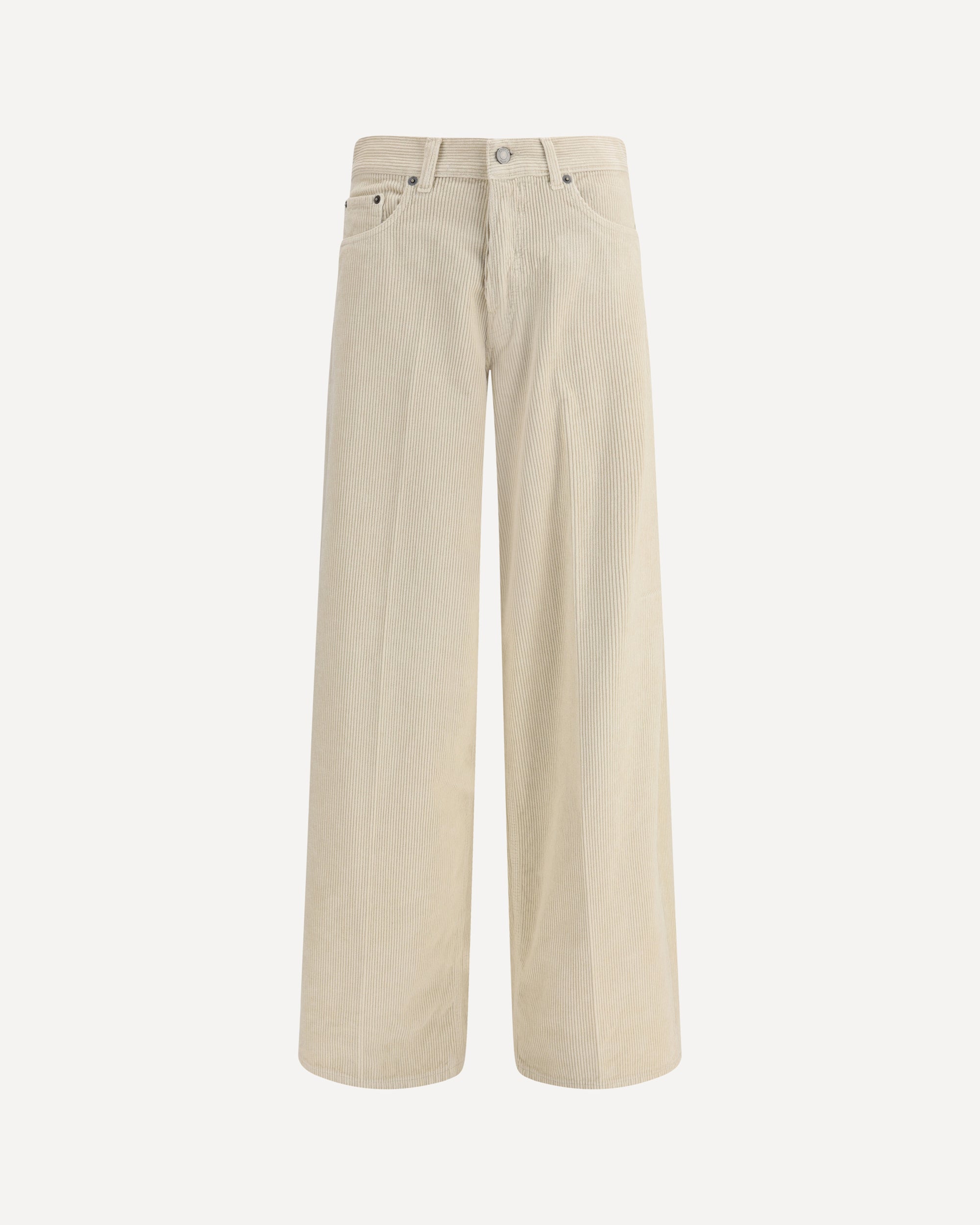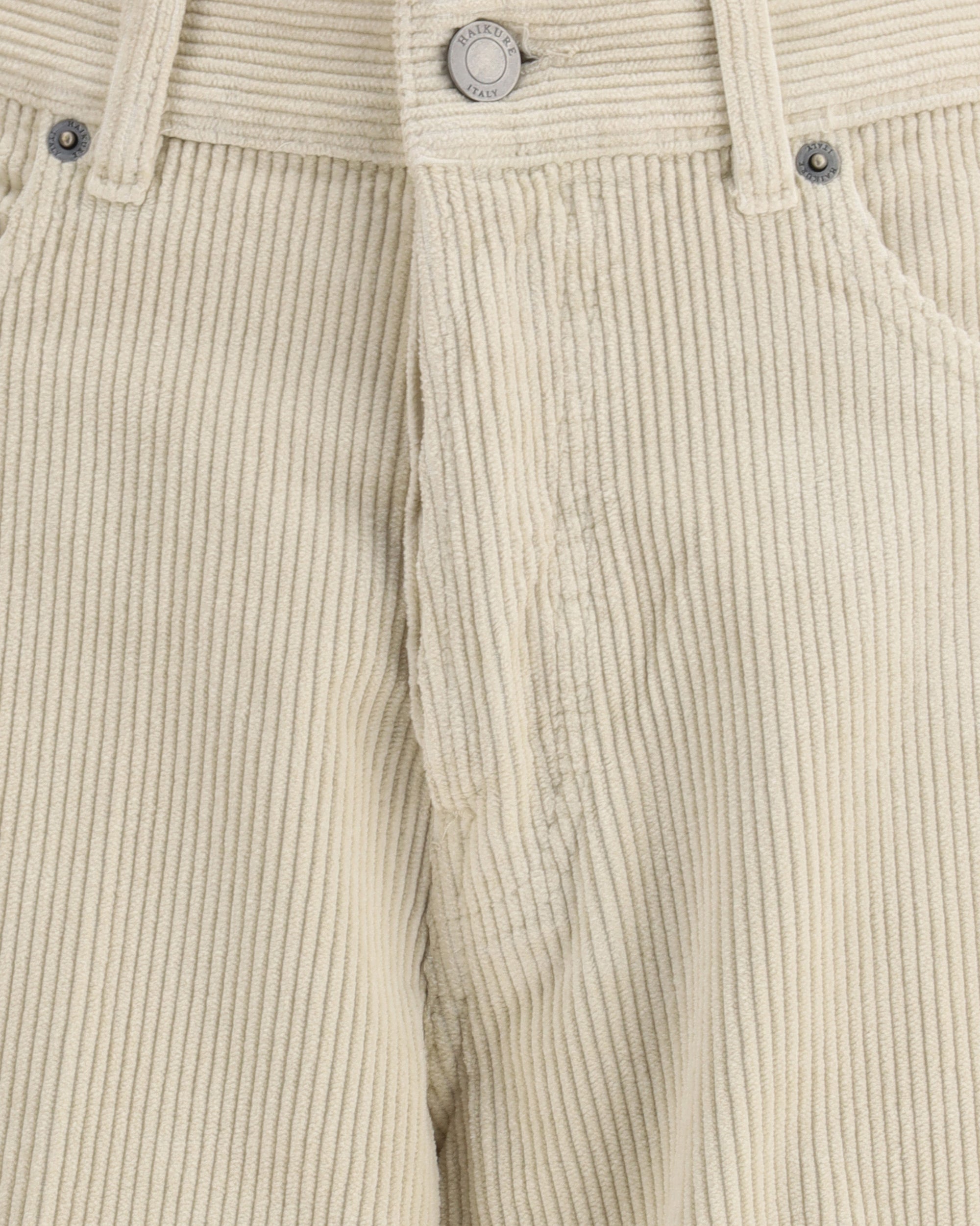 Cotton Pants by Haikure with a corduroy design, featuring a five-pocket pattern and wide legs. The front closure is buttoned, while the belt loops at the waist allow for belt wear. Completing the garment is the logoed leather patch applied on the back, a distinctive detail of the brand. A perfect mix of comfort and style with a contemporary casual taste.