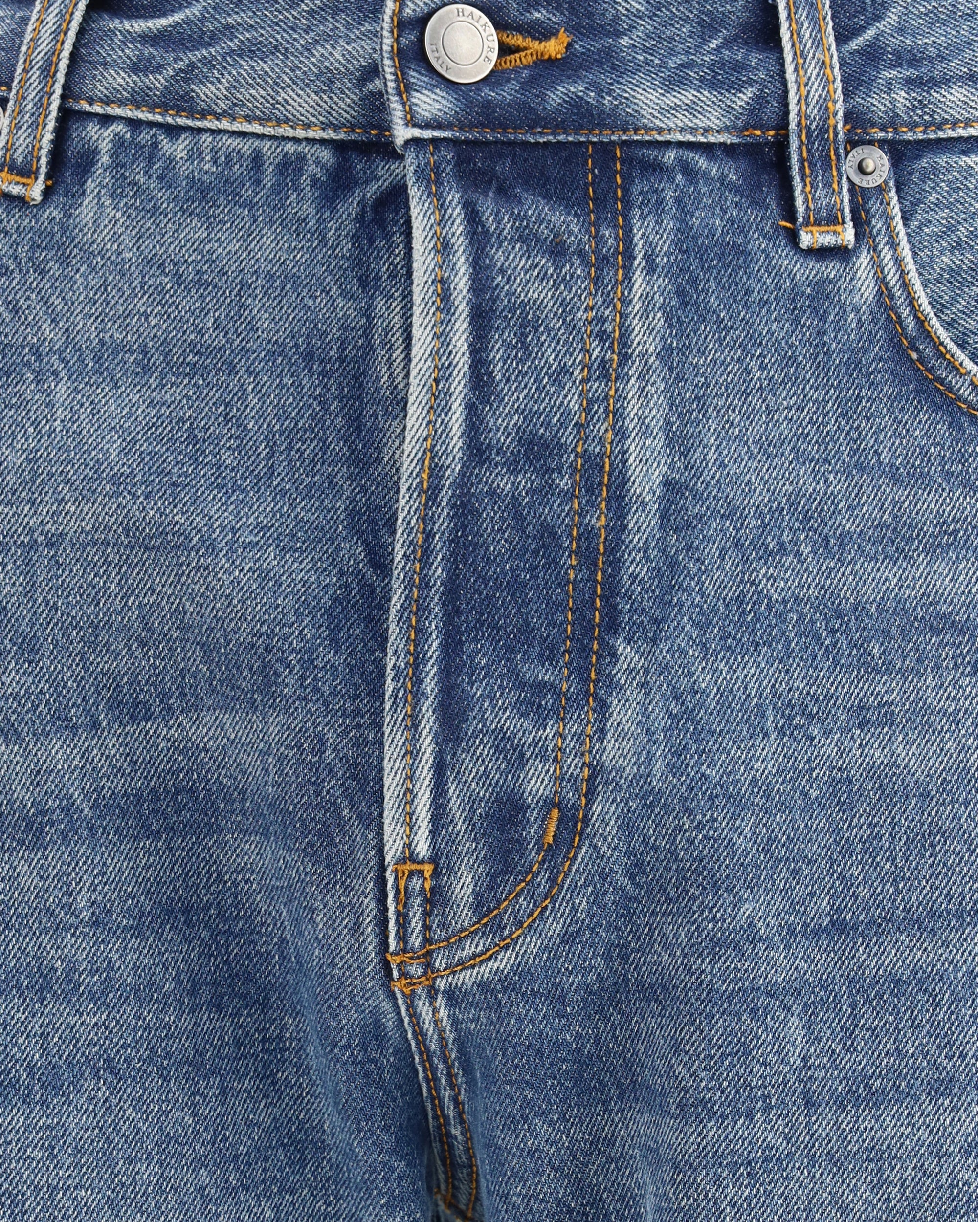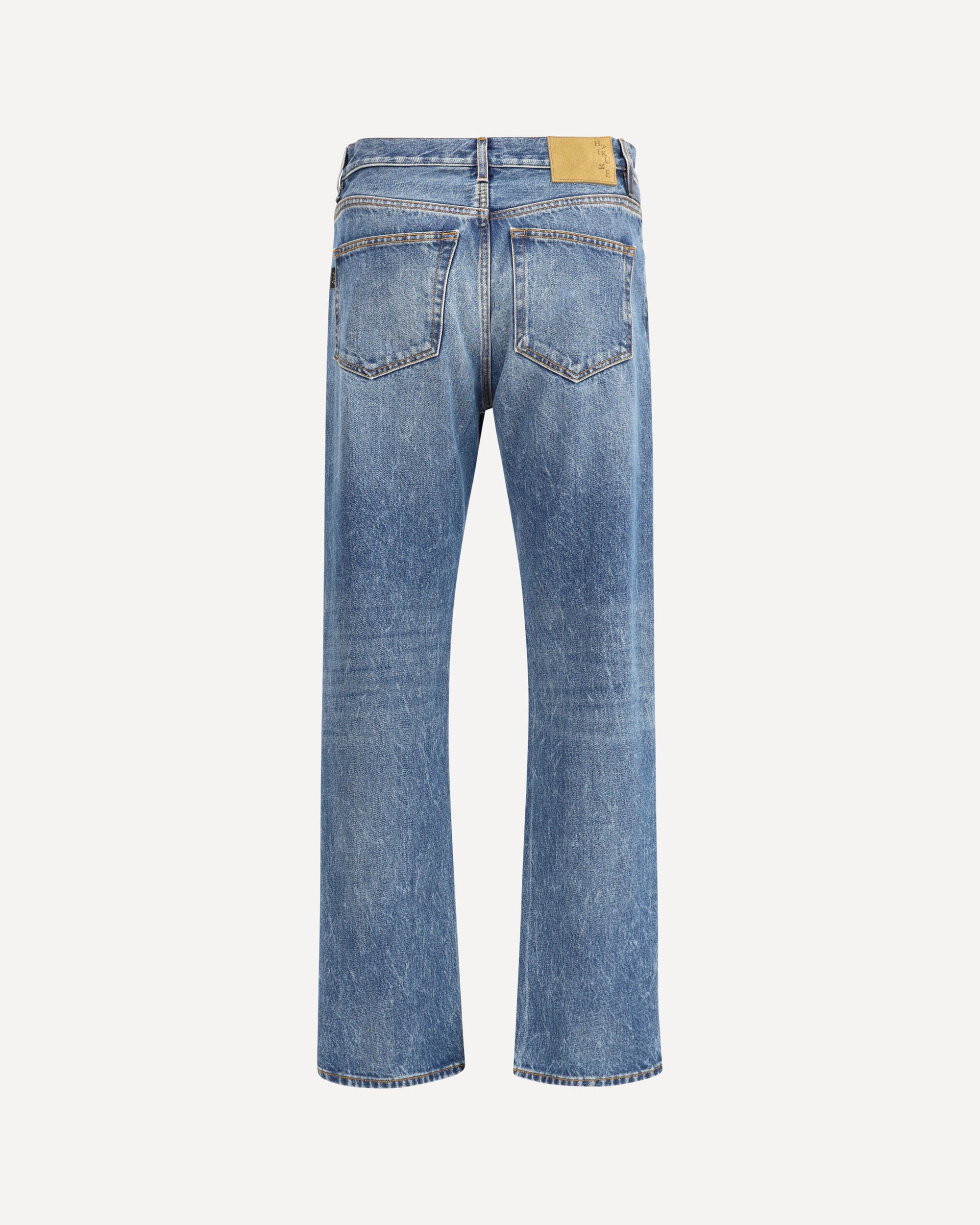 Cotton Blake Jeans by Haikure, featuring a five-pocket straight fit, front button closure, front button closure, belt loops for waistband, iconic leather patch with signature brand pressure print applied at back, monochrome vintage effect pattern, regular fit.