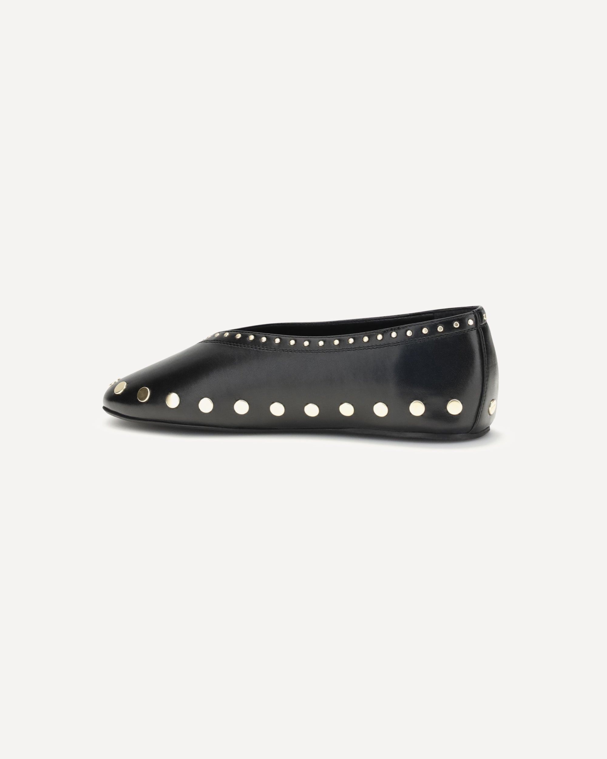 The Jenny Ballerinas by Ganni feature a slip-on design with a rounded toe and flat sole. The model is finished with gold-tone studs along the trim, adding a distinctive and contemporary detail to the design.