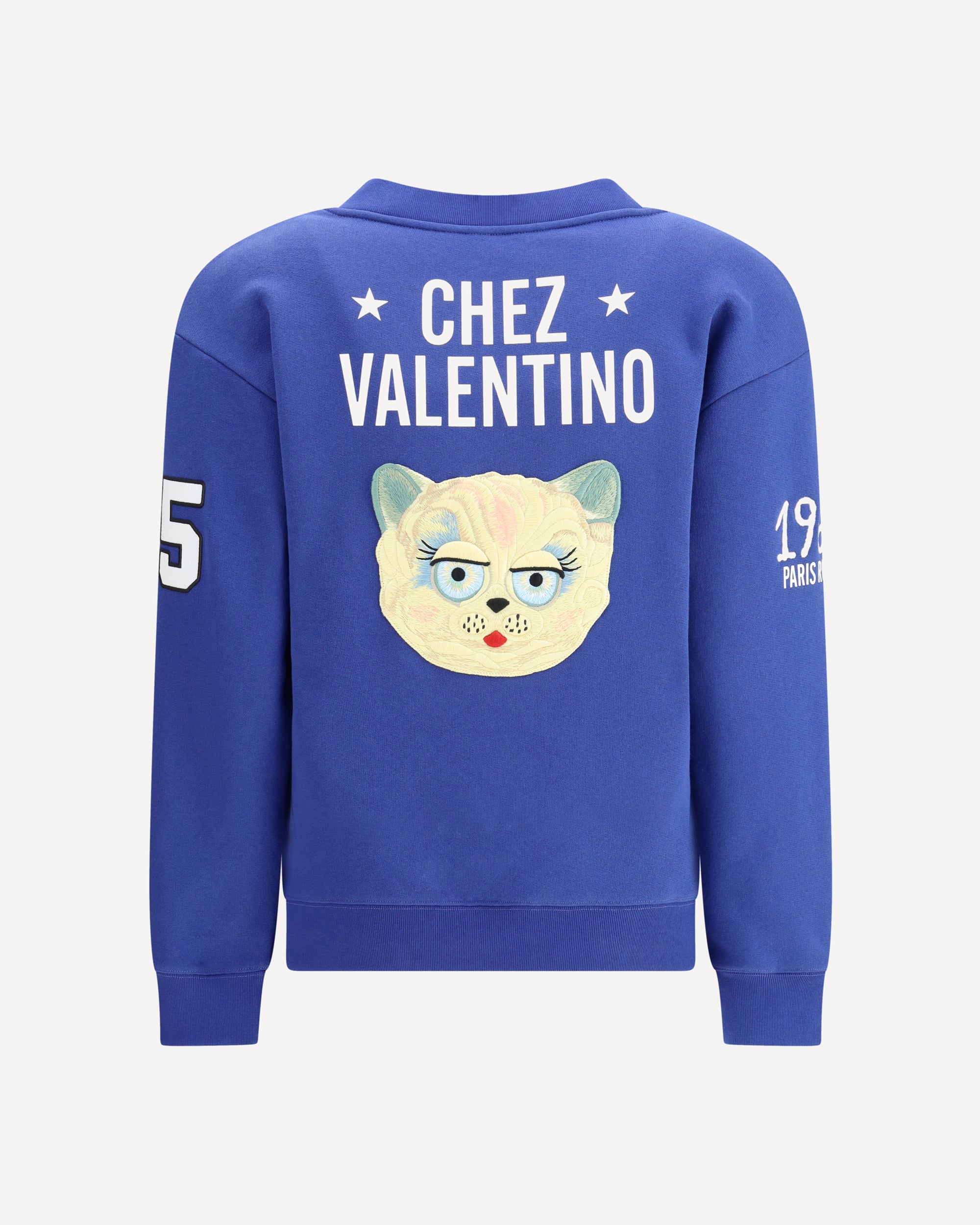 Valentino's cotton Sweatshirt features a refined V-neck and long sleeves that ensure comfort and style. A patch with the letter V stands out on the front, while on the back a "Le Chat de la Maison" embroidery adds an original touch. Ribbed edges complete the design with thoughtful, modern details.