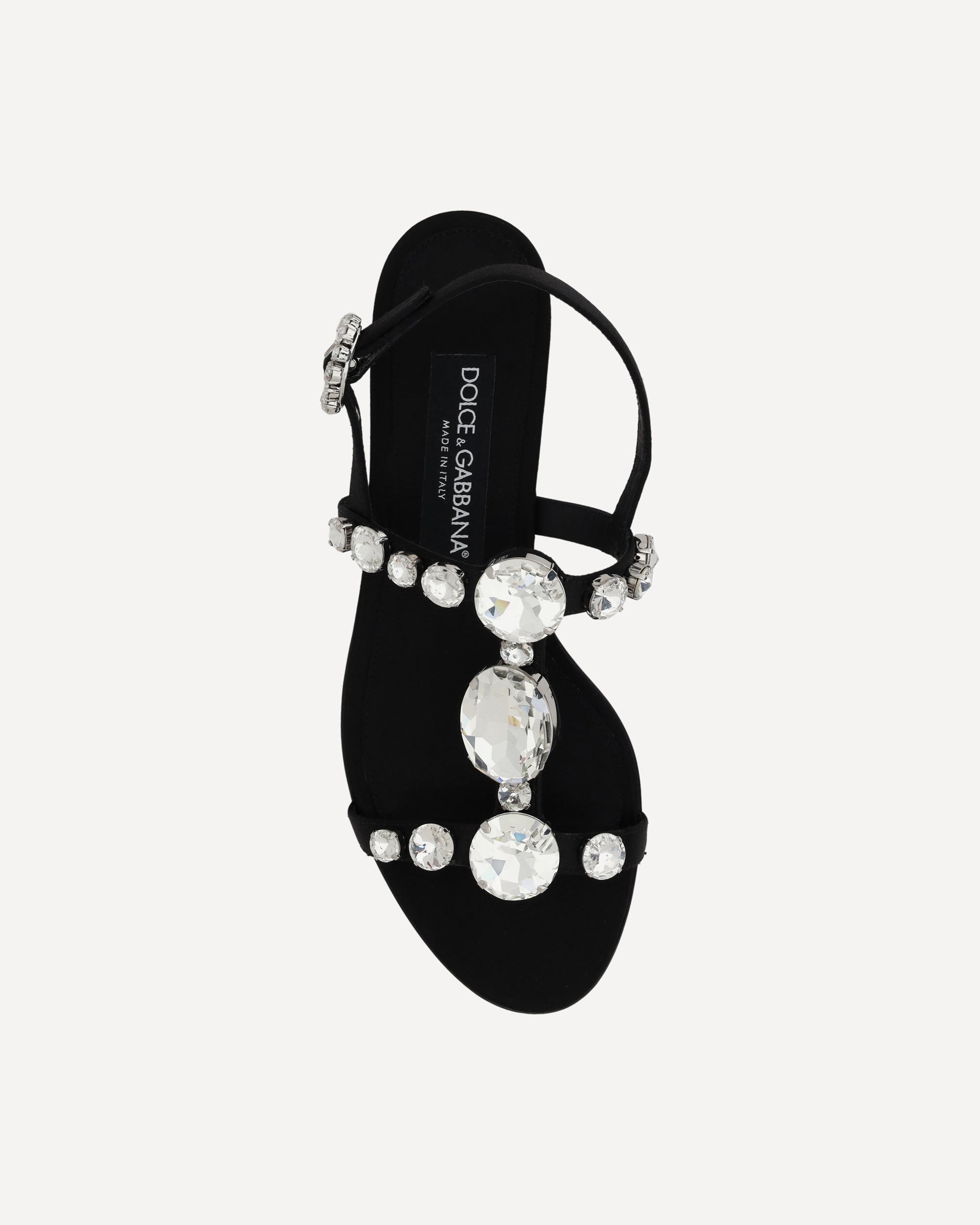 Dolce & Gabbana's satin jeweled sandals feature an elegant caged design with stitched stones, an almond toe and a block heel for comfort and style. The heel closure is adorned with a jeweled buckle, while the branded insole adds a touch of luxury. A perfect blend of sophistication and sparkling details.