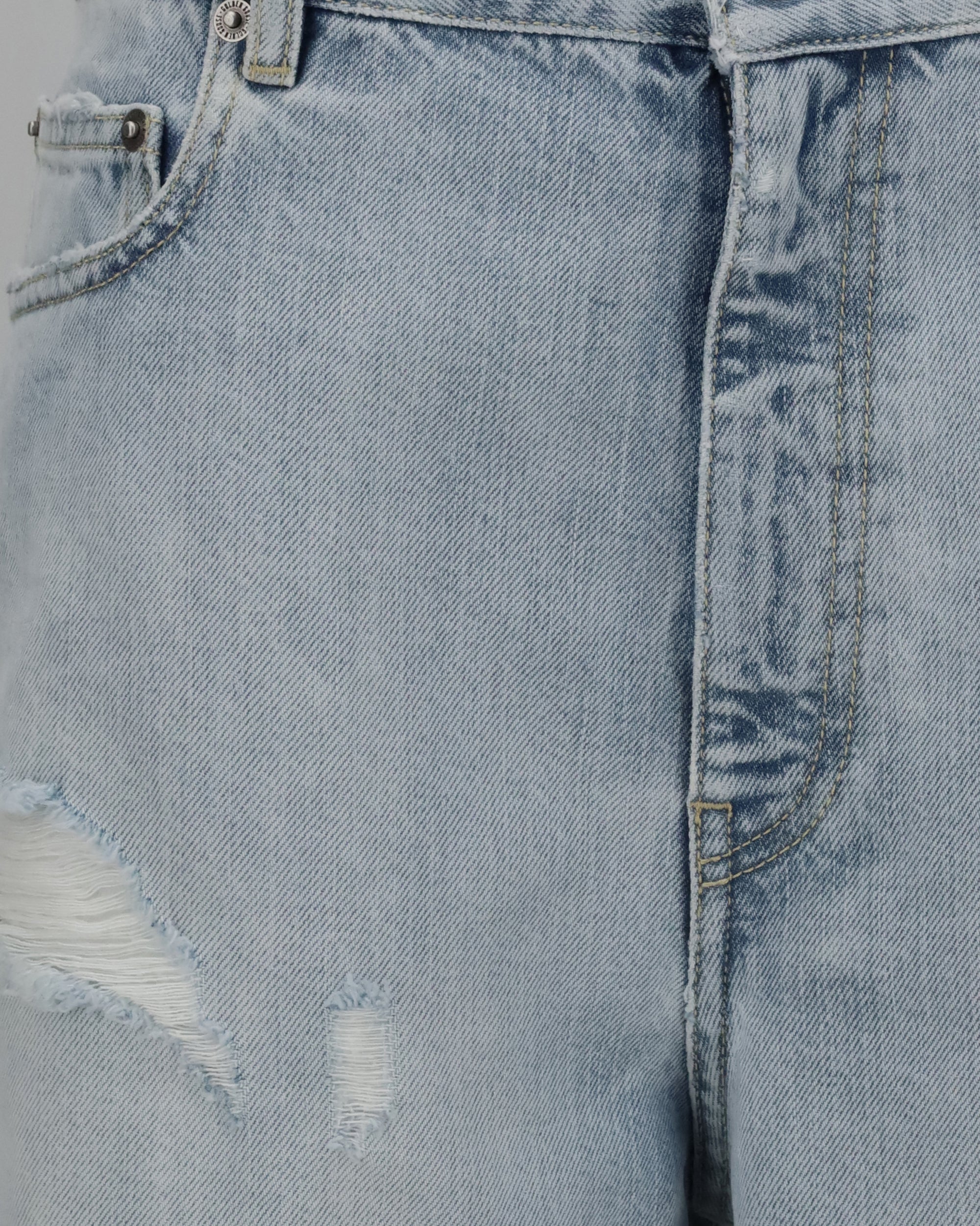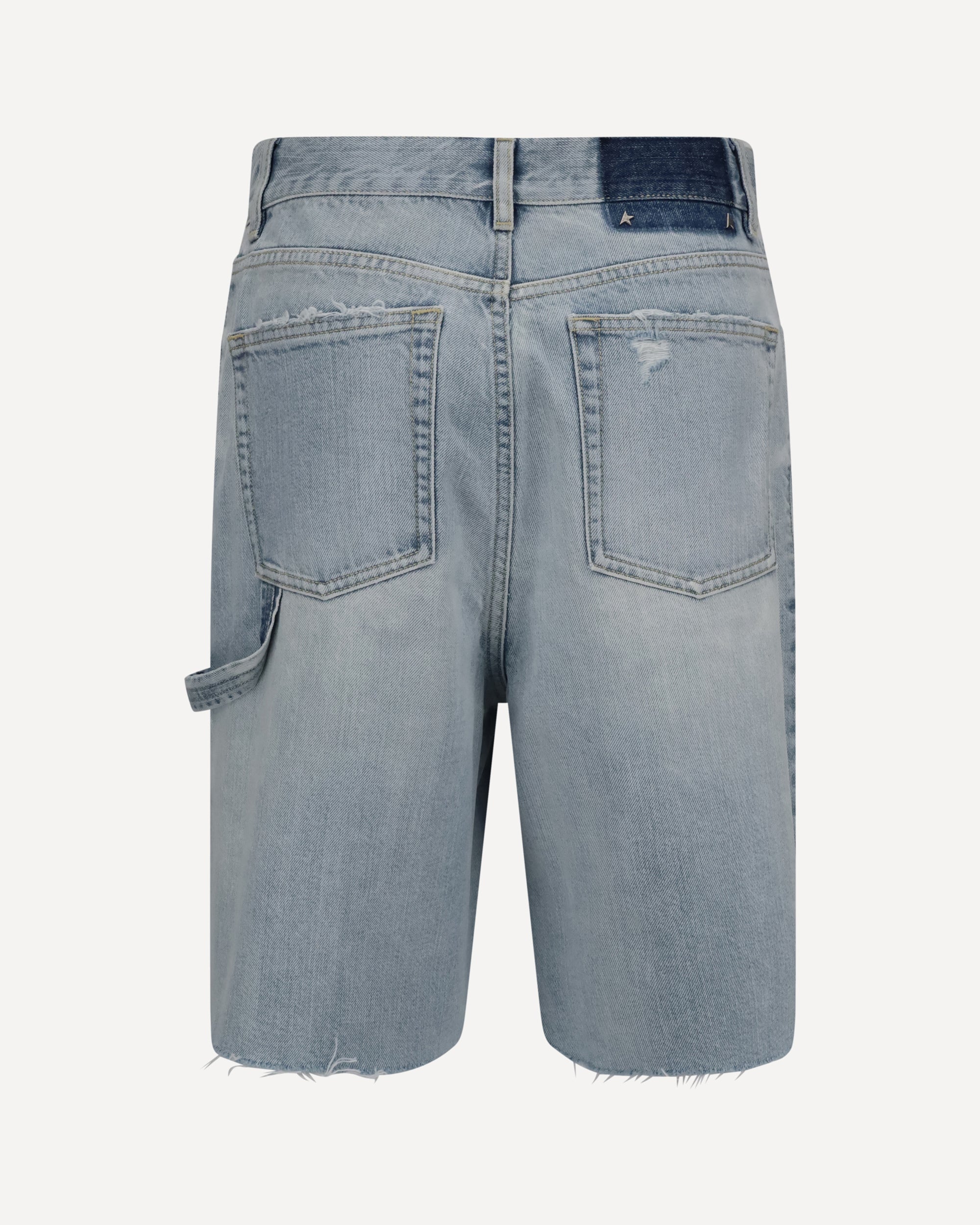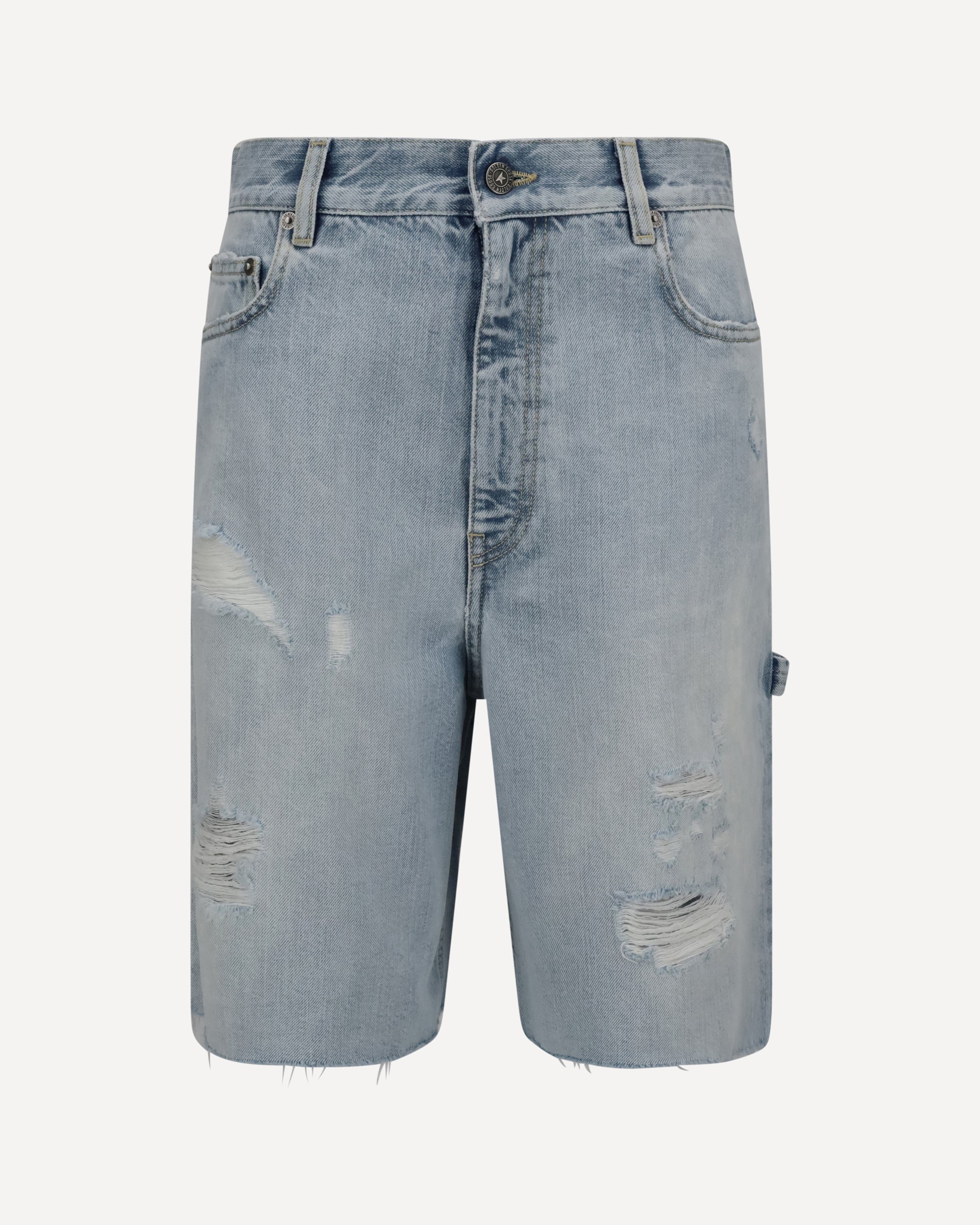 Golden Goose's denim Shorts offer an authentic, vintage-flavored aesthetic, reinterpreting the classic bermuda model with a gritty twist. Made from rugged denim, they feature a five-pocket design, front zip-and-button closure, and belt loops at the waist for an adjustable fit. The frayed bottom and worn effect details with rips give the garment a casual, worn-in look typical of the brand's distinctive style. Perfect for casual outfits with a strong character.