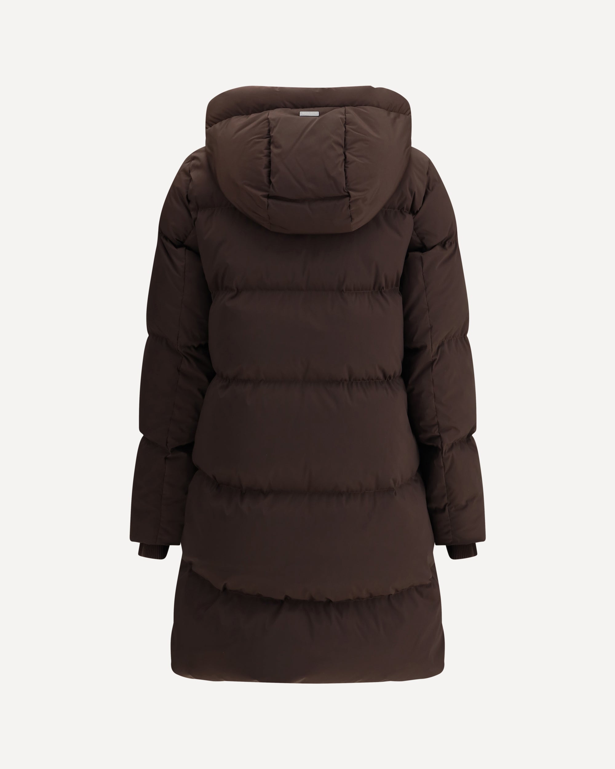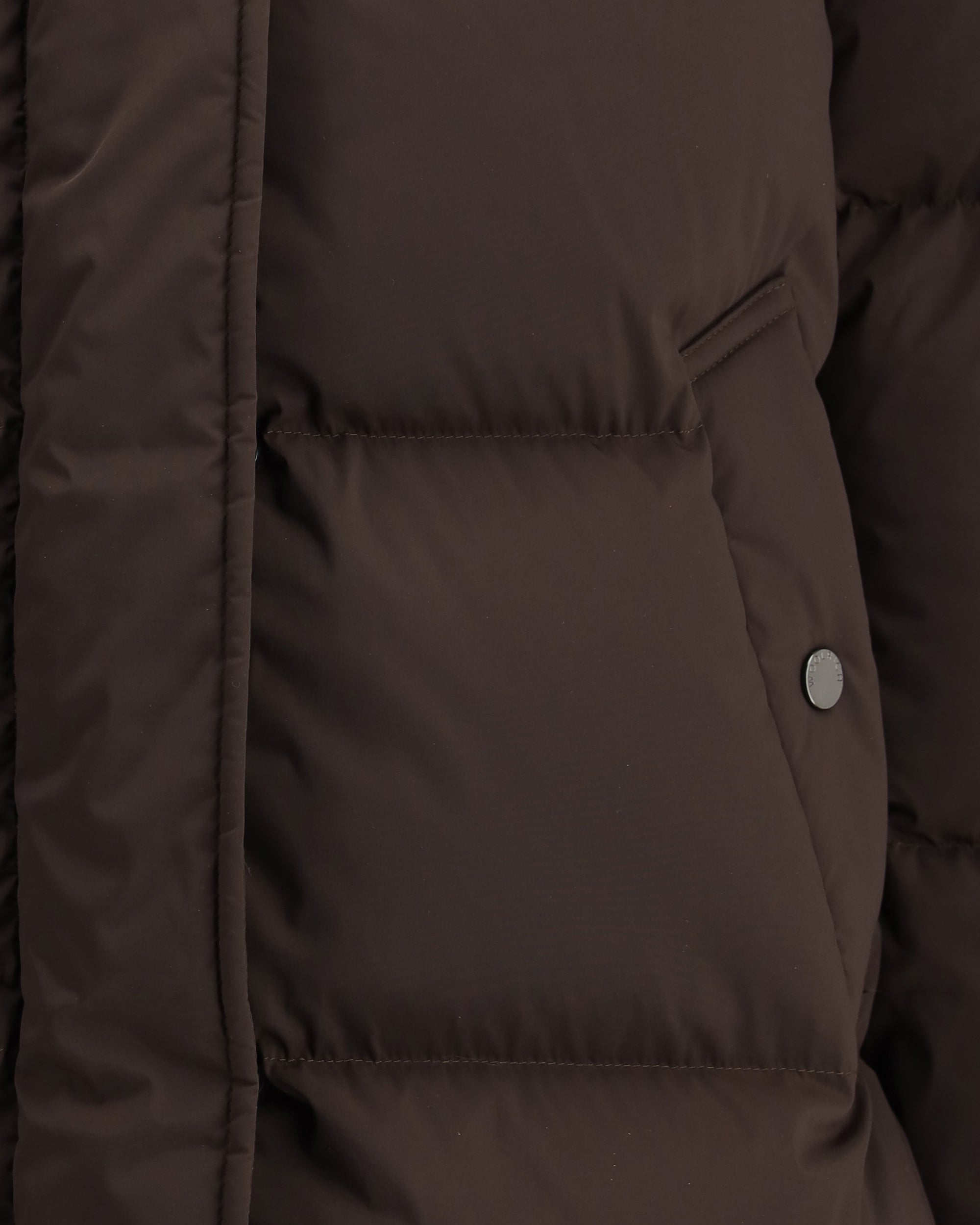 The Kelly Down Jacket by Woolrich combines practicality and contemporary style. Featuring elastic cuffs and a hood, it features a front zipper and button closure, zippered side slits and two welt pockets. The padded and quilted design ensures warmth and comfort for any occasion.