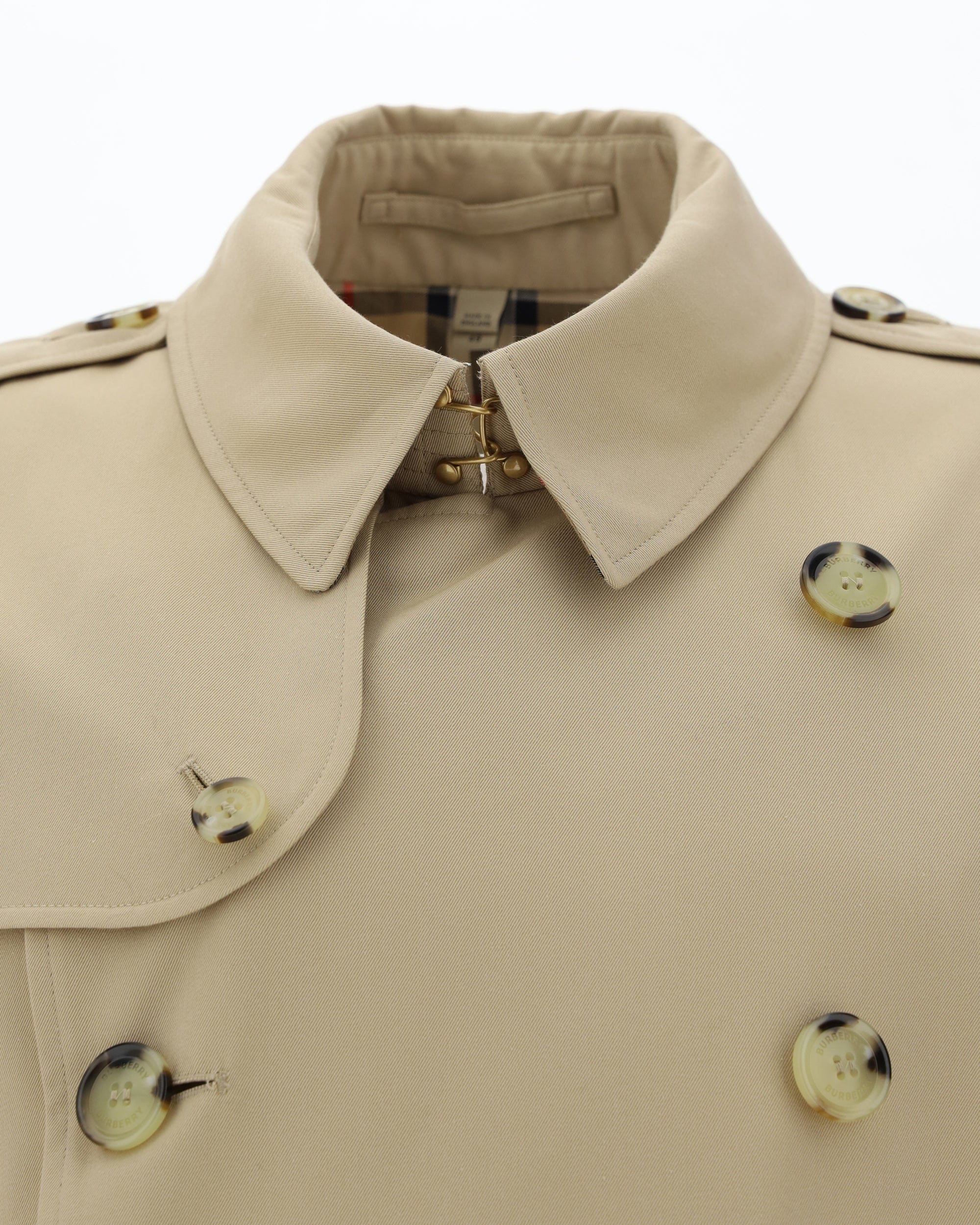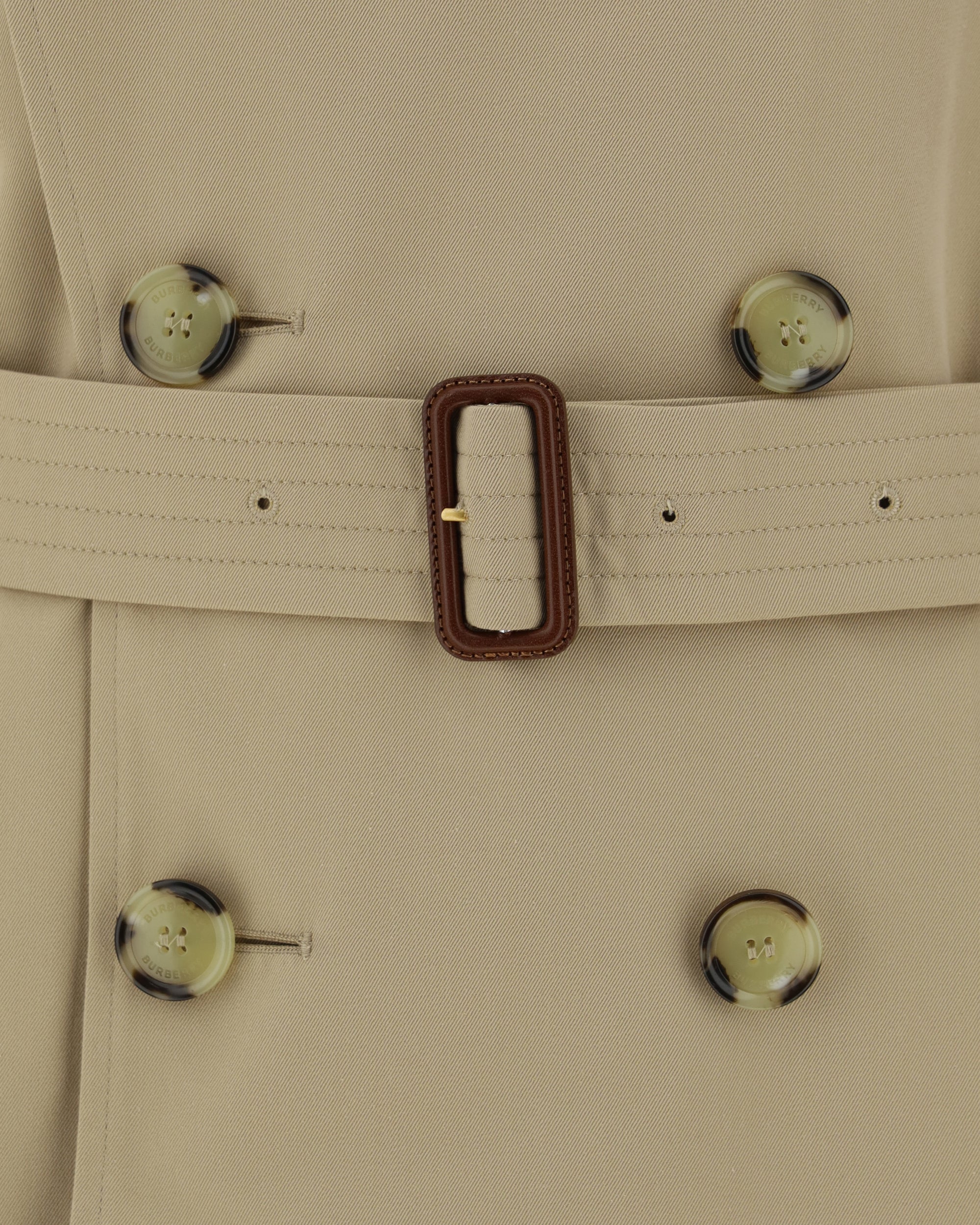 Cotton Kensington Coat by Burberry featuring a classic collar, a double-breasted front button closure, two welt pockets on the front, an adjustable waistband using a removable matching belt, a back slit, a monochrome pattern, and a regular fit.