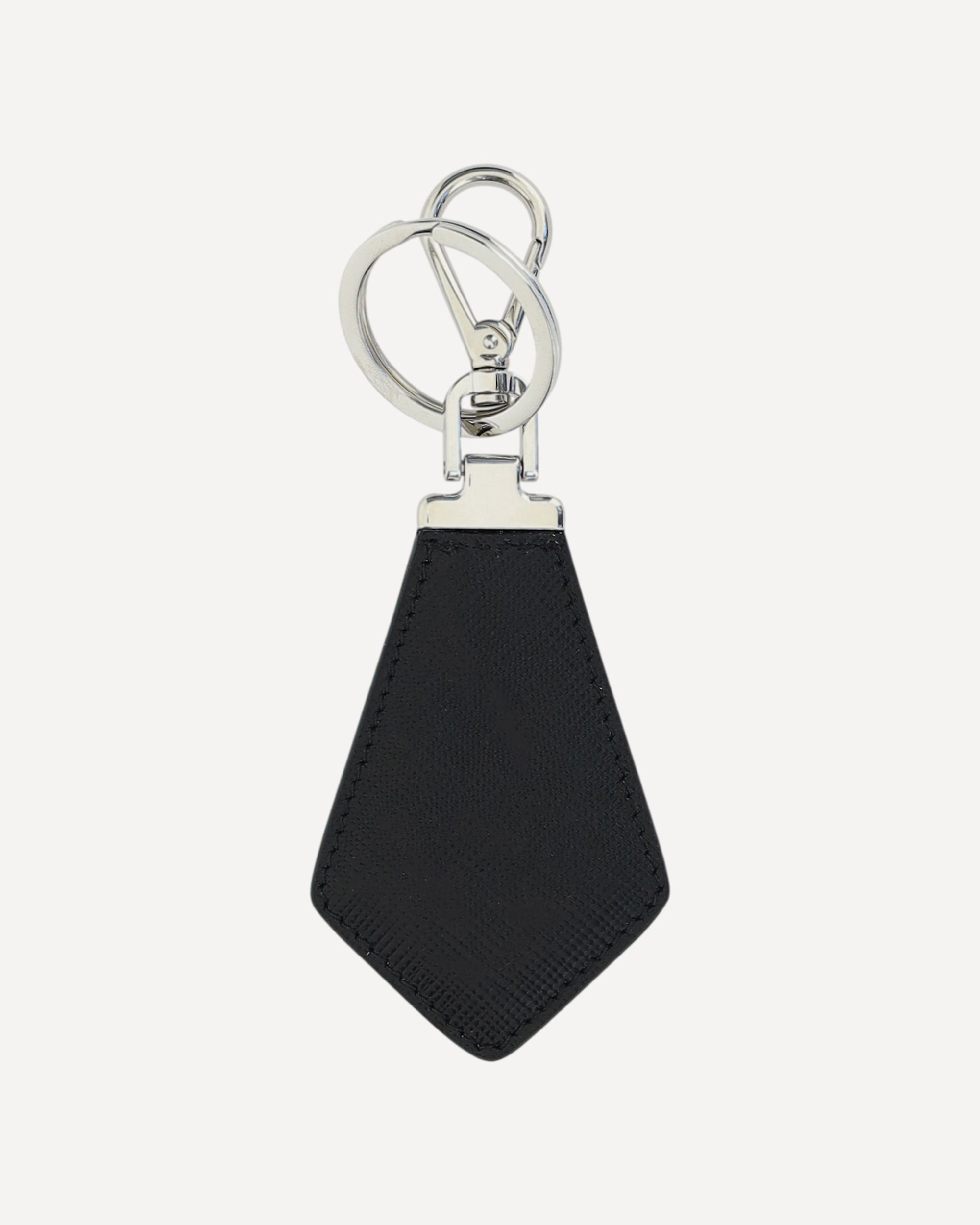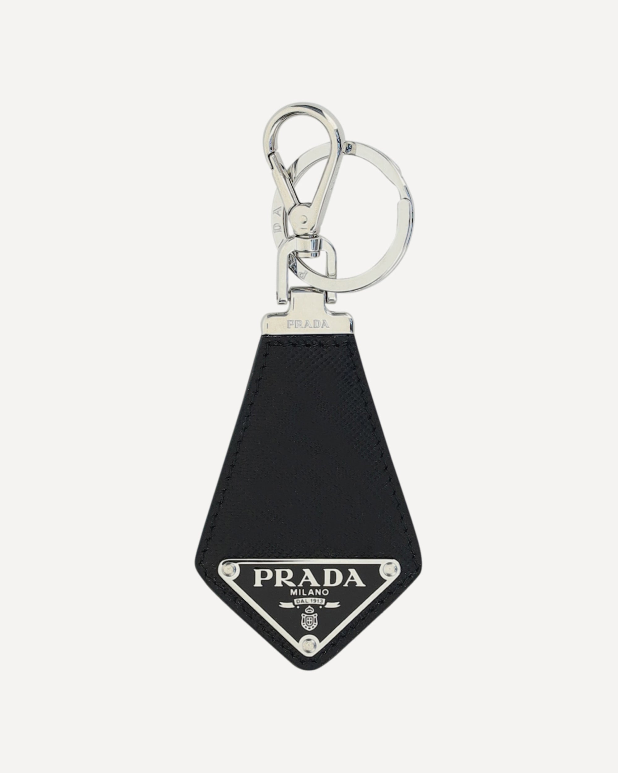Prada's Saffiano leather Keychain is a compact and refined accessory, embellished with a pendant featuring the brand's iconic logoed triangle. Featuring a practical silver-plated hook with snap hook, it combines elegance and functionality, perfect for adding a distinctive touch to keys or bags.