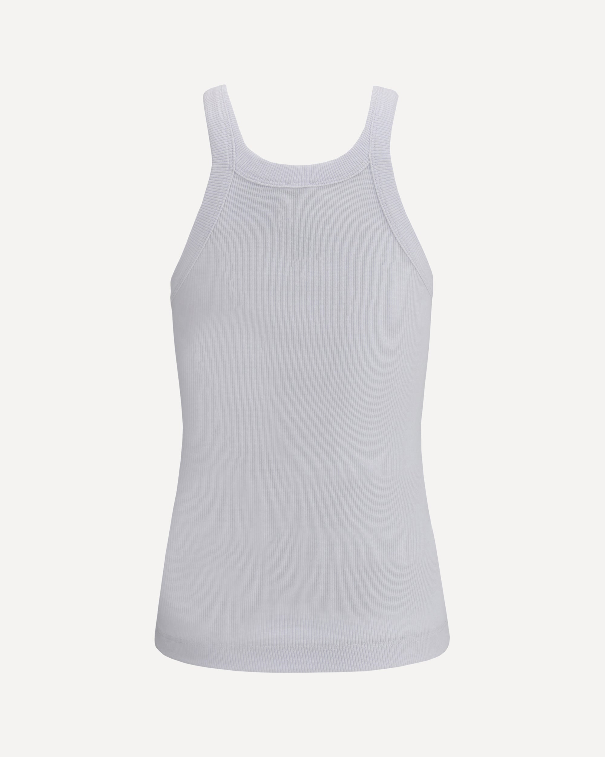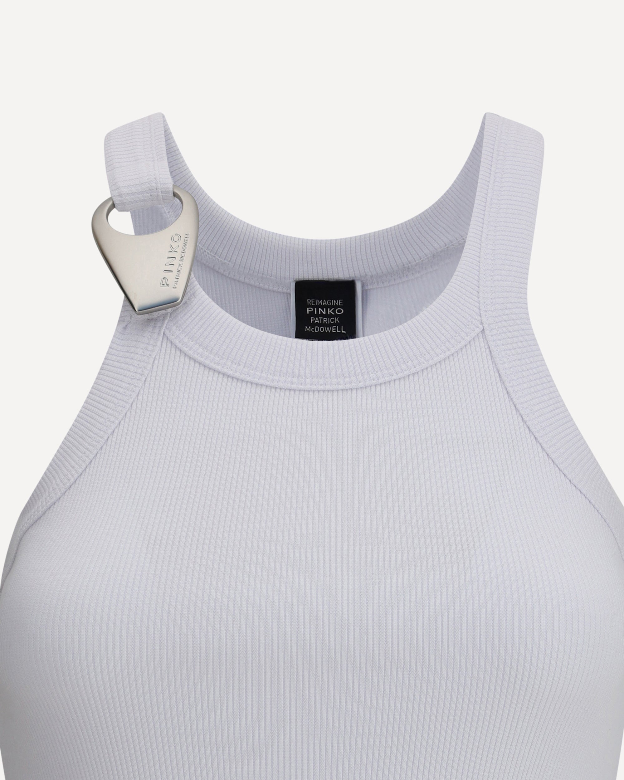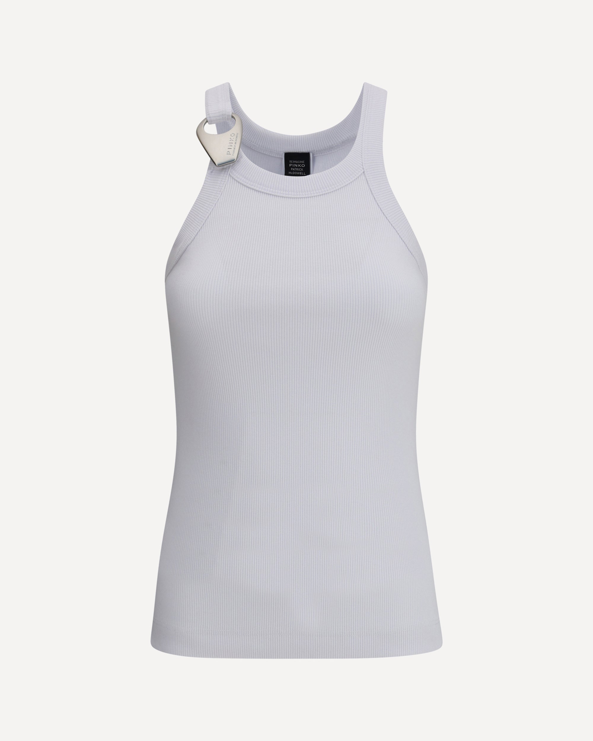 Pinko's Ribbed Top is distinguished by its low-cut design and fitted silhouette-enhancing silhouette. Completed with a metallic logo detail on the shoulder, it adds a distinctive and contemporary touch to an essential garment.
