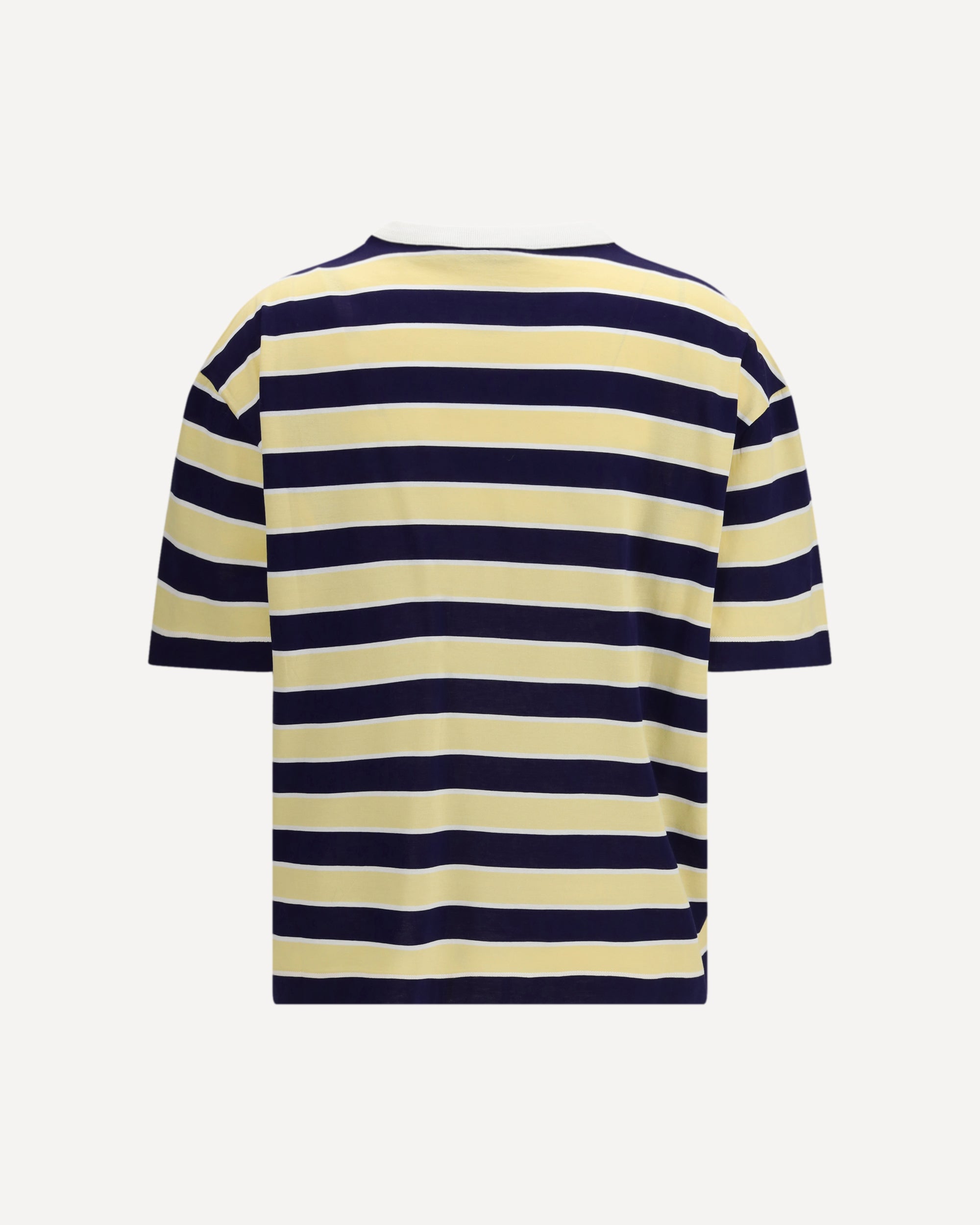 The striped filo di Scozia T-shirt by Prada features a clean design enhanced by distinctive graphic details. Designed with an oversized fit, it is finished with a contrast ribbed crew neckline, short sleeves, and a front patch pocket with a tailored logo label. A straight hem completes the modern silhouette, blending comfort with refined style.