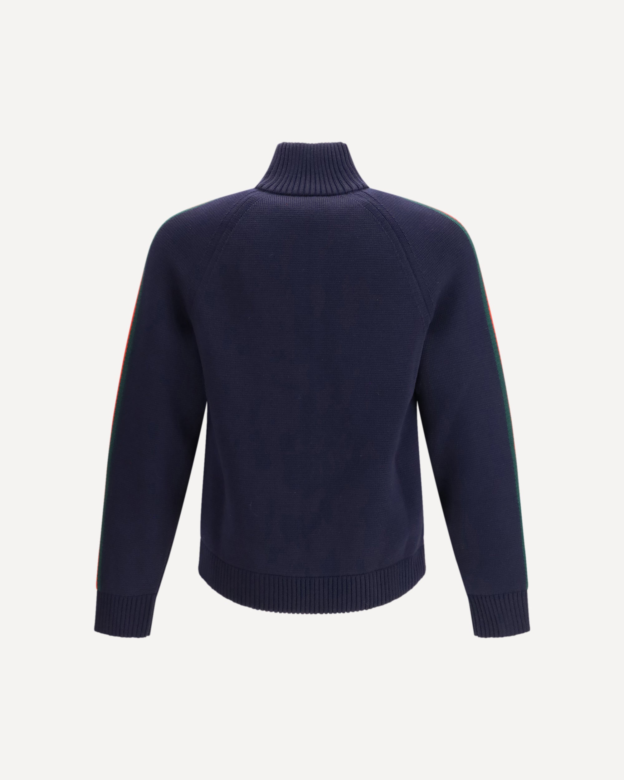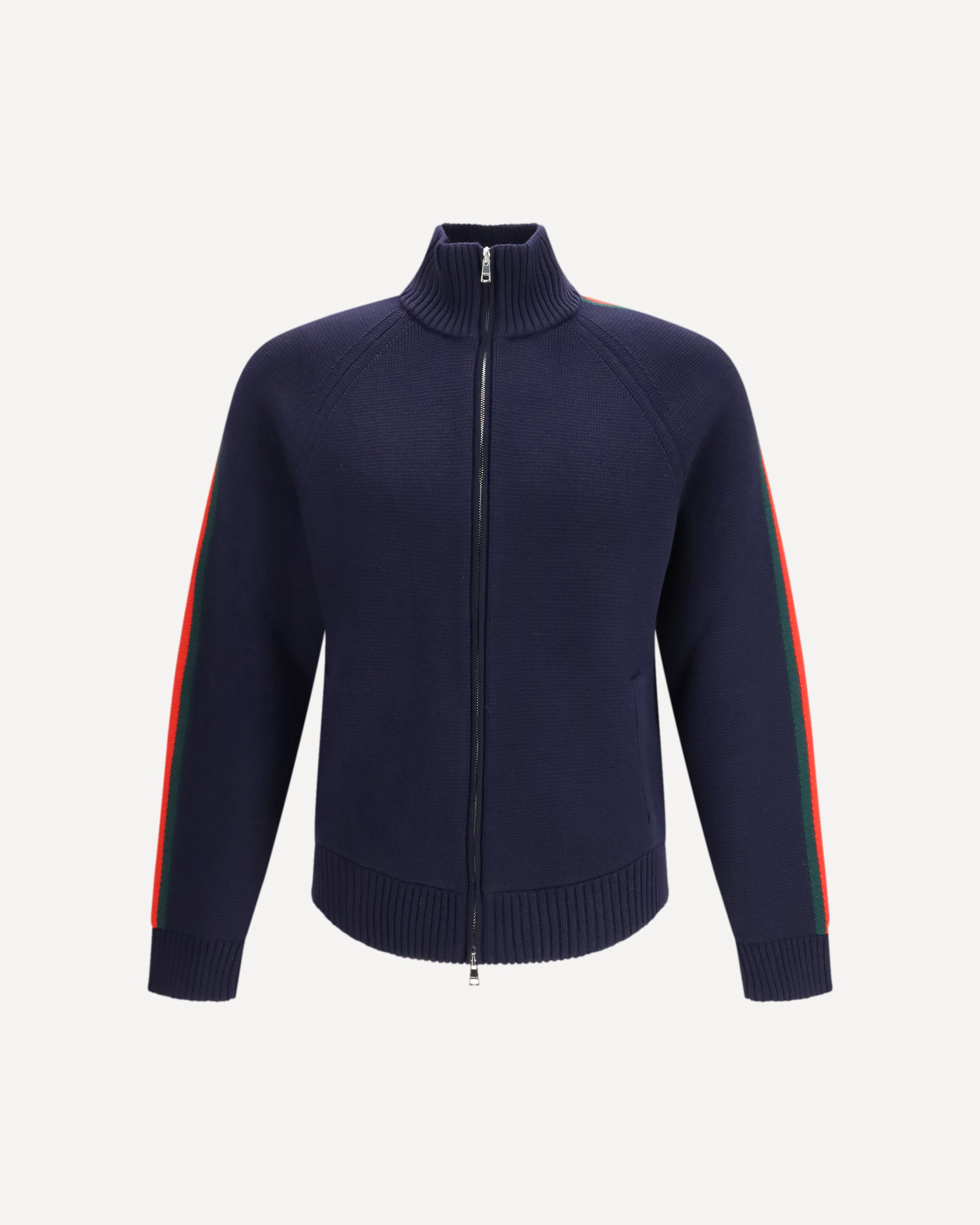 The zip-up Jacket by Gucci is crafted from knitted wool with a textured stitch and features a GG shearling interior for added warmth and refinement. The design is finished with iconic Web trims, a stand collar, and practical front pockets. A front zip closure completes the piece, combining comfort with a distinctive, luxurious aesthetic.