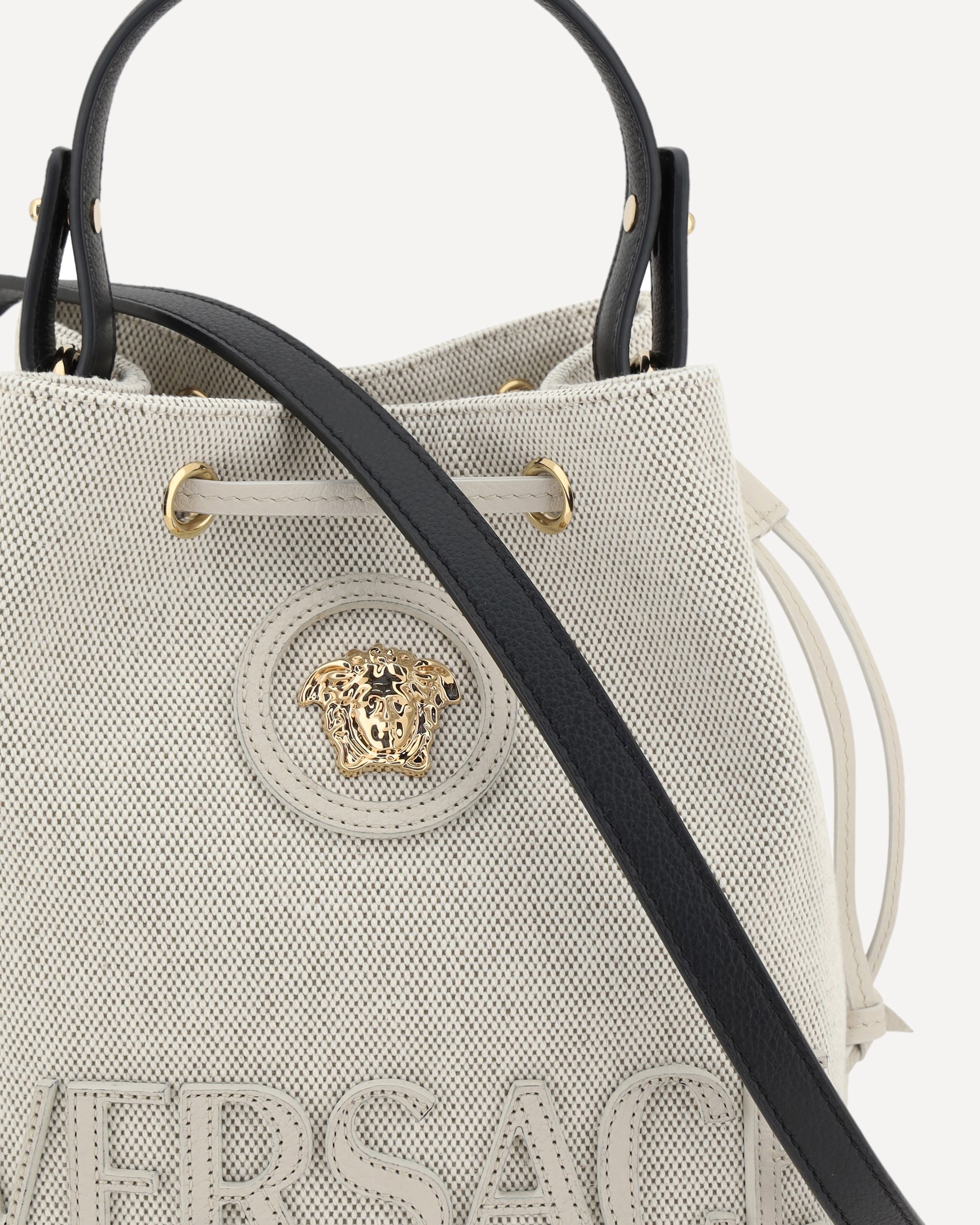 The La Medusa Bucket Bag combines iconic style with functionality. The top closure with adjustable drawstring ensures practicality, while the flat shoulder strap allows for comfortable carrying. The front features a stitched monogram and plaque with the iconic Medusa logo, immediate symbols of the brand. The interior consists of a single compartment, simple and essential.