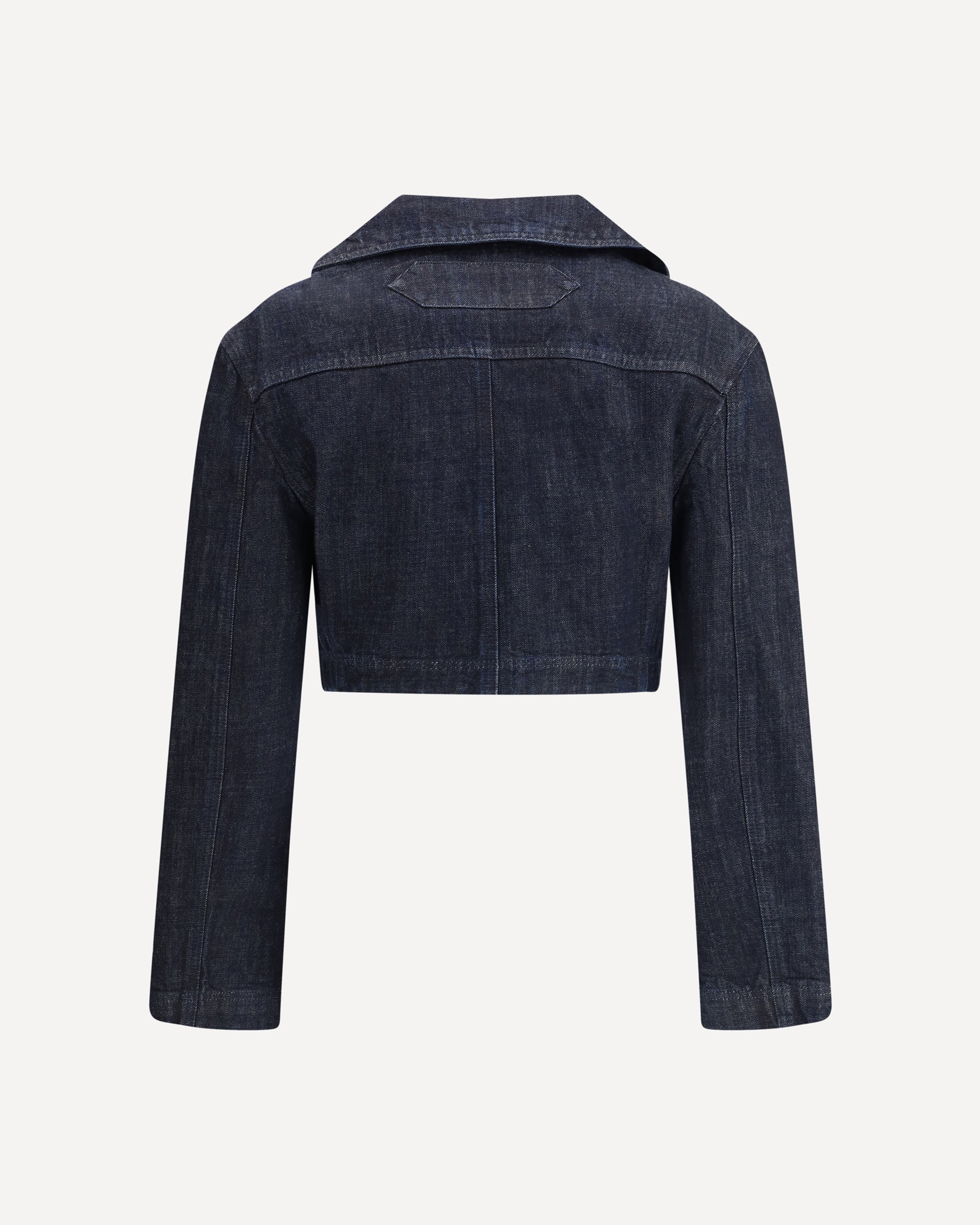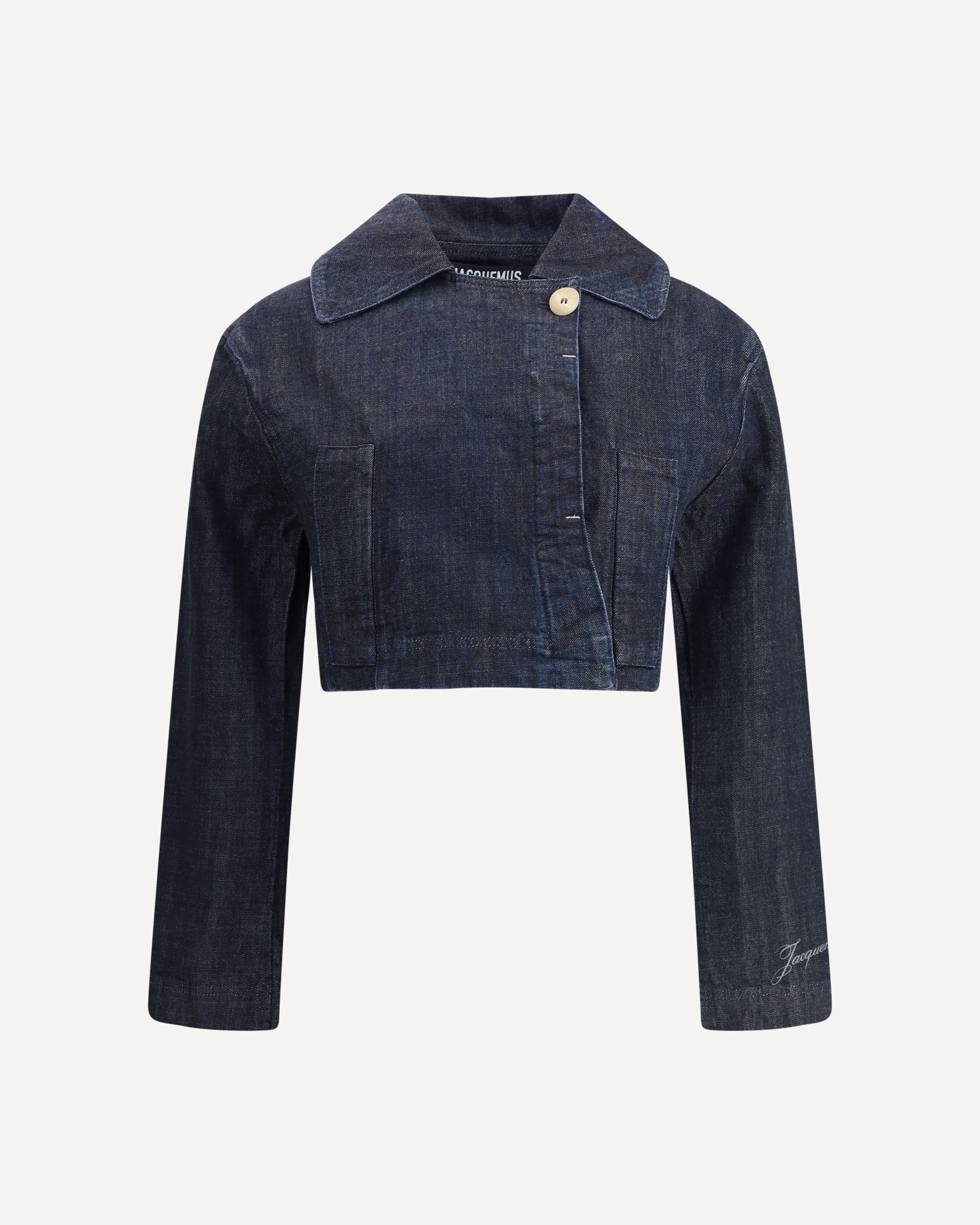 La Veste De-nÎmes Marino cotton Jacket by Jacquemus features a modern and sophisticated denim design. Cropped design with a classic collar and hidden button front closure for a clean, minimalist look. Two side welt pockets add functionality without compromising the elegance of the garment. Perfect for a casual-chic look, this jacket is a must-have to complete your summer outfits.