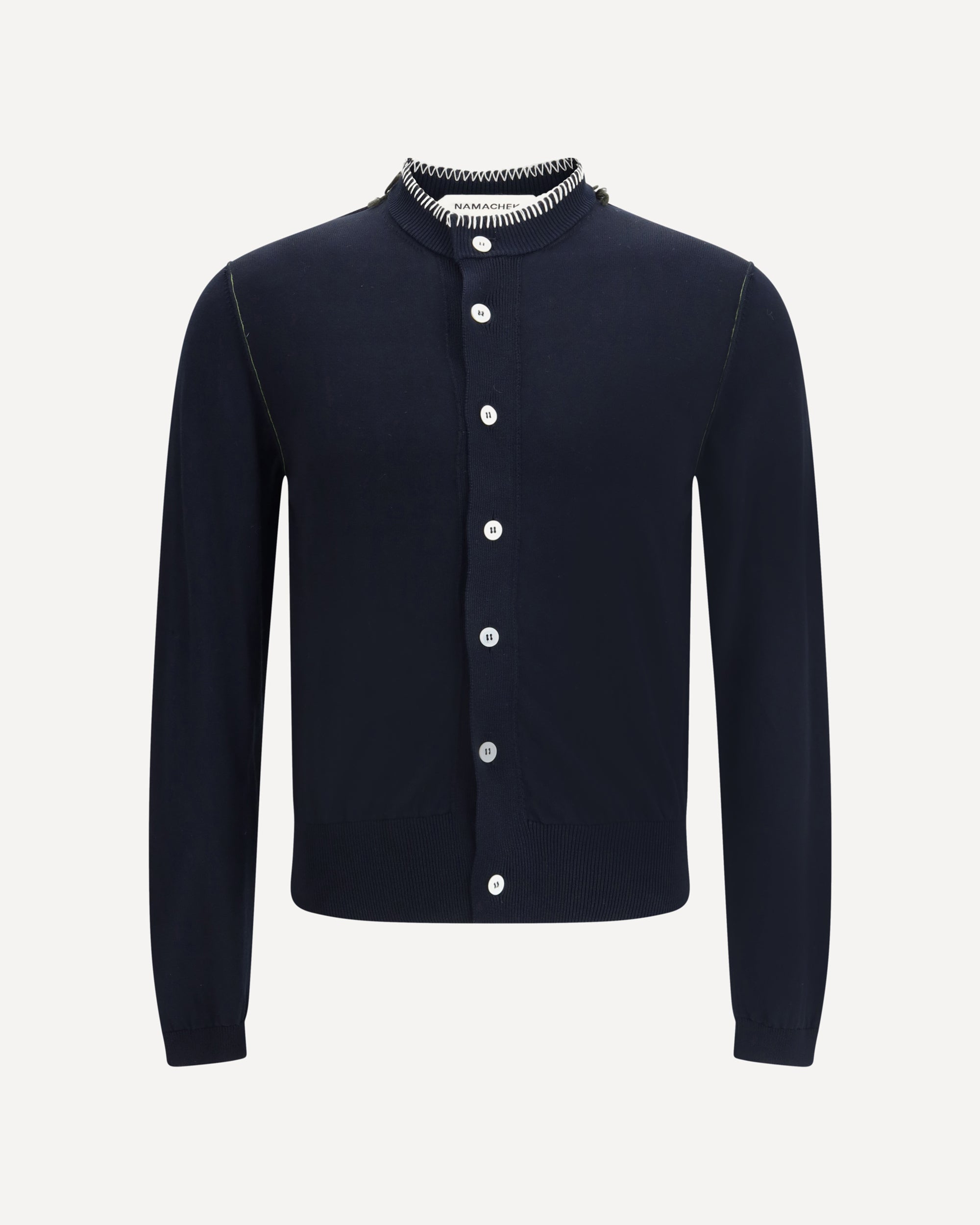Namacheko's cotton Cardigan reinterprets a wardrobe classic with refined details and a modern aesthetic. Featuring a front button closure, it features a ribbed crew neck embellished with contrast stitching that enhances its construction. Ribbed cuffs and hem complete the design for a clean, structured finish. An essential garment with attention to detail.