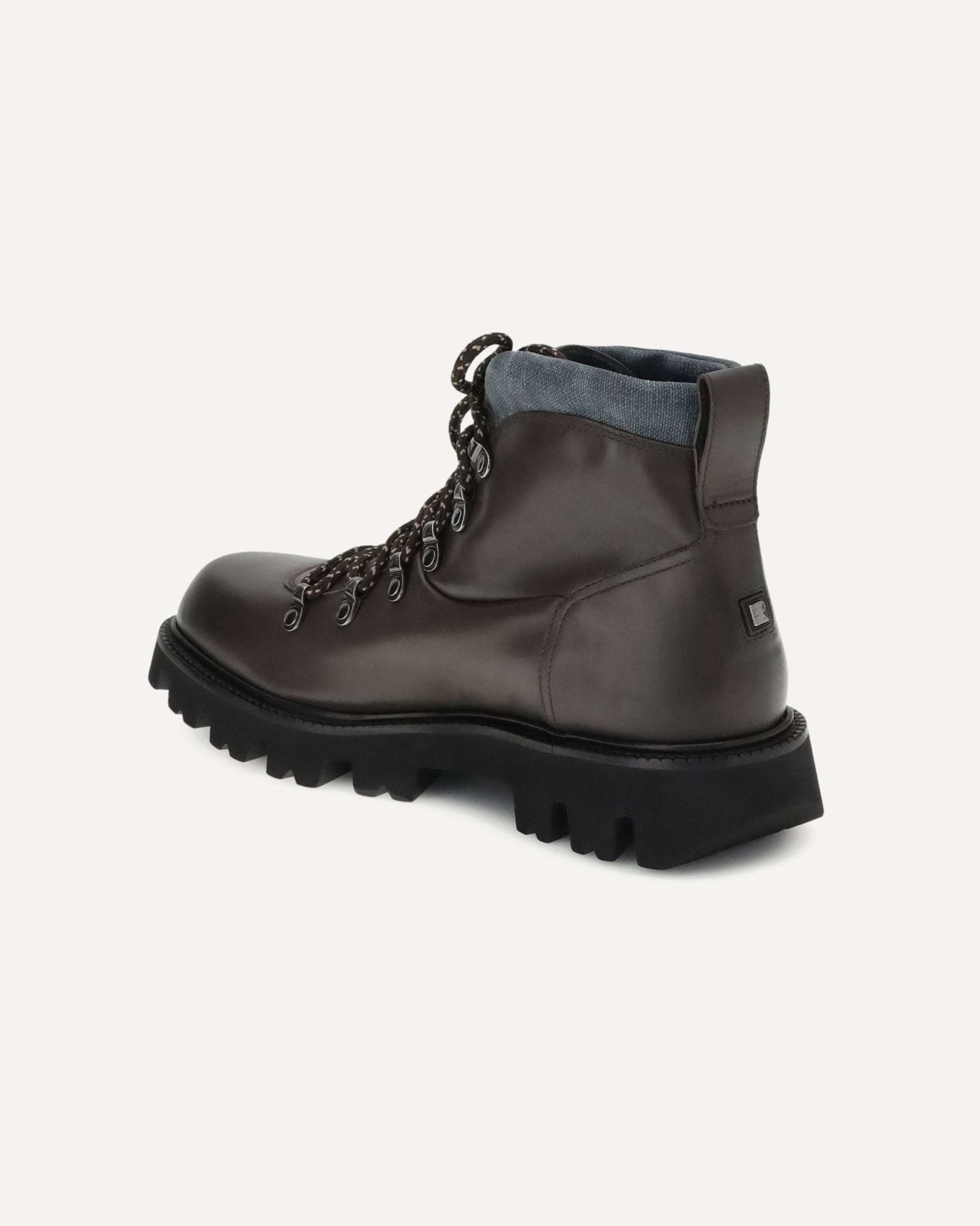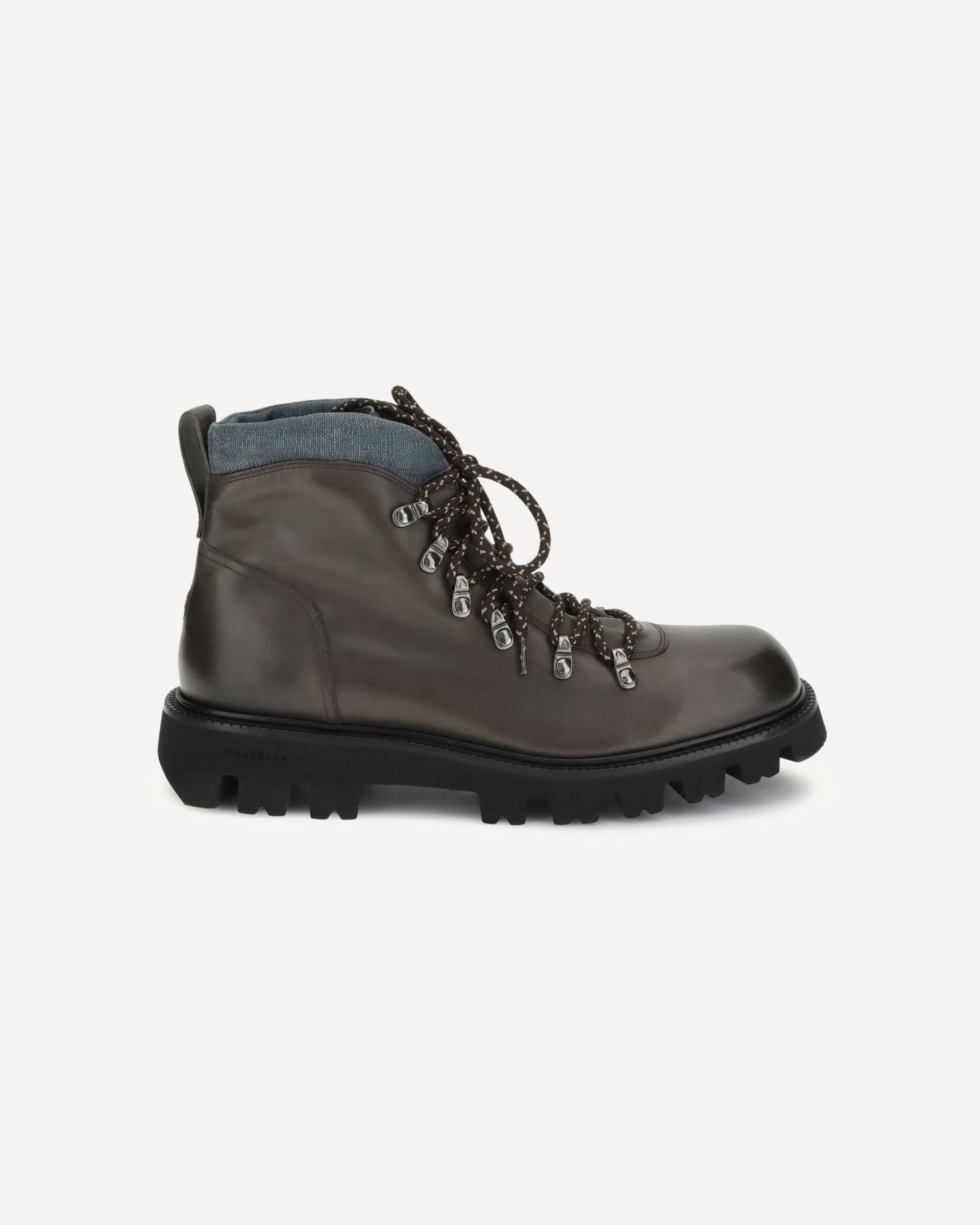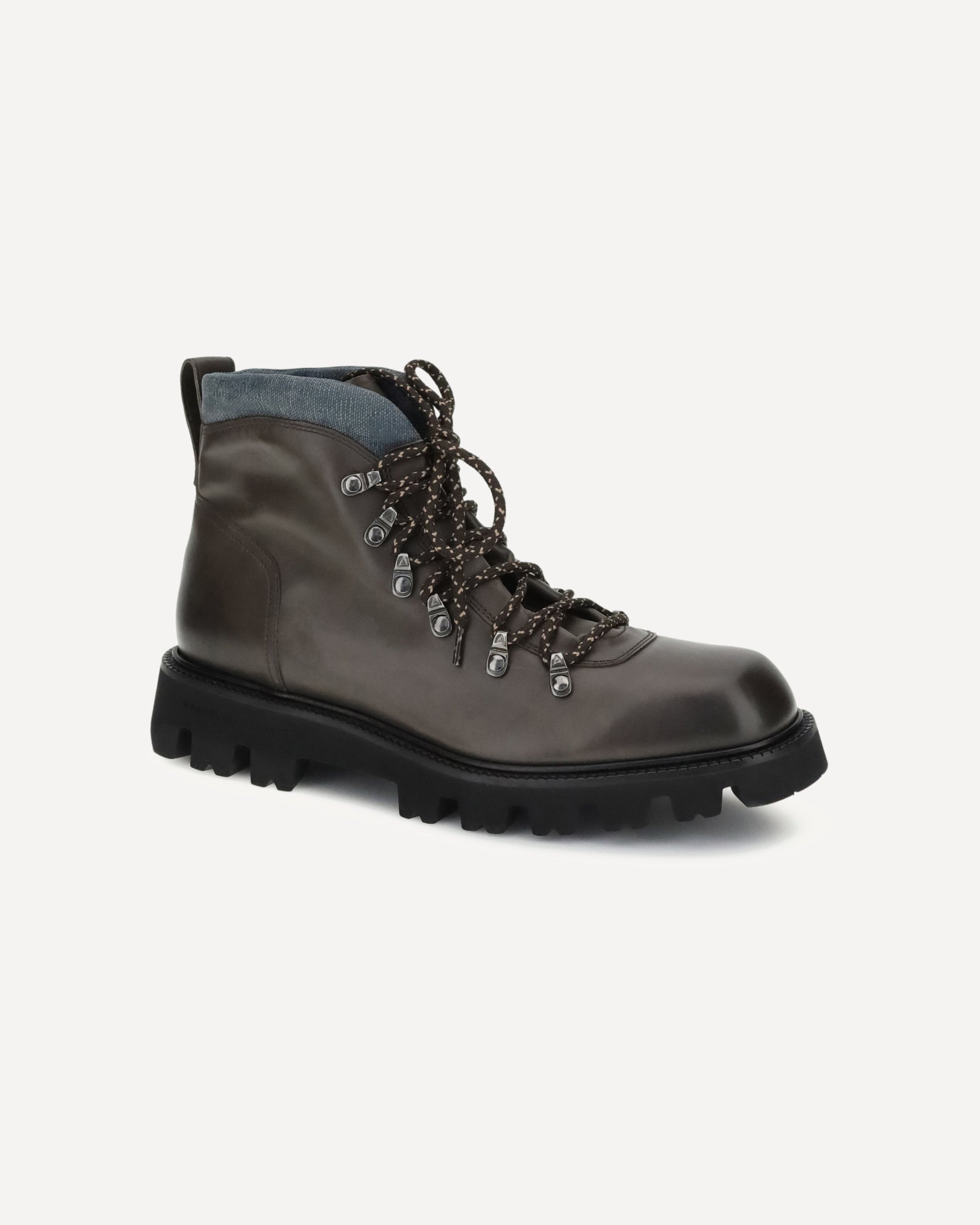 The Lace-Up Ankle Boot by Fratelli Rossetti combines sartorial elegance with the informal spirit of mountain footwear. Crafted from smooth leather with a squared shape, it features a lug sole with extra-light rubber tread, ensuring lightness, flexibility, and durability against the elements.