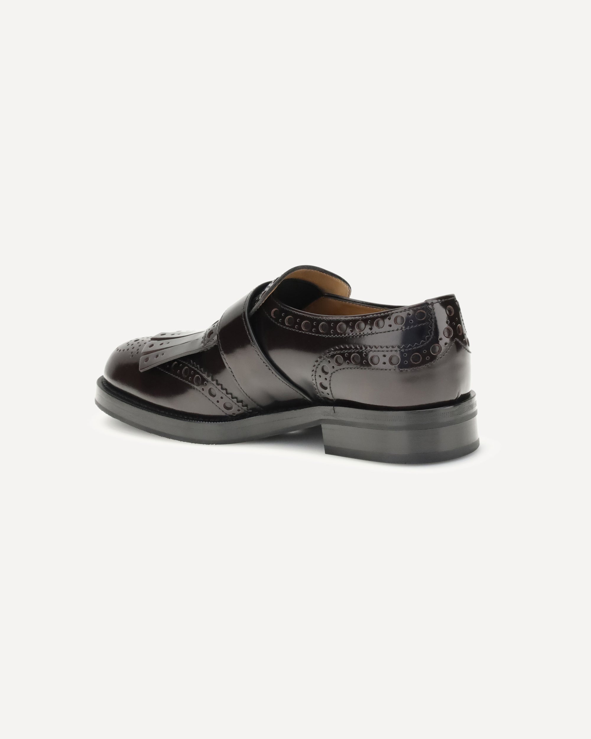 Church's buckle Monk Strap Laced Shoes combine traditional craftsmanship and distinctive style. Made of fine patent leather, they feature a silver-colored buckle and decorative fringe that lends character to the design. The slightly raised toe adds a classic touch, while the inner lining ensures comfort and maximum durability. The model is complemented by archival details, such as the vintage Church's label on the lining, the insole with aged effect and printed logo, and the historical logo stamped on the sole.