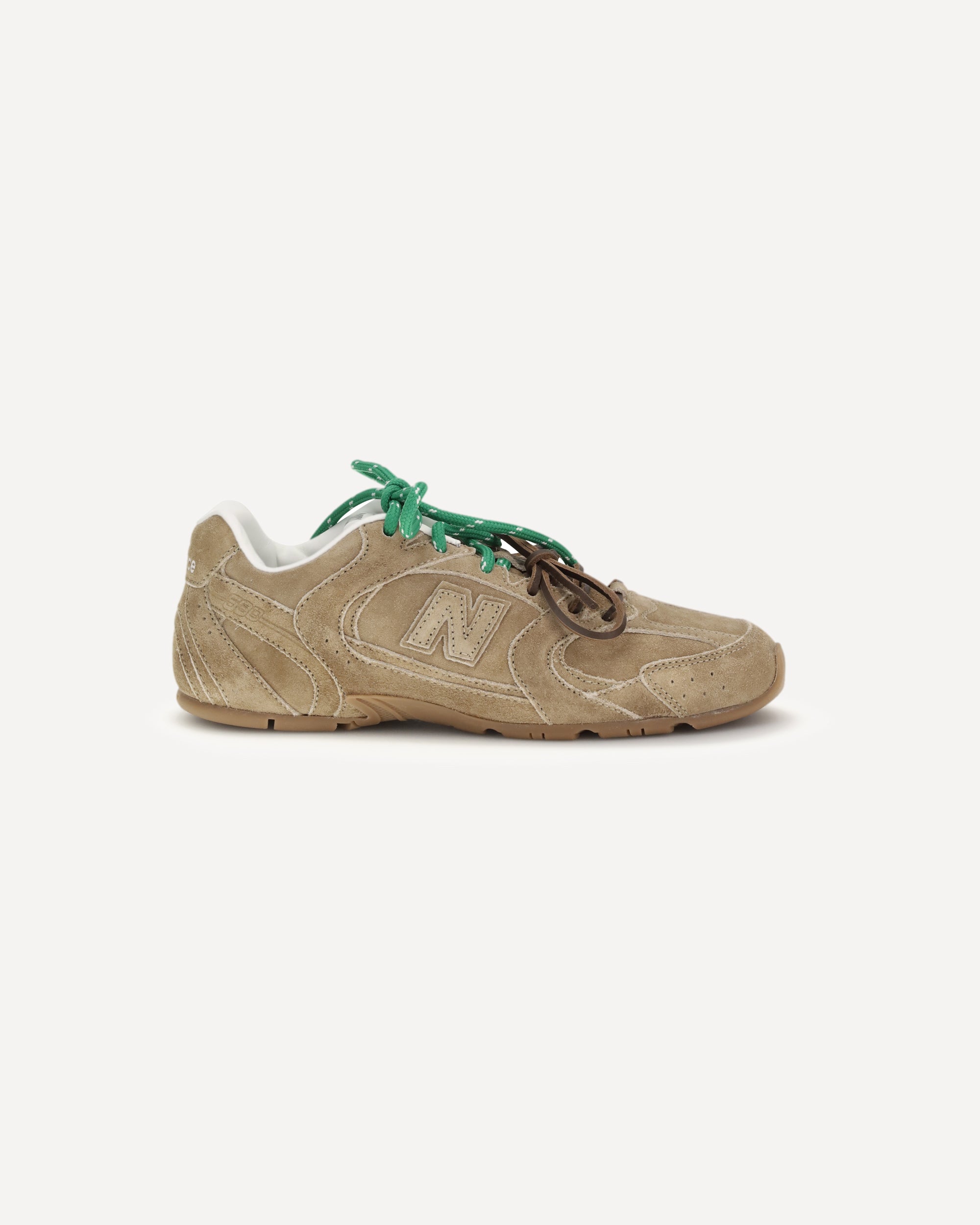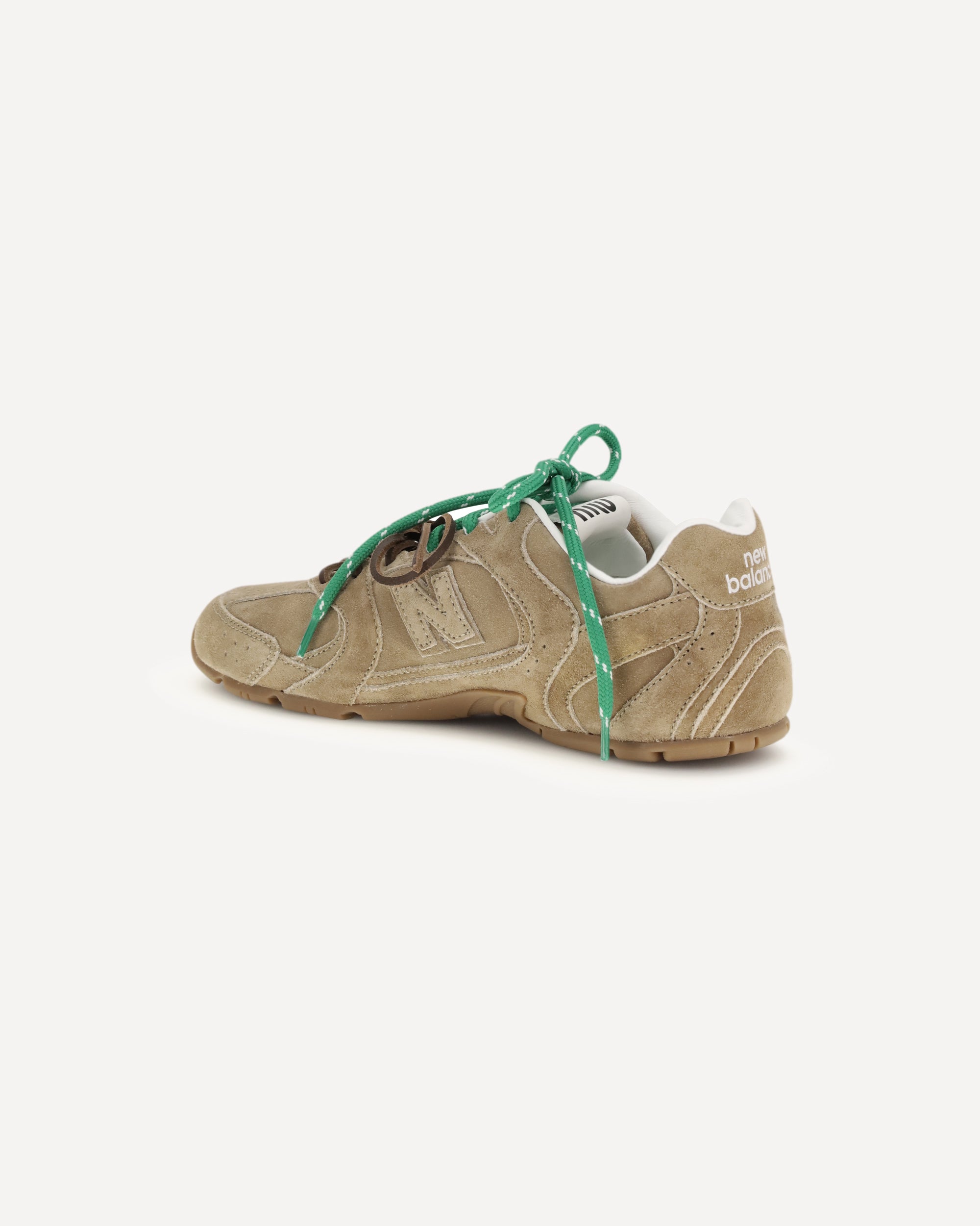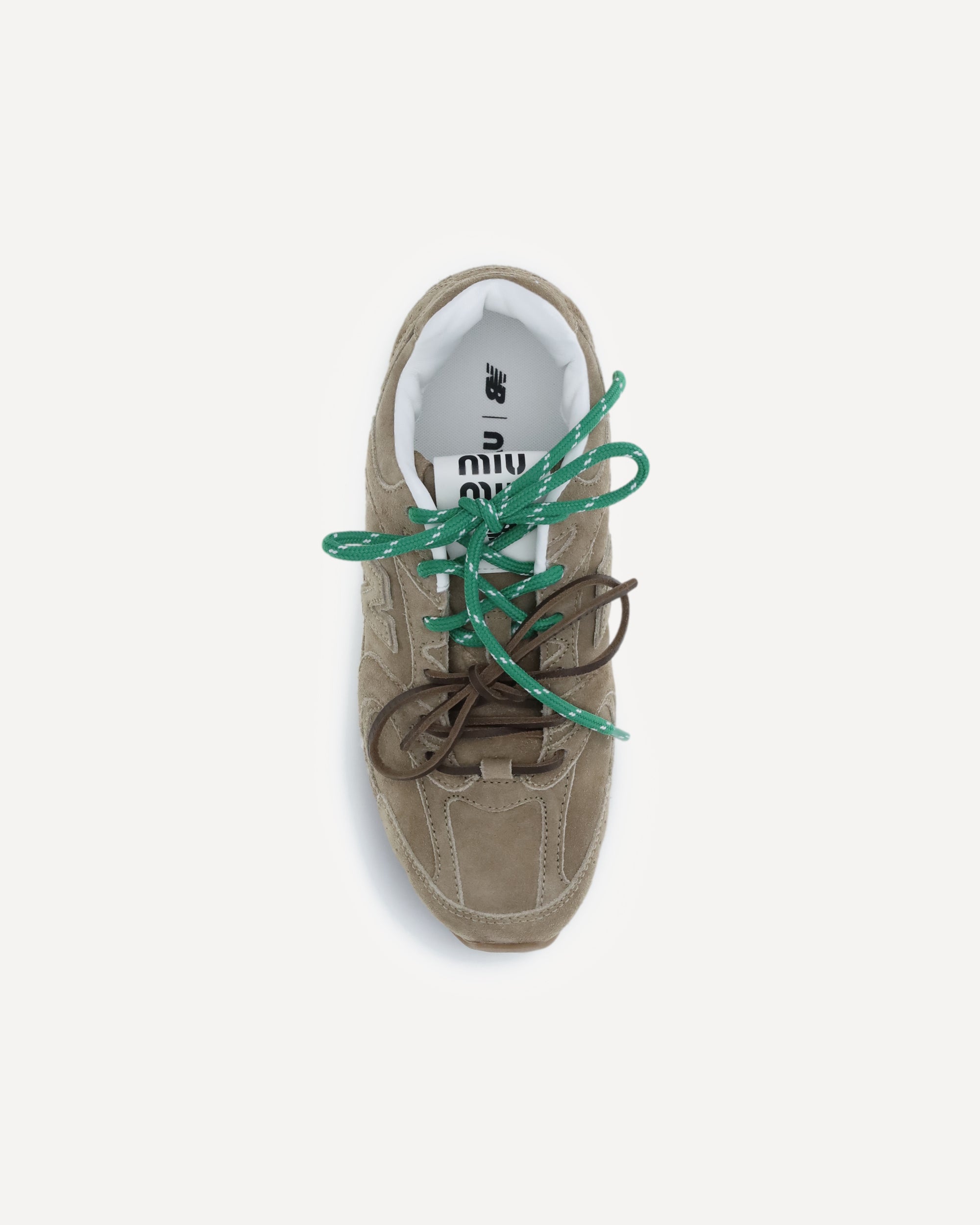 The New Balance X Miu Miu 530 SL Sneakers by Miu Miu reinterpret a sporty classic with refined detailing, featuring an upper enriched with suede leather inserts and a soft textile lining. The design is finished with a screen-printed logo on the tongue and insole, flat laces, and a rubber sole with a geometric tread for enhanced grip. The removable textile-covered insole ensures added comfort and practicality, completing a sneaker with a contemporary and distinctive aesthetic.