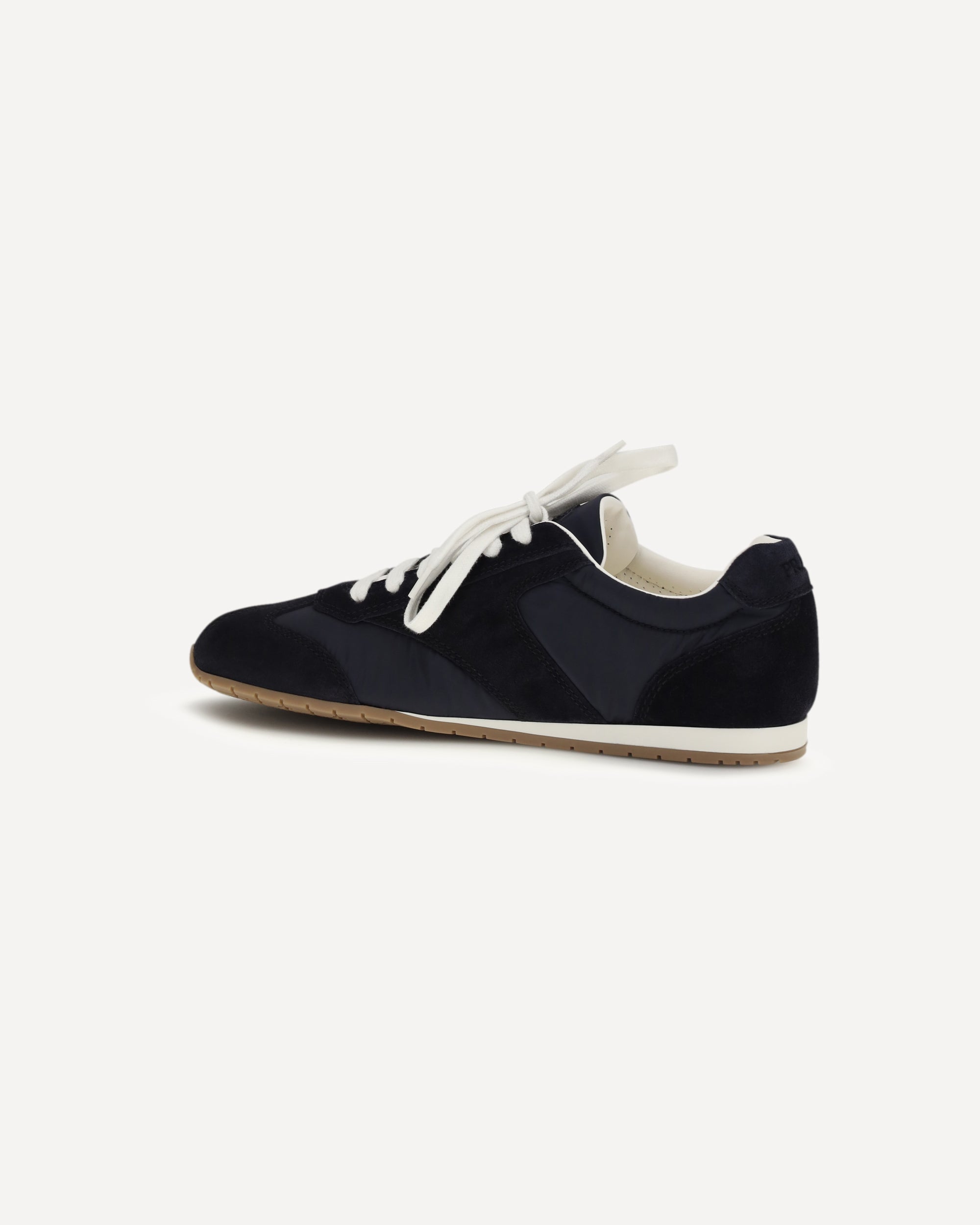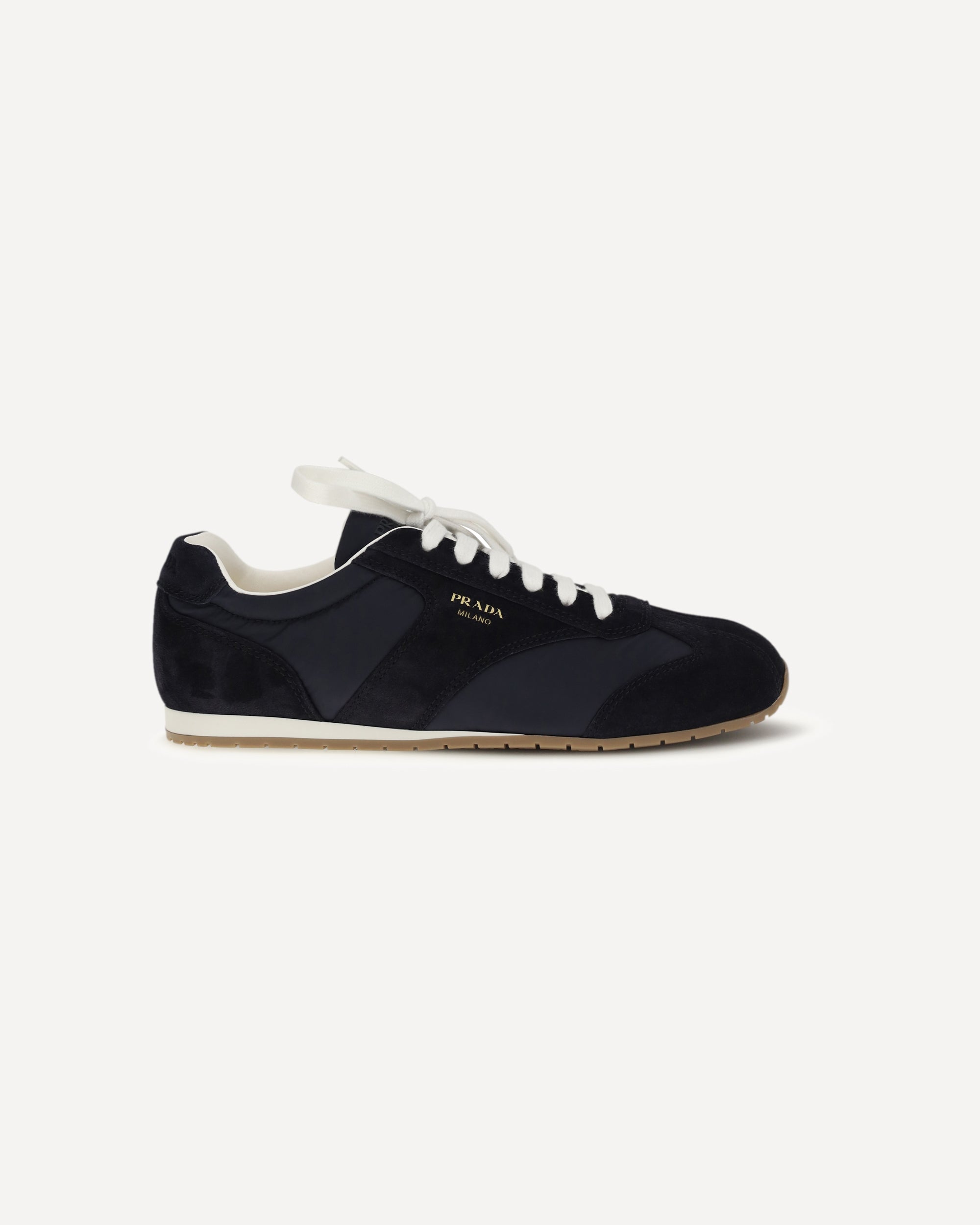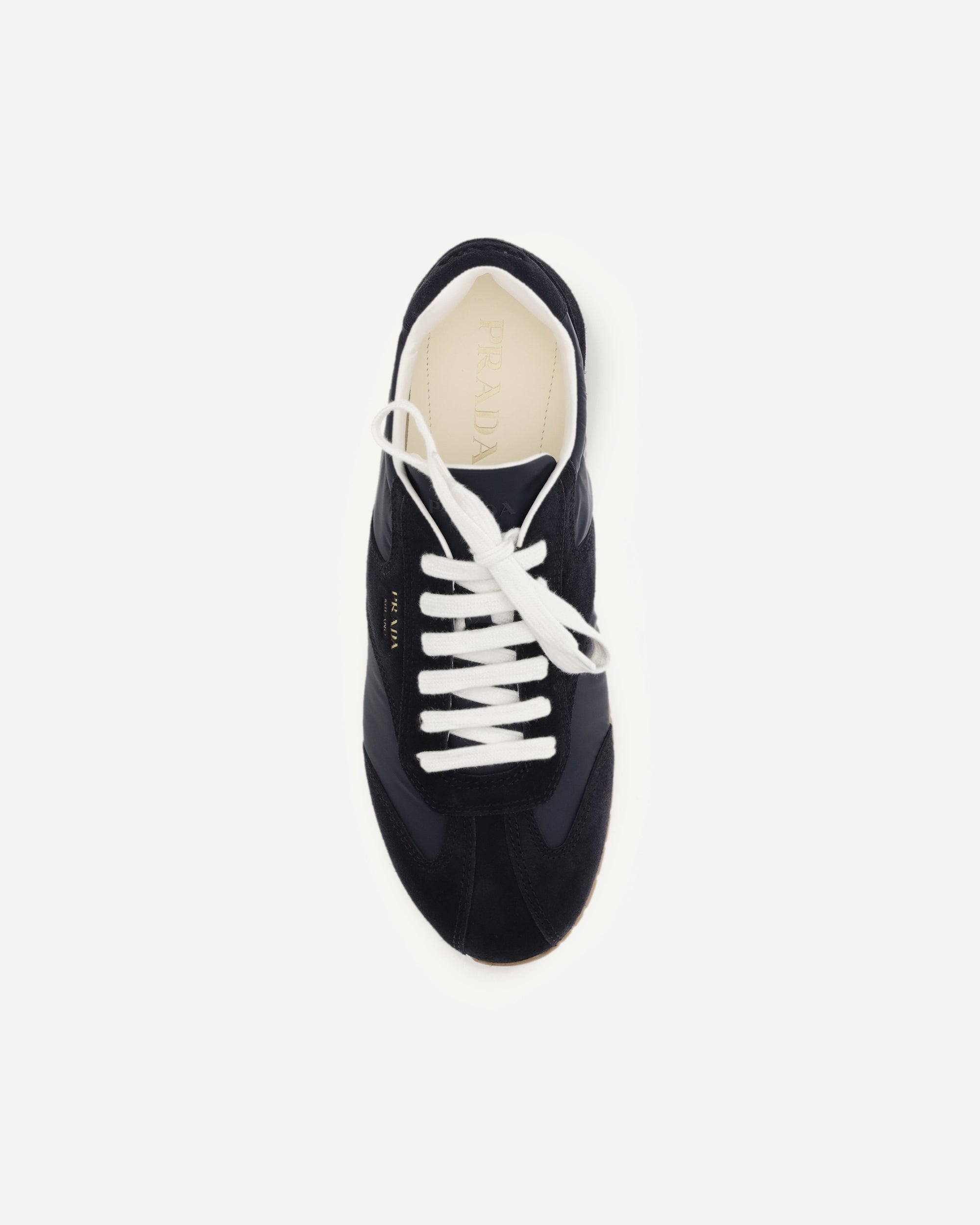 The two-tone suede and fabric Sneakers by Prada combine comfort and style in a modern and refined design. Made from suede and fabric, these sneakers feature a printed logo on the heel and a laminated logo on the side, a distinctive detail that enhances their look. The lace-up closure ensures a secure fit, while the padded ankle provides extra comfort. The embossed logo on the tongue and the printed logo on the inside complete the design, making these sneakers a real must-have for those looking for a mix of elegance and practicality.