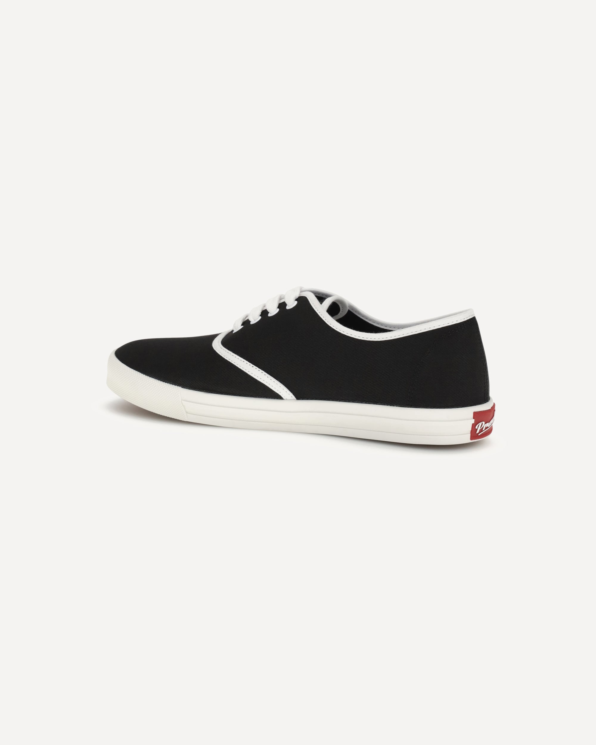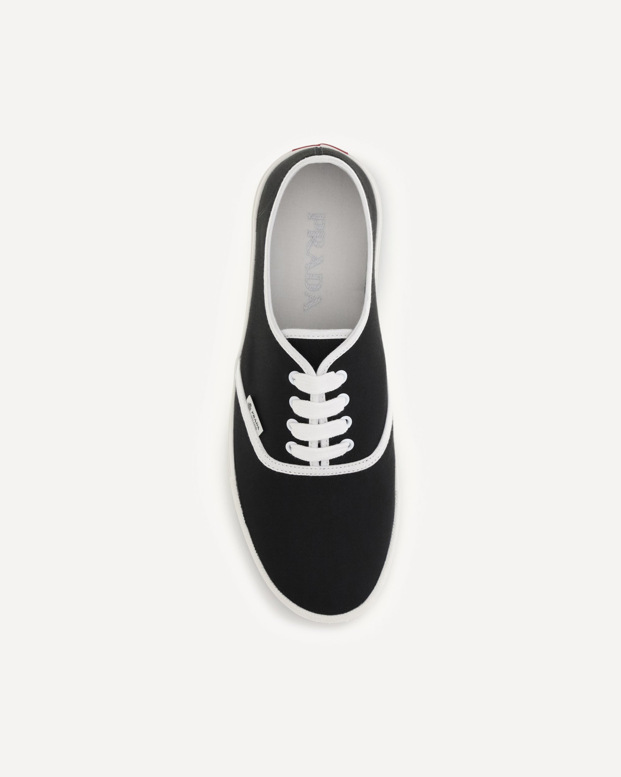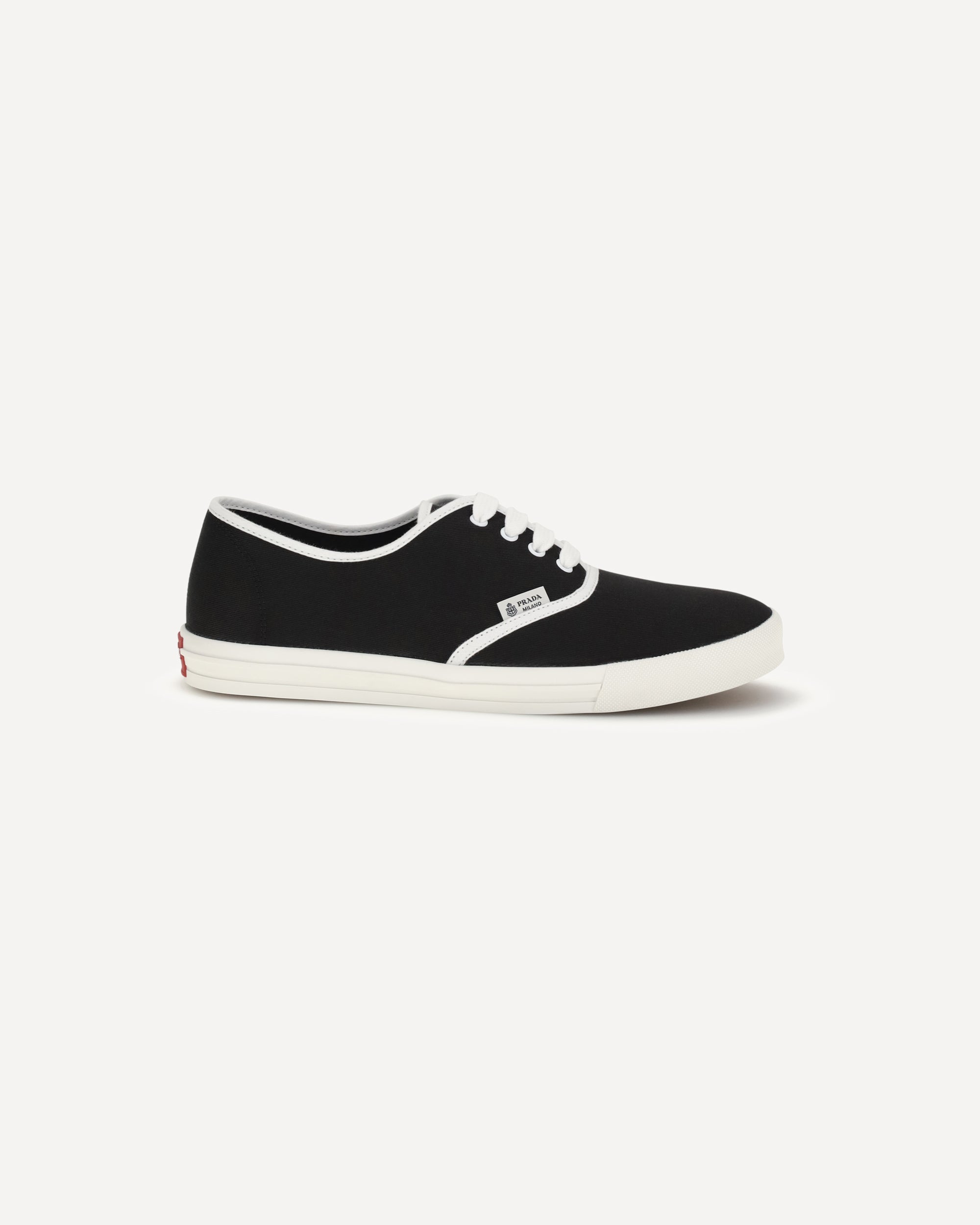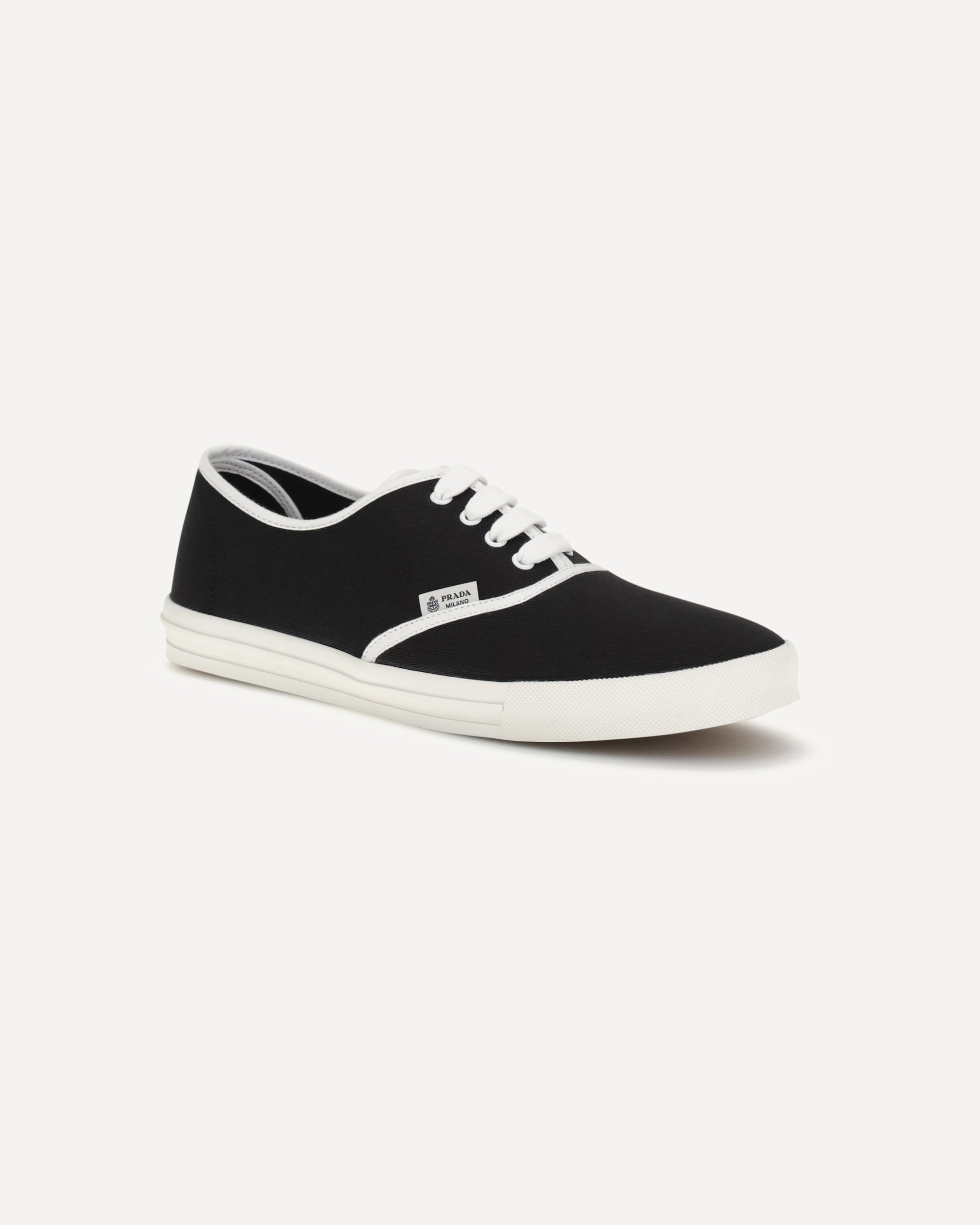 The drill Sneakers by Prada reinterpret a classic sporty look with an urban twist, blending retro influences and contemporary aesthetics. Crafted from lightweight cotton drill with clean lines, the logo on the fabric label showcases tradition and style. Metal loops and cotton laces ensure a comfortable fit. A rubber box sole and non-removable insole complete the model, making it perfect for sophisticated and distinctive casual looks.