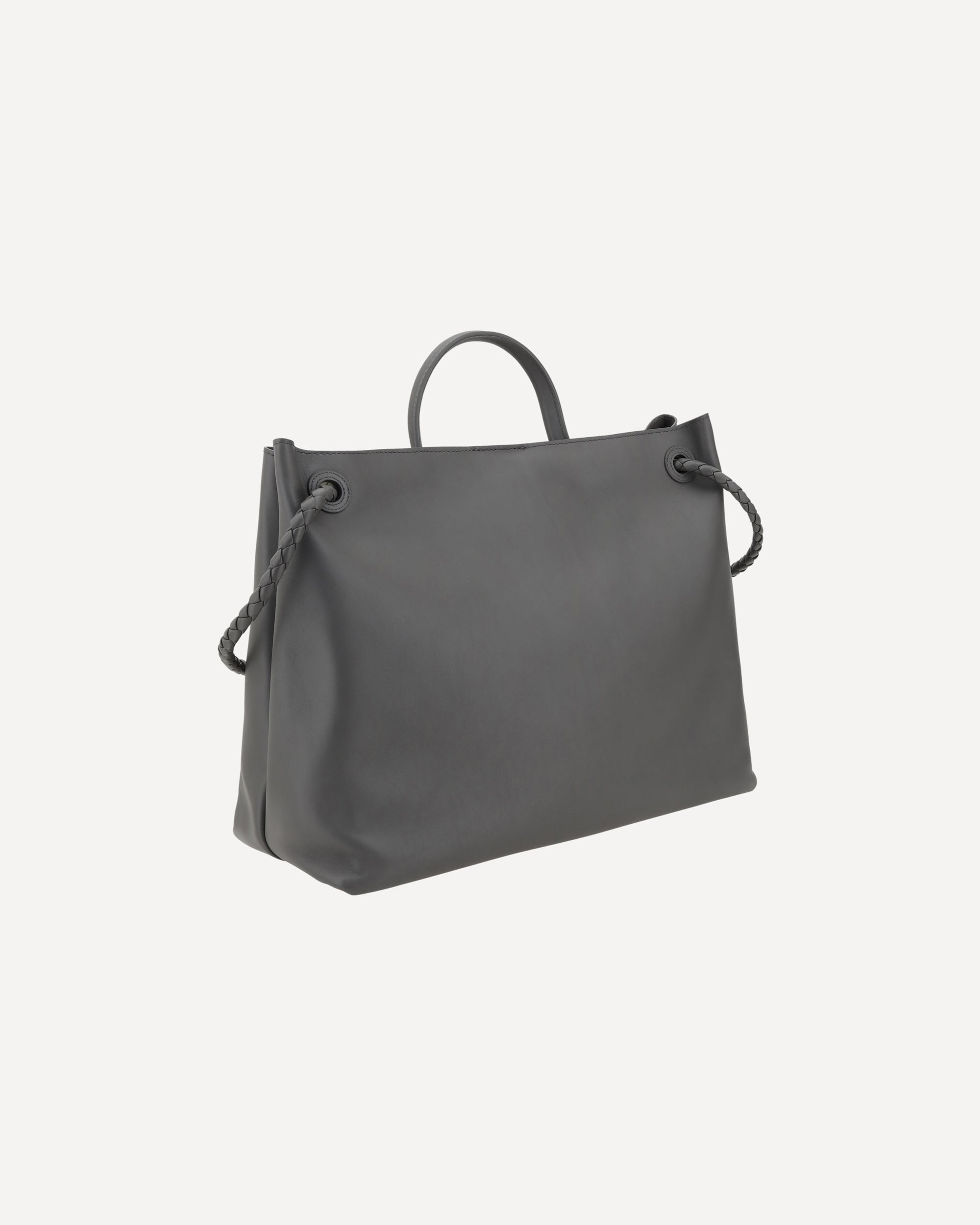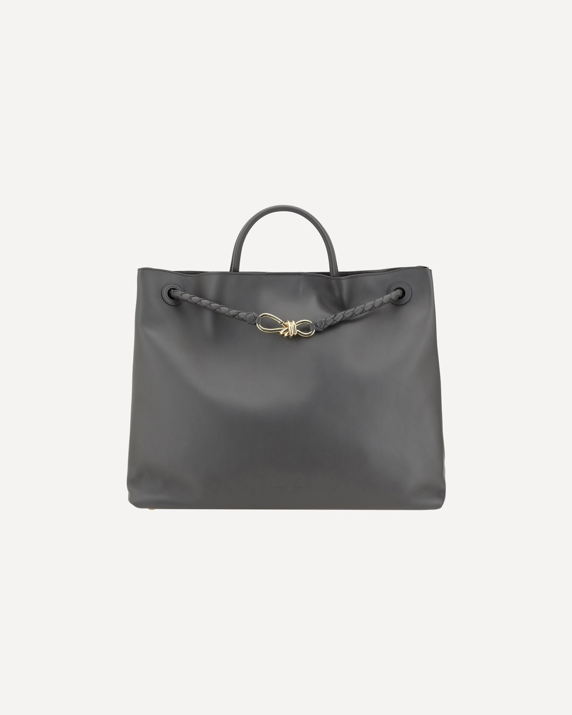 The Andiamo large leather Shoulder Bag by Bottega Veneta features a single tubular rigid handle and a braided sliding shoulder strap, embellished with the iconic knotted Muse detail. The top closure is secured by a magnetic flap, while the interior is organized with dual compartments and an interior welt pocket for added convenience. A sophisticated and functional accessory that combines elegance and distinctive design.