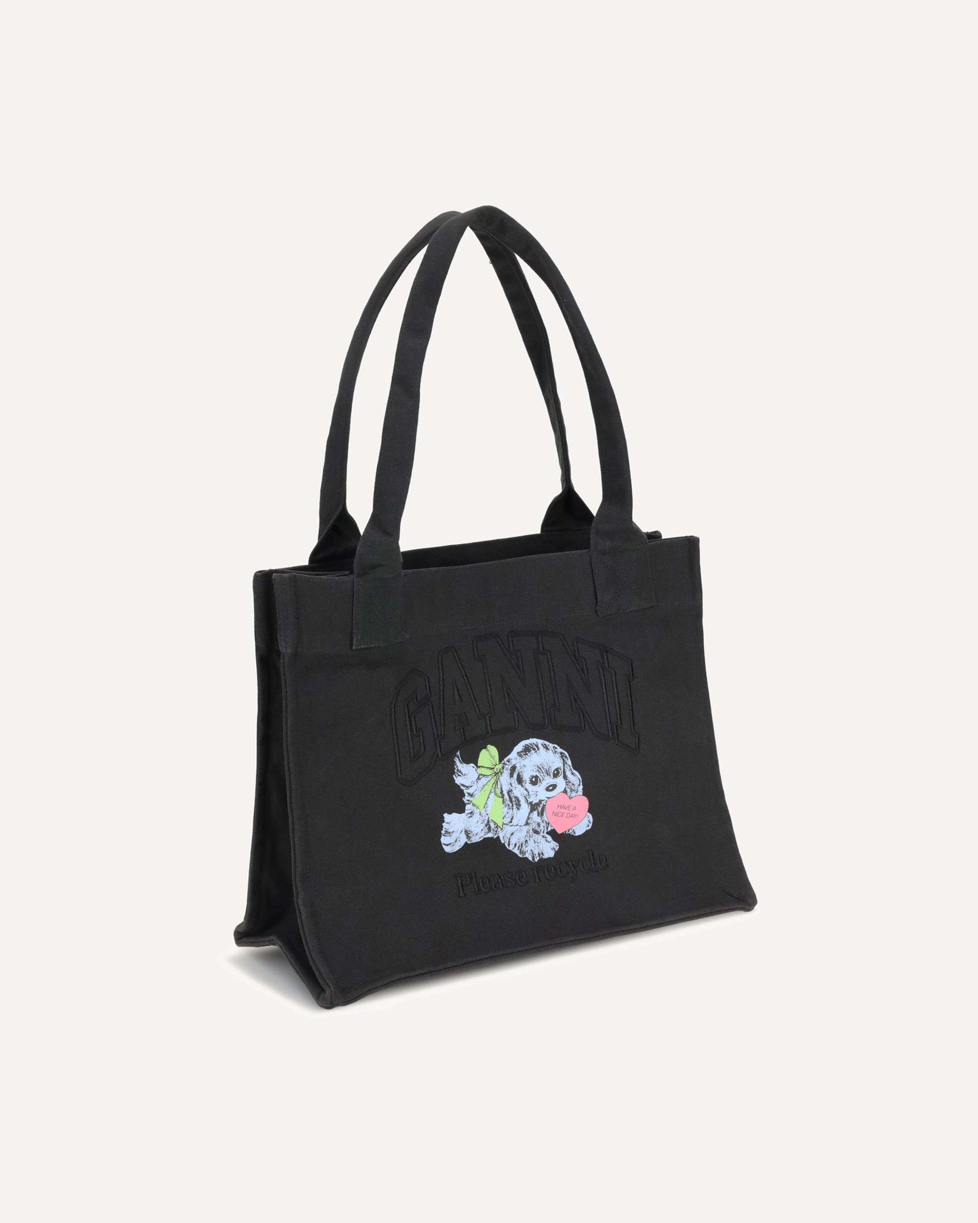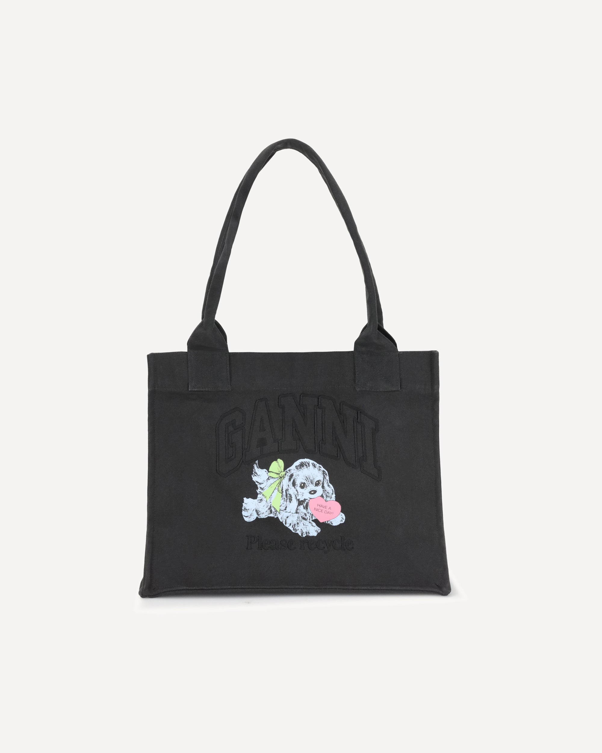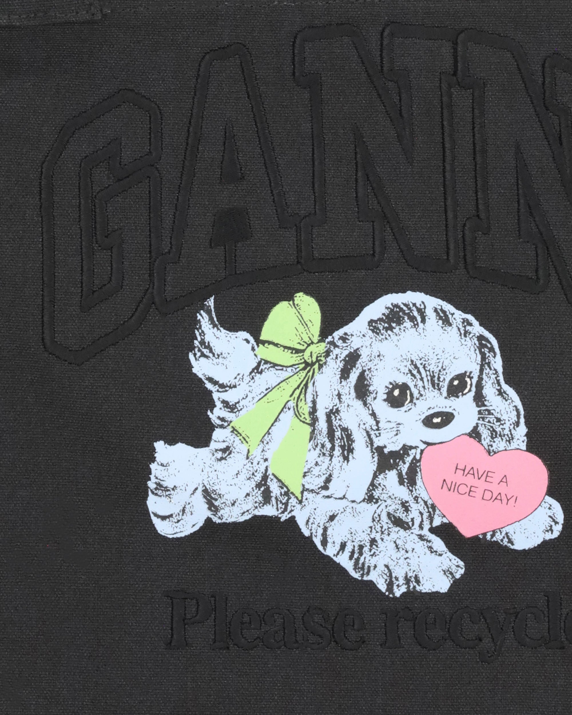 Ganni's Puppy Tote Bag is a fun and roomy accessory perfect for everyday use. Featuring graphics with adorable puppies, it features top handles for convenient carrying. The embroidered GANNI logo adds a distinctive touch, while the interior offers a spacious compartment and a zippered pocket to keep essentials tidy at all times.