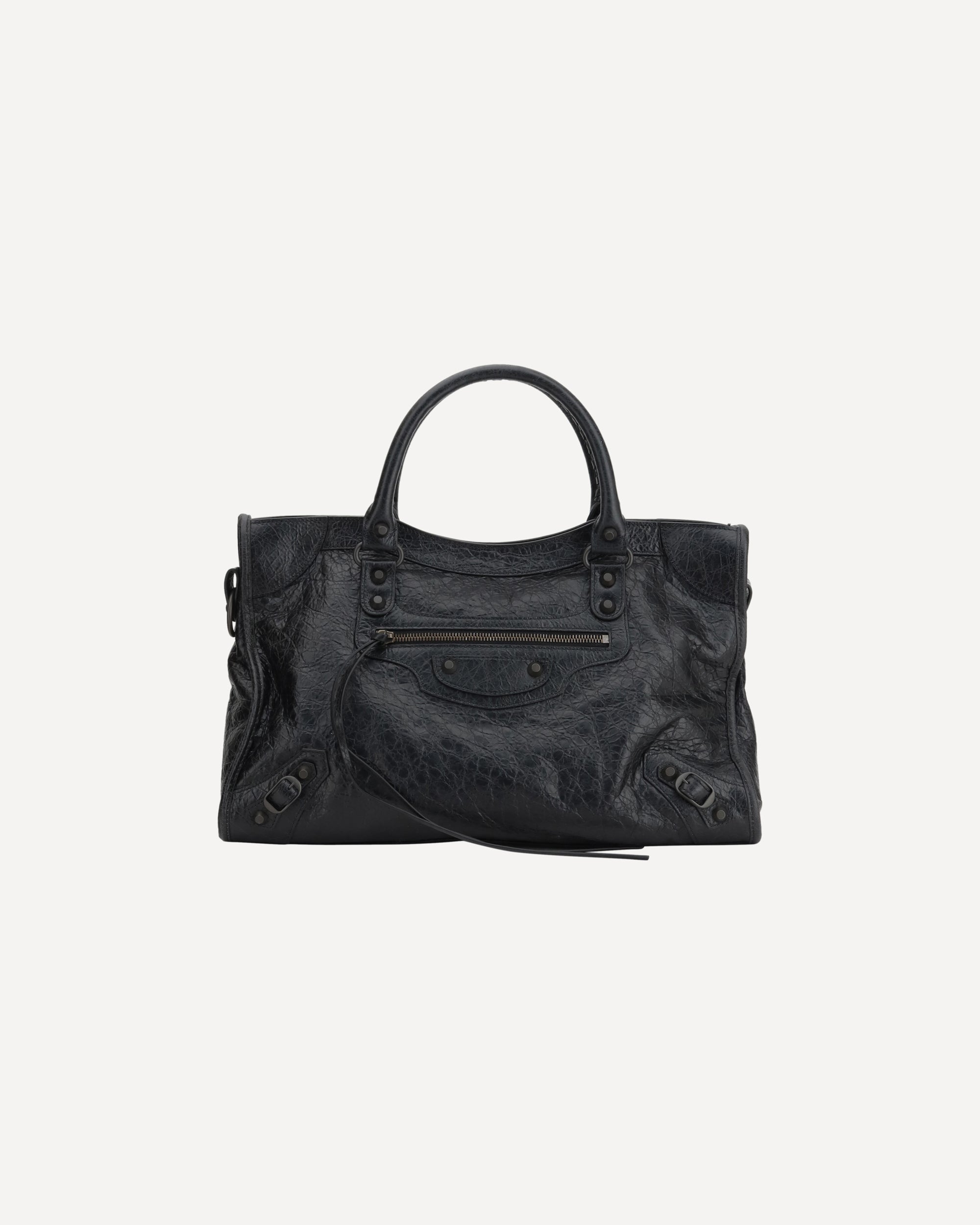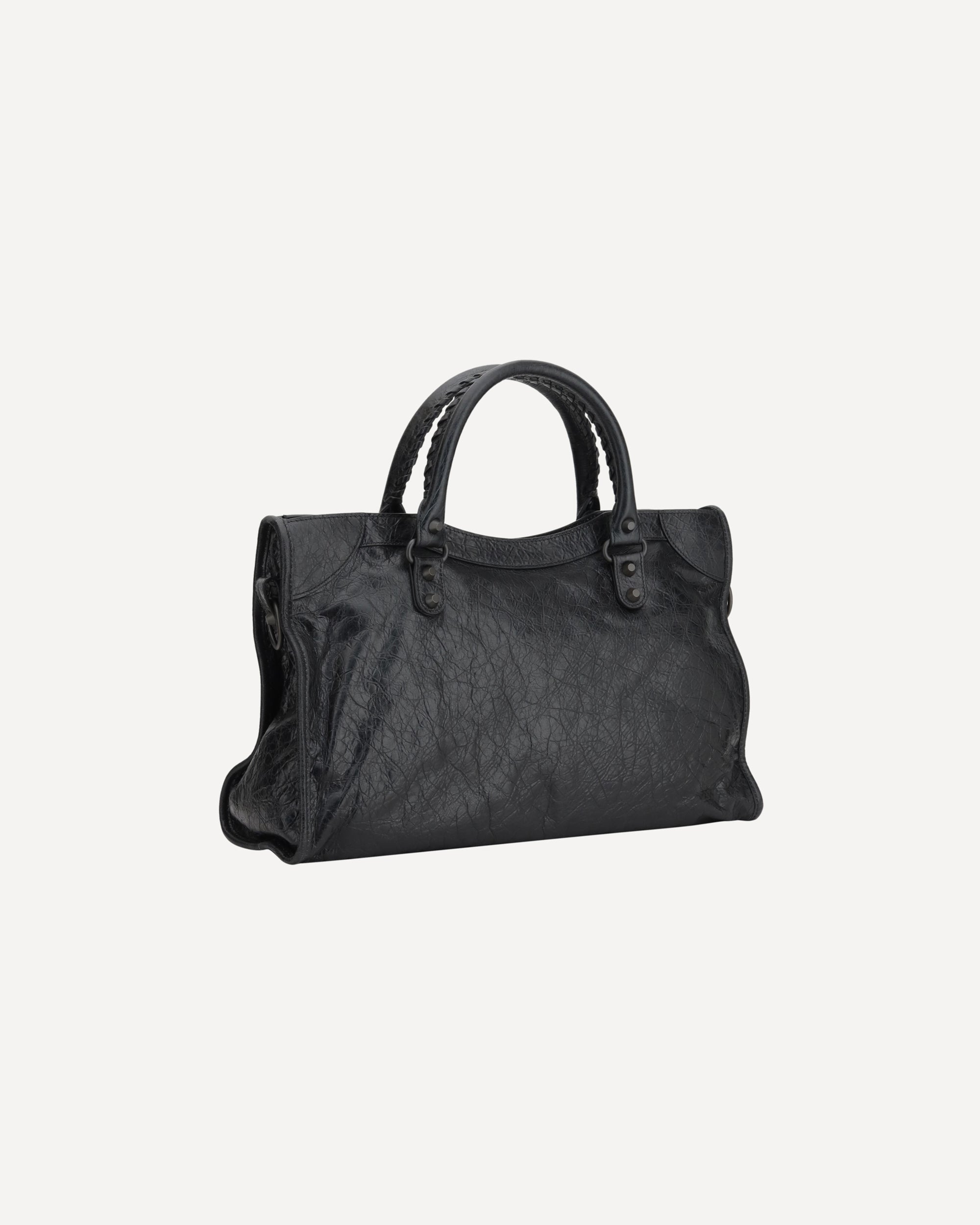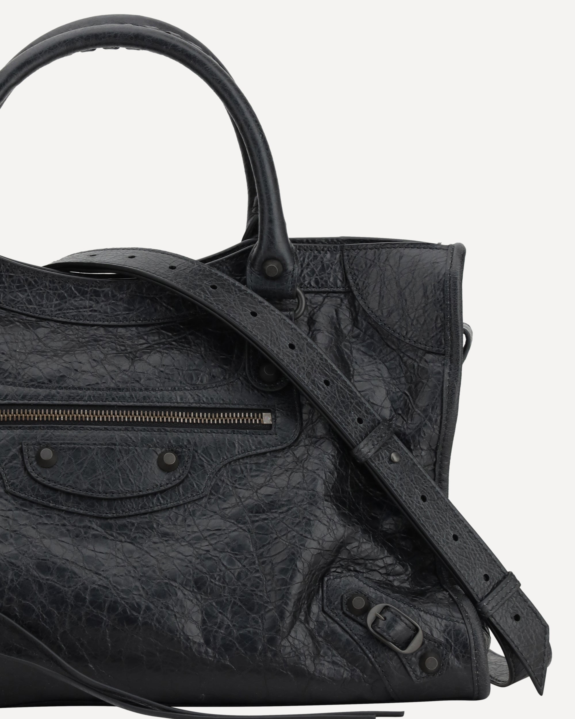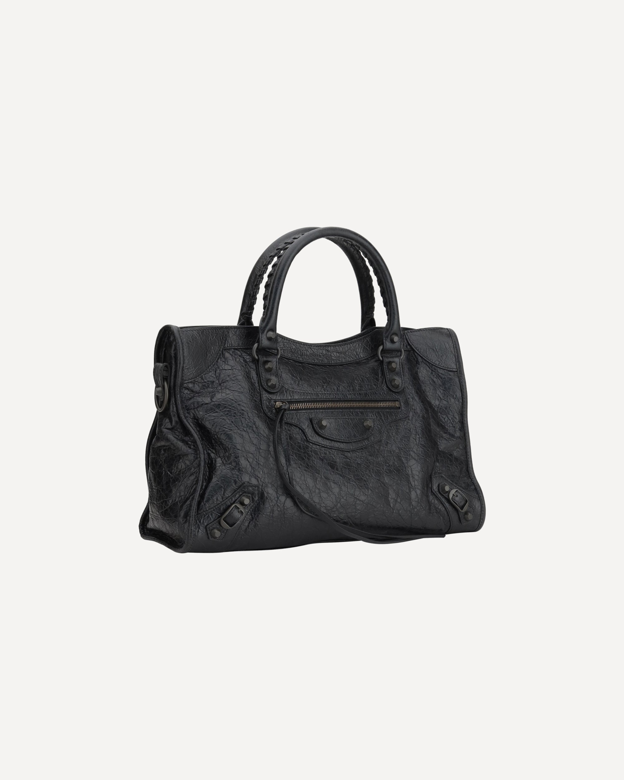 The Le City medium Shoulder Bag by Balenciaga is a high-class item made of fine lambskin leather that combines elegance and functionality. The two hand-woven leather handles lend an artisanal and refined touch, while the adjustable and removable shoulder strap allows it to be worn with versatility, either by hand or on the shoulder. The zippered closure and knotted leather zipper pull add distinctive details, while the front zippered pocket offers convenience for quick access to essentials. Inside, a zippered pocket and cotton canvas lining provide organization and durability. Brass trim completes the look, making this bag a luxurious accessory.